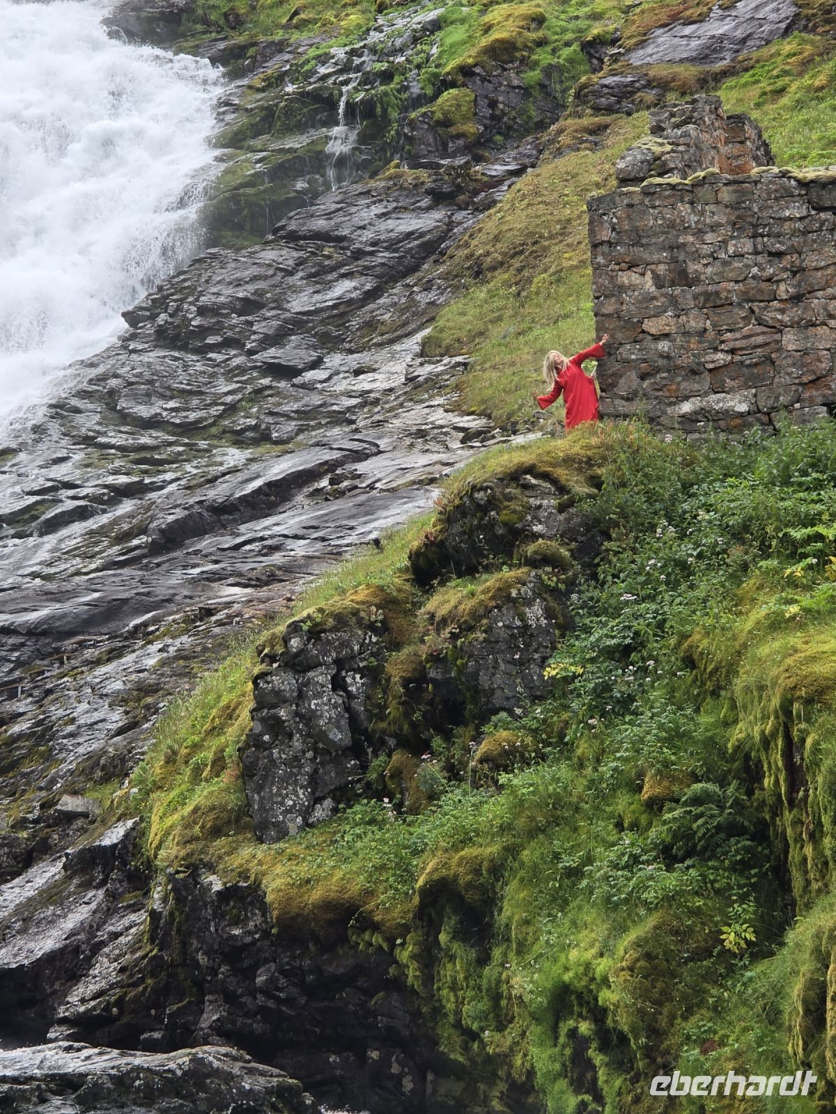 Die zweite Gruppe wird durch mich begleitet und wir folgen dem Norwegischen Tourismusslogan "Norway in der Nut Shell", das ganze Norwegen auf engstem Raum erleben. Bei all dem was wir bisher schon von Norwegen gesehen haben, halten wir diesen Slogan für etwas übertrieben, aber der Sognefjord und die darum liegenden Fjells mit dem Schiff und den Bergbahnen zu besuchen, ist für Touristen die einen kurzen Stopp in Bergen mit dem Kreuzfahrtschiff machen eine einmalige Gelegenheit. Auch wir wollen diese Gelegenheit nutzen und fahren erst mit dem Zug zu dem Bergdorf Myrdal, steigen dann in die historische Flambahn ein und fahren die ganze Strecke bis Flam durch das herrliche Bergpanorama, vorbei an Bergseen und Wasserfällen. Erst windet sich die Bahn über Spiralen und Tunnel in die Höhe bis wir am Wasserfall Kjosvossen einen kurzen Stopp machen. Hier werden wir überrascht von mystischer Musik, einer rot gekleideten Fee, hoch oben am Wasserfall, die federleicht tanzend, uns in ihren Bann zieht. Verwundert schauen wir zu wie sie an der einen Stelle verschwindet und plötzlich weit entfernt an einer anderen Stelle wieder auftaucht. Wir wissen nicht ob uns hier das Märchen "Hase und Igel" gespielt wird aber auf alle Fälle ist es schön anzuschauen.