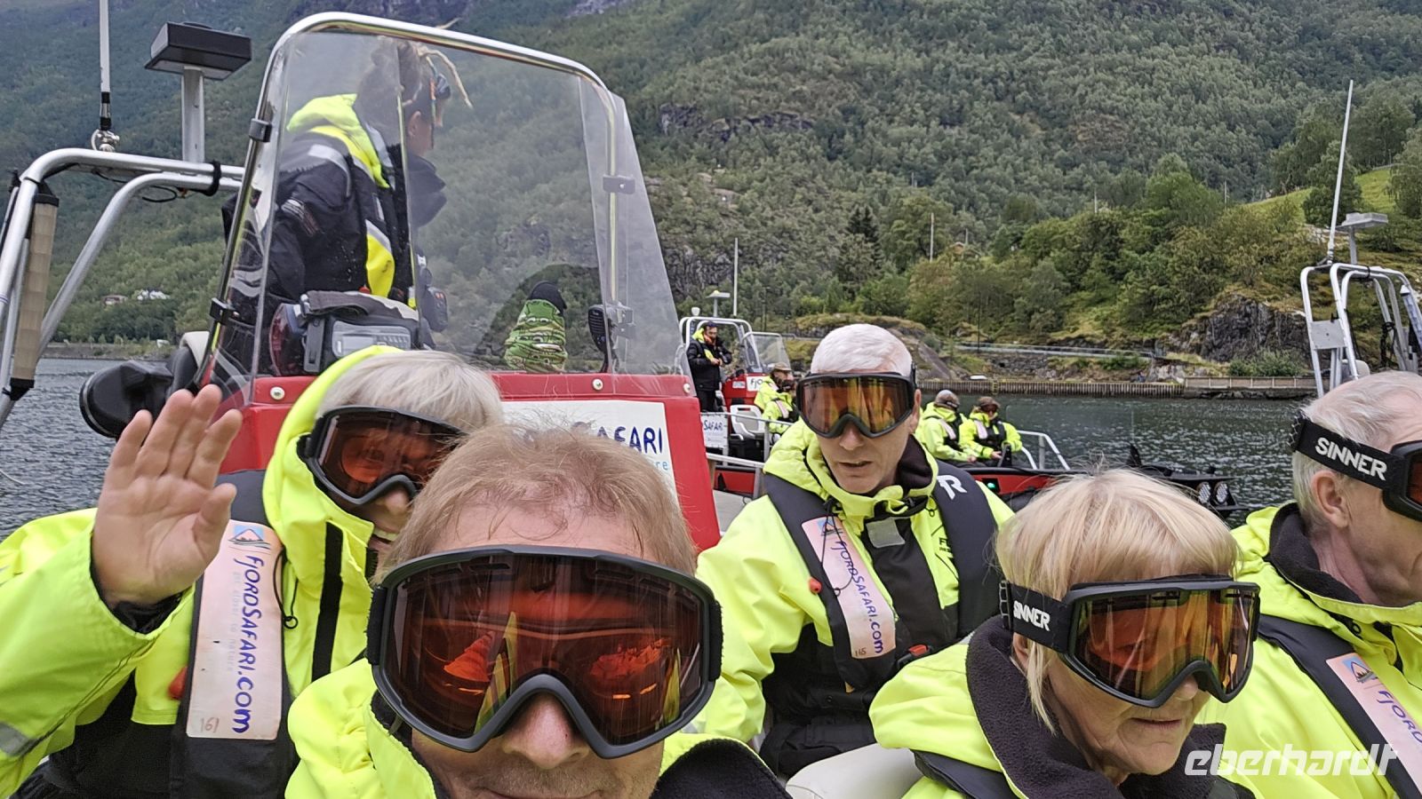 Wieder zurück unten in Flam, verbringt jeder die Mittagszeit nach eigenem Geschmack und wir treffen uns kurz vor 15 Uhr wieder an der Einkleidestation für die Speedboots. Nachdem wir das Fjord zuvor von oben betrachtet haben, wollen wir nun einen intensiven Blick unten, auf dem Wasser, in die vielen Buchten des Fjords haben. Ausgerüstet mit Schutzanzügen und Skimasken rasen wir mit über 50 Stundenkilometer über das Fjord, besuchen kleine Fischerdörfer, Wasserfälle die in weitem Bogen in das Fjord fallen und informativ kommentiert durch unsere Skipperin die das Boot mit sicherer Hand 45 Kilometer über das Fjord kleiden lässt. Wir kommen eineinhalb Stunden nicht aus dem Staunen heraus die Geschwindigkeit und der Blick zu den aufsteigenden Felsen ist phänomenal.