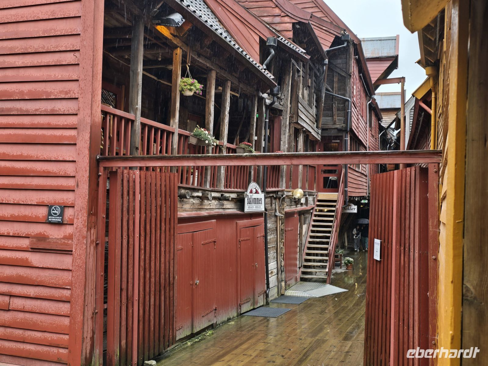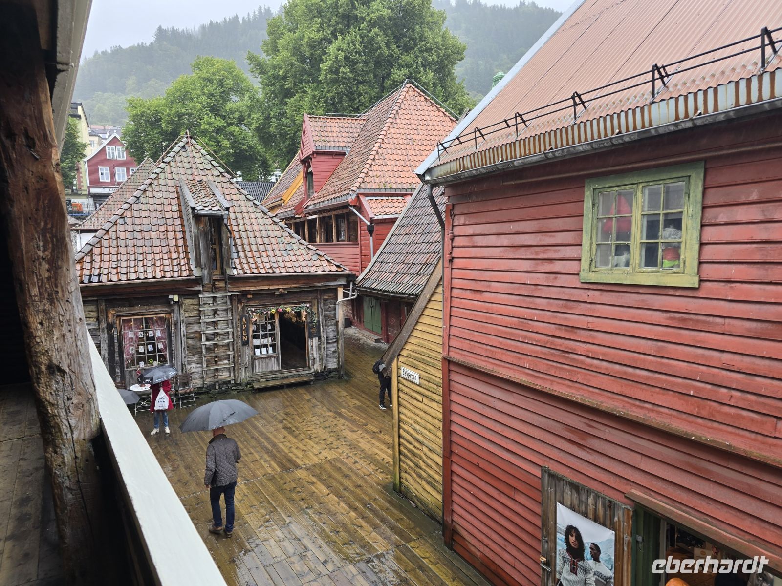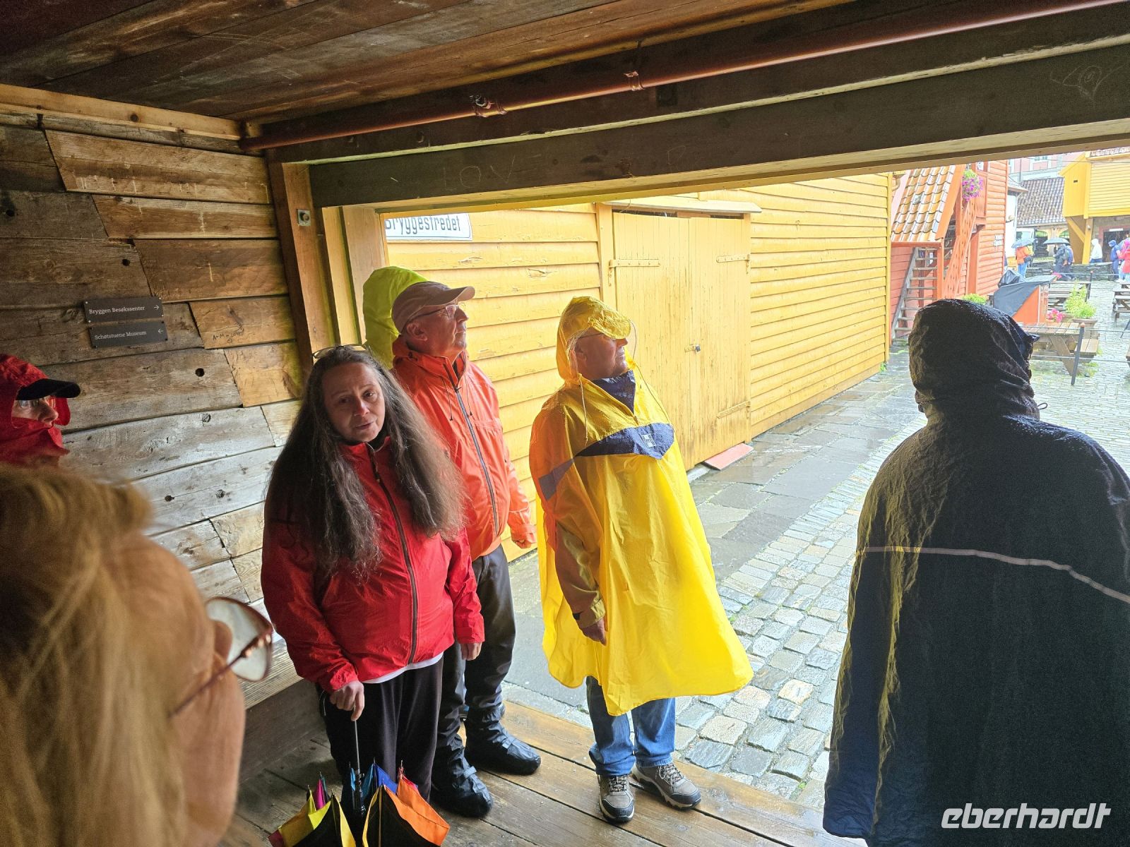 Einen ausgiebigen Besuch machen wir auch der ehemaligen Hansestadt Byggen im Zentrum von Bergen. Hier können wir geschützt vom Regen, in den eng zusammen gebauten Holzhäusern, der Lagerhallen und Wohnräume der ehemaligen Handelsstadt, die historischen Epochen der Stadtbrände und der Wiedererrichtung dieser Siedlung betrachten. Andrea gibt sich sehr viel Mühe uns bei diesem Wetter bei Laune zu halten, am Ende sind wir weitgehend durchnässt und beschließen direkt ins Hotel zu fahren. Das komfortable Edward Krieg Hotel gibt uns Schutz und Wärme und durch die großen Fenster Fassaden ist der Regen viel entspannter zu betrachten. Wir hoffen, dass wir am nächsten Tag bergen auch mal ohne Regen erleben dürfen.