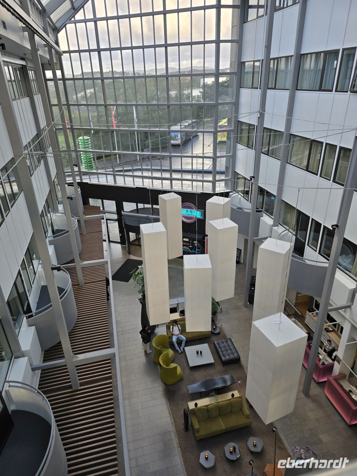 Nach einem kurzen Spaziergang in der Stadt setzen wir unsere Fahrt fort und kommen bald in der Stadt Molde, unserem Übernachtungsort für heute an. Unser Hotel das Skandic Sailet ist eines der Erkennungsmerkmale von Molde, wenn man sich der Stadt vom Meer her nähert. Es hat die Form eines großen Segels das im Wind steht und an einem Segelmast befestigt ist, so steht es stolz direkt am Ufer des Atlantiks. Hier kreuzen zweimal täglich die Hurtigruten Schiffe und legen unweit des Hotels an jeweils zwischen 21 und 22:00 Uhr. Da wir alle unsere Hotelzimmer mit Sicht auf das Meer hatten waren die Hurtigruten Schiffe ein begehrtes Beobachtungsobjekt an diesem Abend.