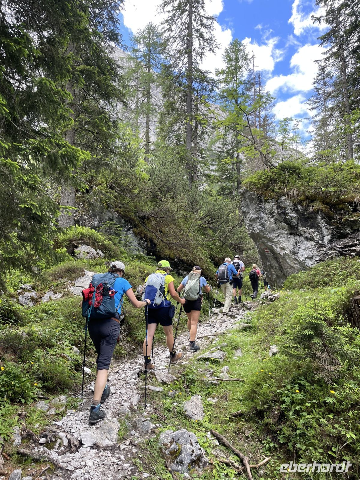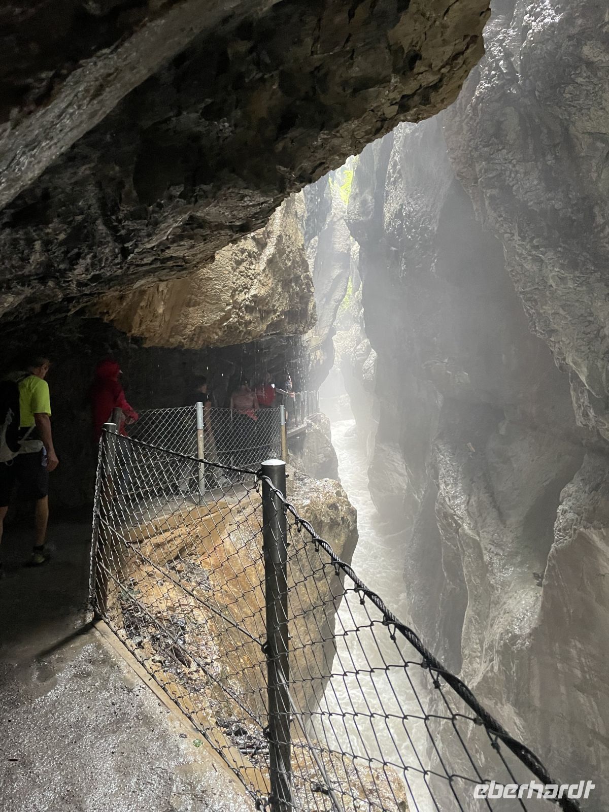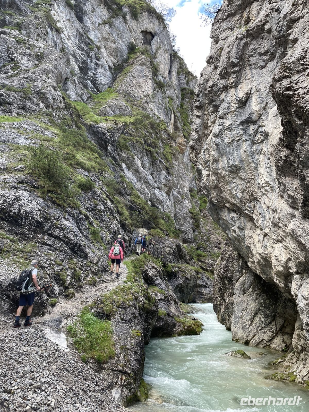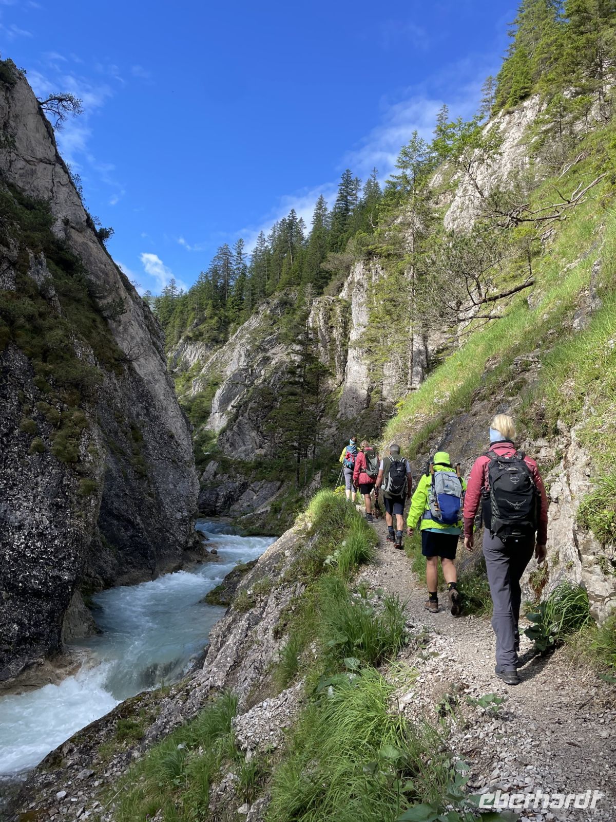 Gut ausgeruht und vorzüglich gefrühstückt, werden wir pünktlich von unseren privaten Taxen abgeholt. Zunächst geht es bis nach Scharnitz, wo wir in ein Taxi steigen, welches die Berechtigung zur Einfahrt ins Tal hat. Vor dem Abstieg in den Klamm-Einstieg gibt es das obligatorische „Morgengebet“ und dann geht es auch schon steil hinab. Doch es ist nur ein kurzes Stück und die nun beginnende Gleirschklamm entschädigt für alles. Es ist ein wunderschöner Weg durch dieses wildromantische Naturschauspiel. Die Sonne und der blaue Himmel tun den Rest – schon fast kitschig, aber eines der Höhepunkte der gesamten Alpenüberquerung.