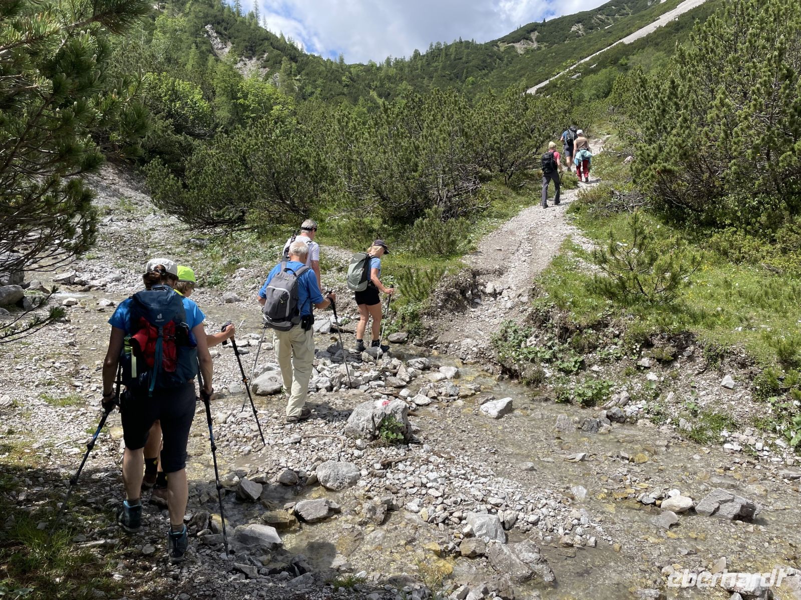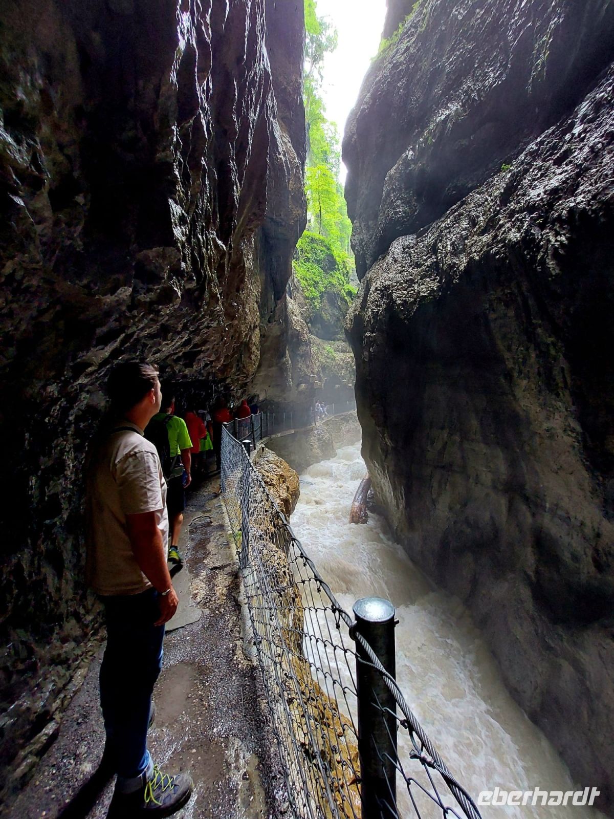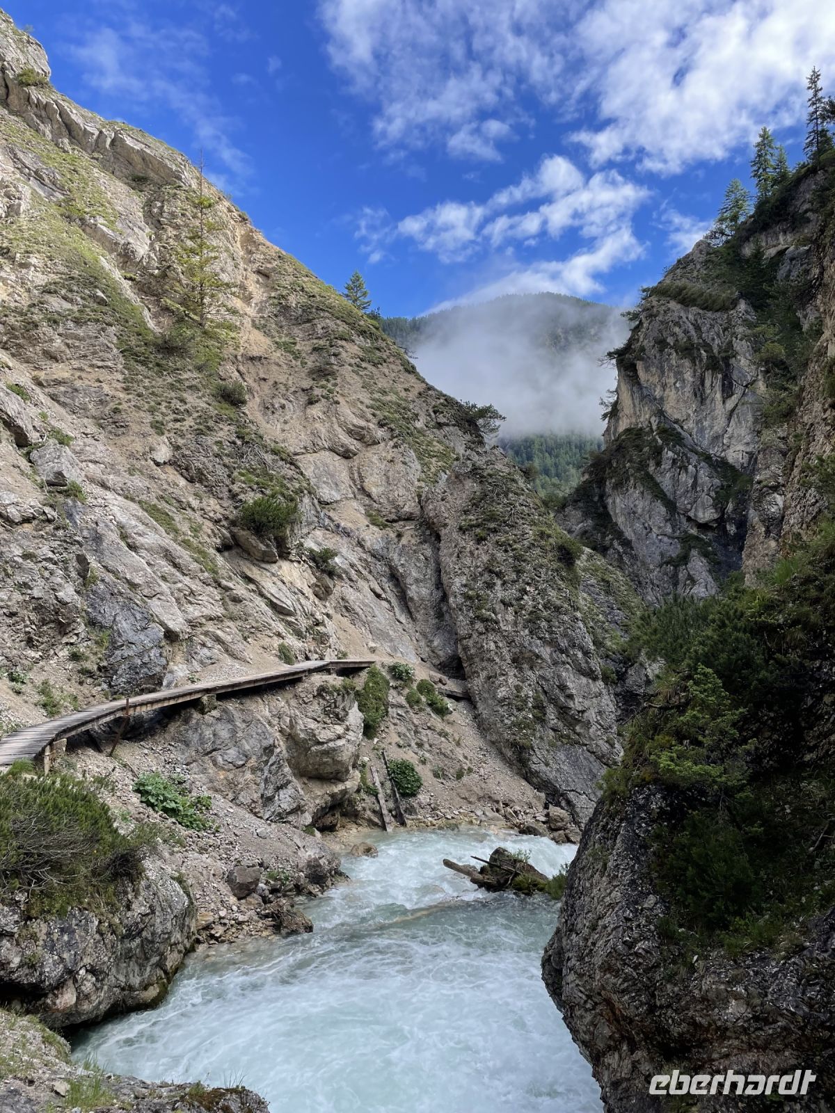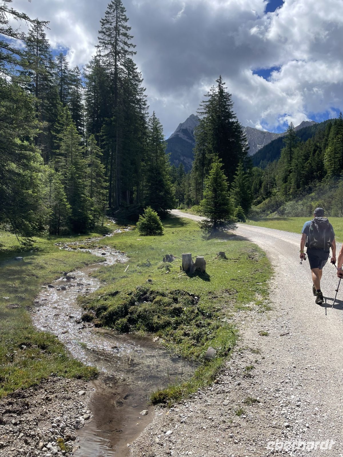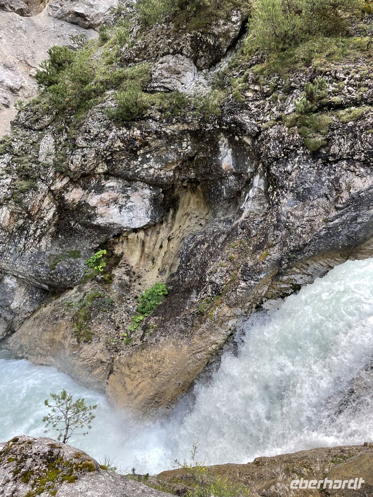 Gut ausgeruht und vorzüglich gefrühstückt, werden wir pünktlich von unseren privaten Taxen abgeholt. Zunächst geht es bis nach Scharnitz, wo wir in ein Taxi steigen, welches die Berechtigung zur Einfahrt ins Tal hat. Vor dem Abstieg in den Klamm-Einstieg gibt es das obligatorische „Morgengebet“ und dann geht es auch schon steil hinab. Doch es ist nur ein kurzes Stück und die nun beginnende Gleirschklamm entschädigt für alles. Es ist ein wunderschöner Weg durch dieses wildromantische Naturschauspiel. Die Sonne und der blaue Himmel tun den Rest – schon fast kitschig, aber eines der Höhepunkte der gesamten Alpenüberquerung.