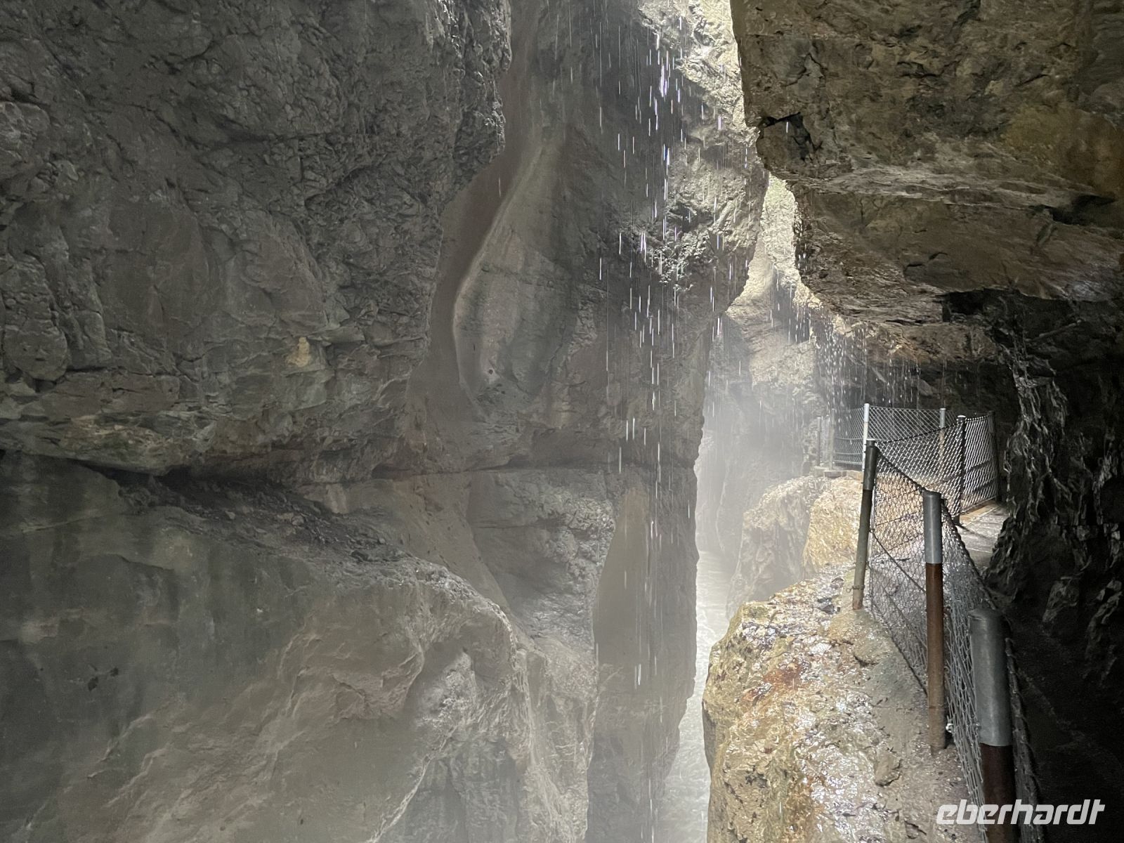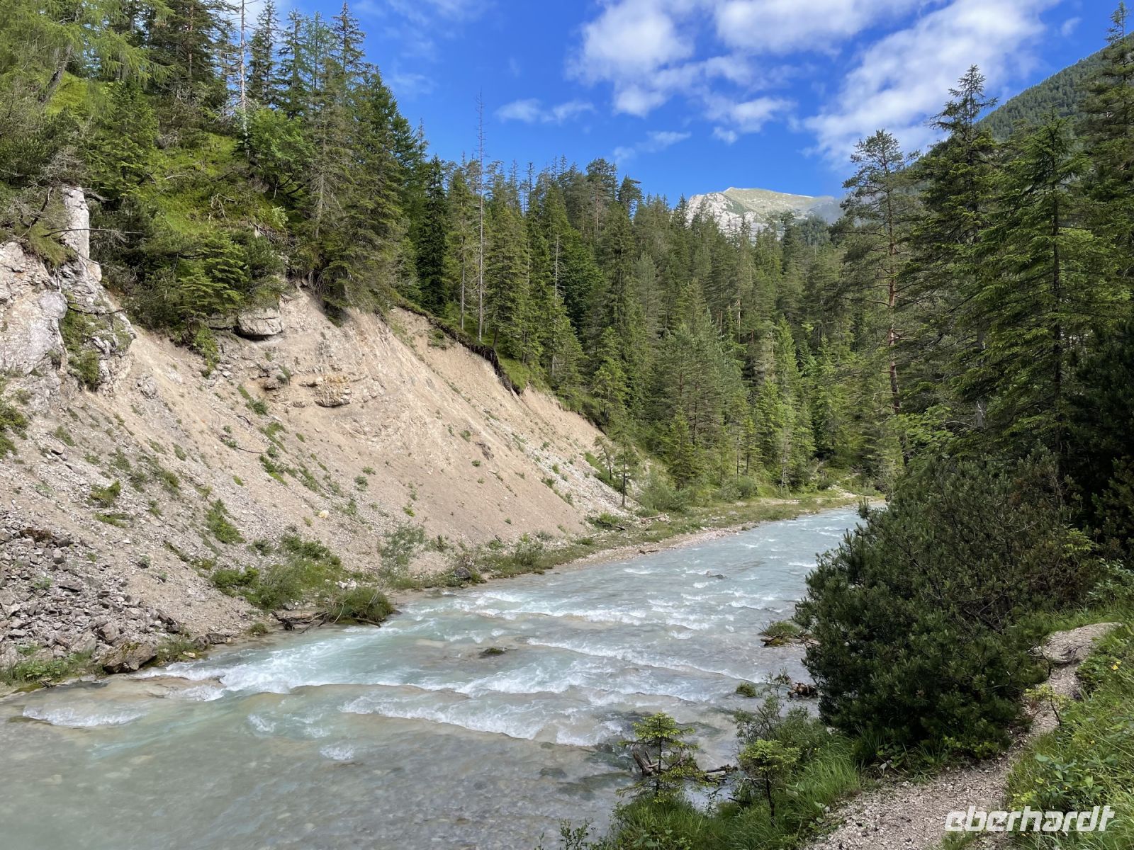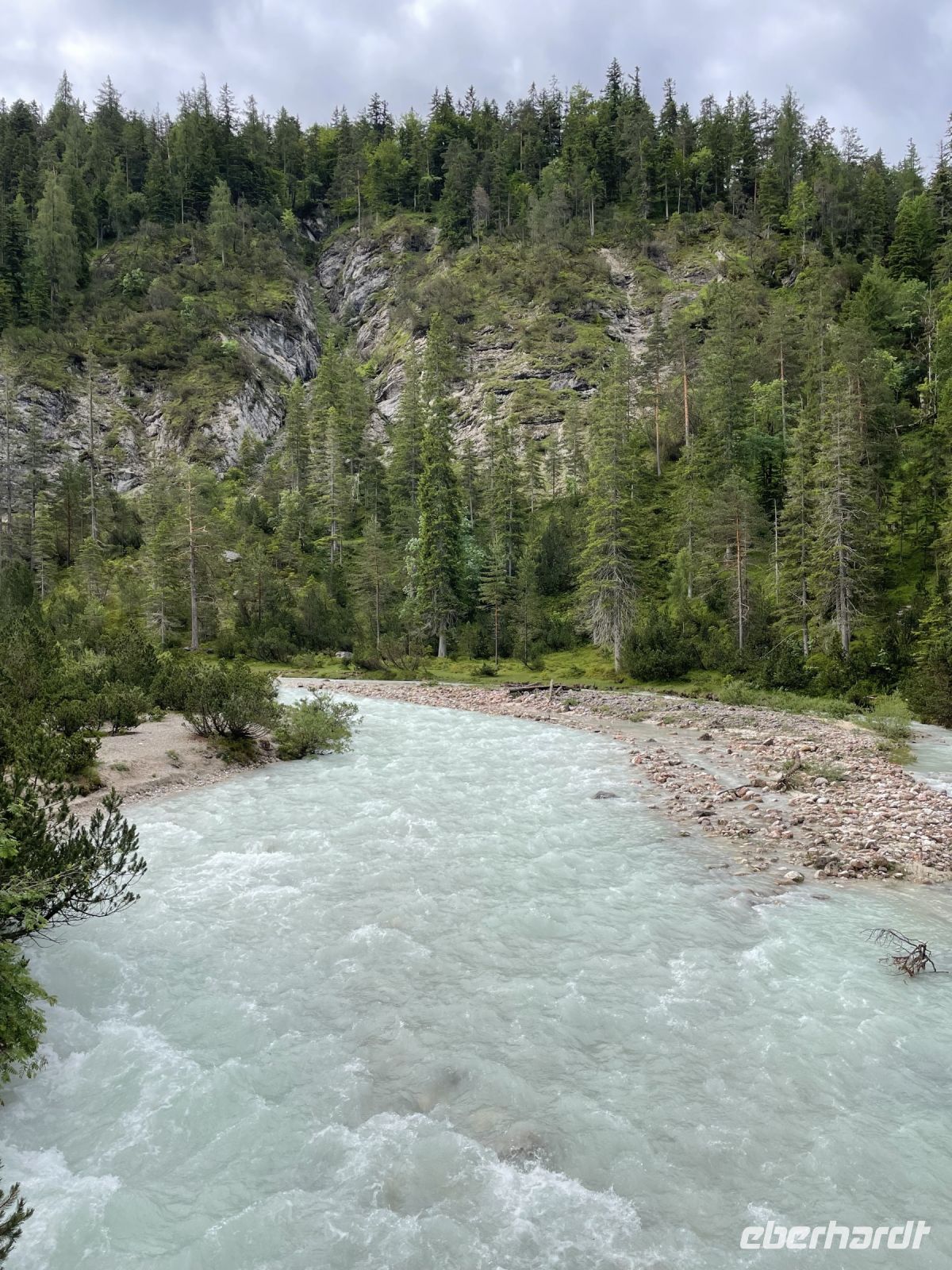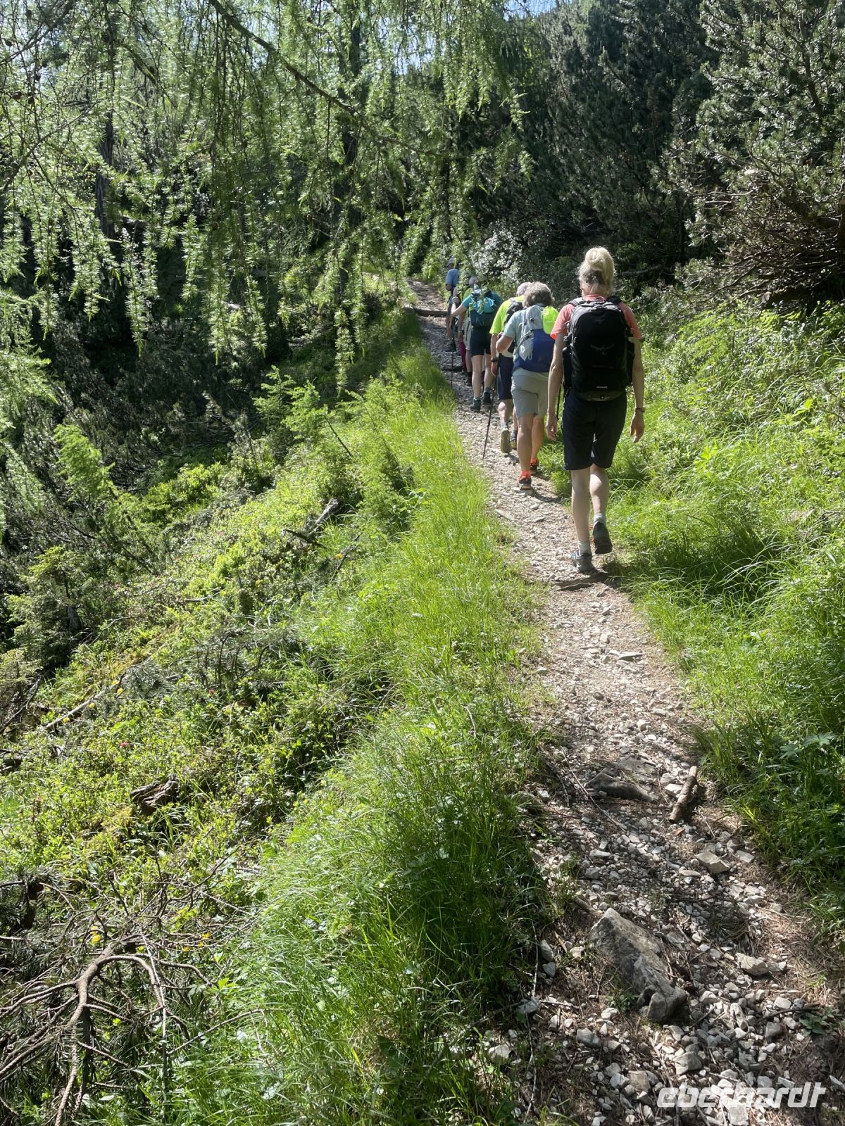 Gut ausgeruht und vorzüglich gefrühstückt, werden wir pünktlich von unseren privaten Taxen abgeholt. Zunächst geht es bis nach Scharnitz, wo wir in ein Taxi steigen, welches die Berechtigung zur Einfahrt ins Tal hat. Vor dem Abstieg in den Klamm-Einstieg gibt es das obligatorische „Morgengebet“ und dann geht es auch schon steil hinab. Doch es ist nur ein kurzes Stück und die nun beginnende Gleirschklamm entschädigt für alles. Es ist ein wunderschöner Weg durch dieses wildromantische Naturschauspiel. Die Sonne und der blaue Himmel tun den Rest – schon fast kitschig, aber eines der Höhepunkte der gesamten Alpenüberquerung.
