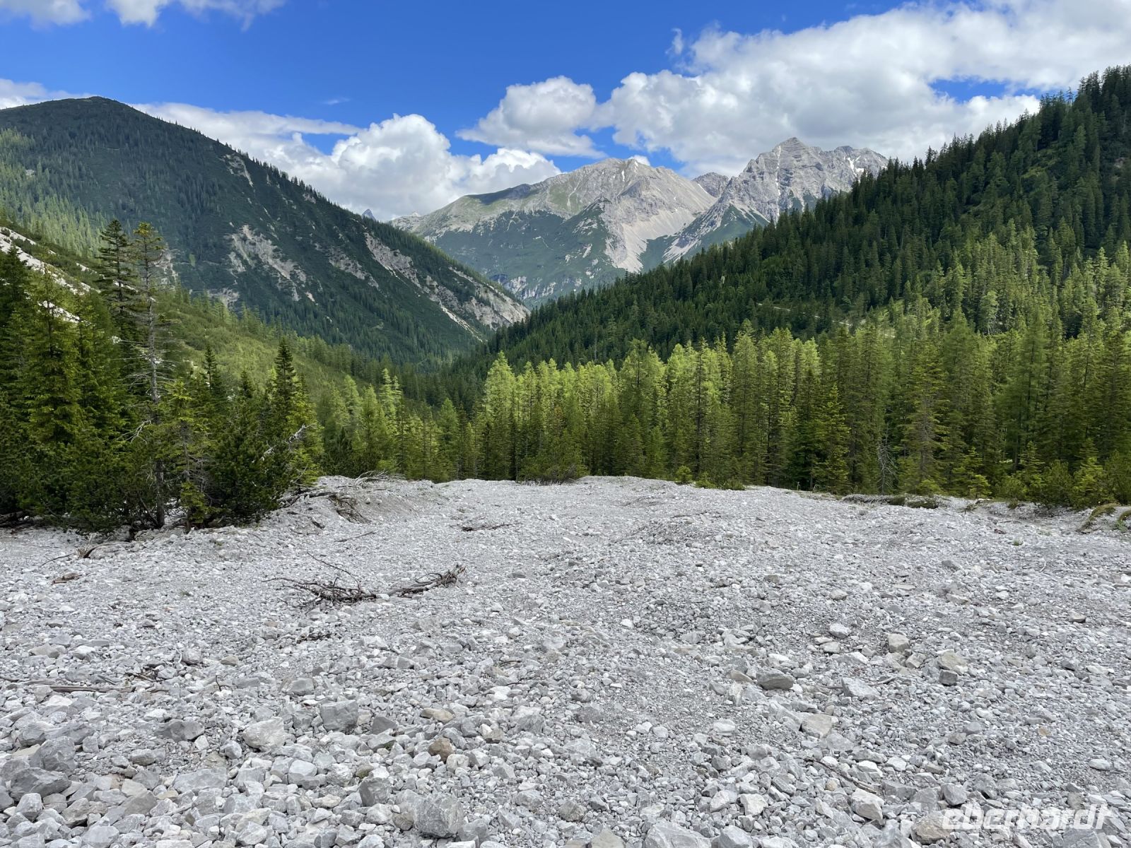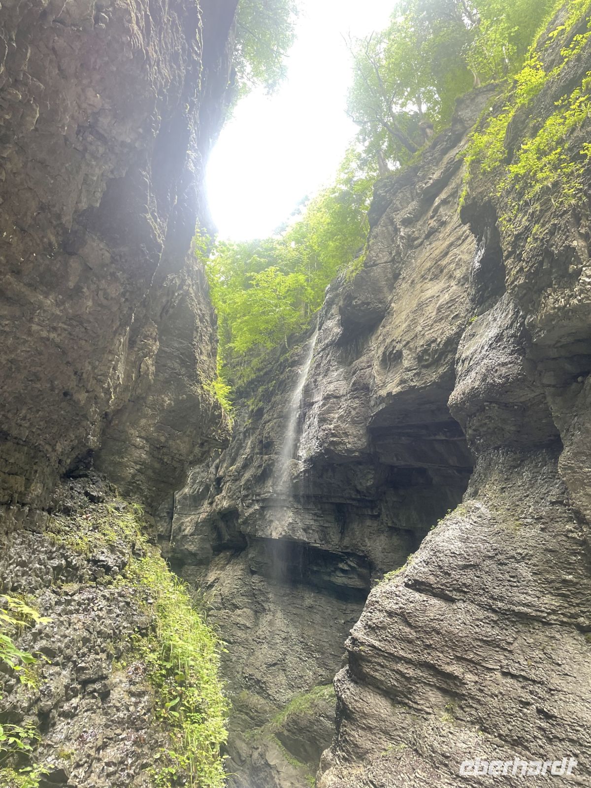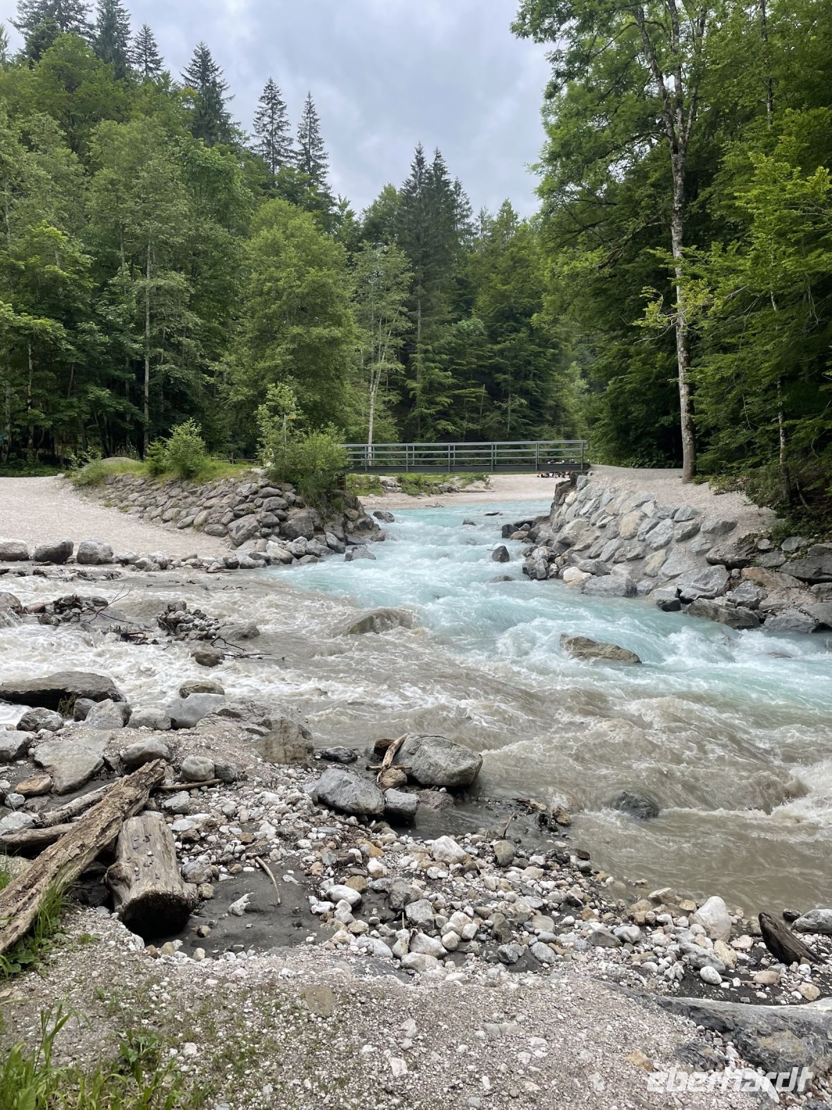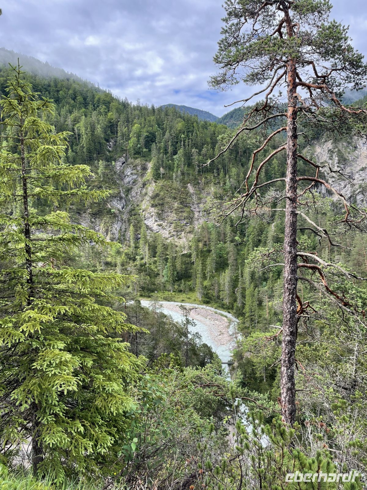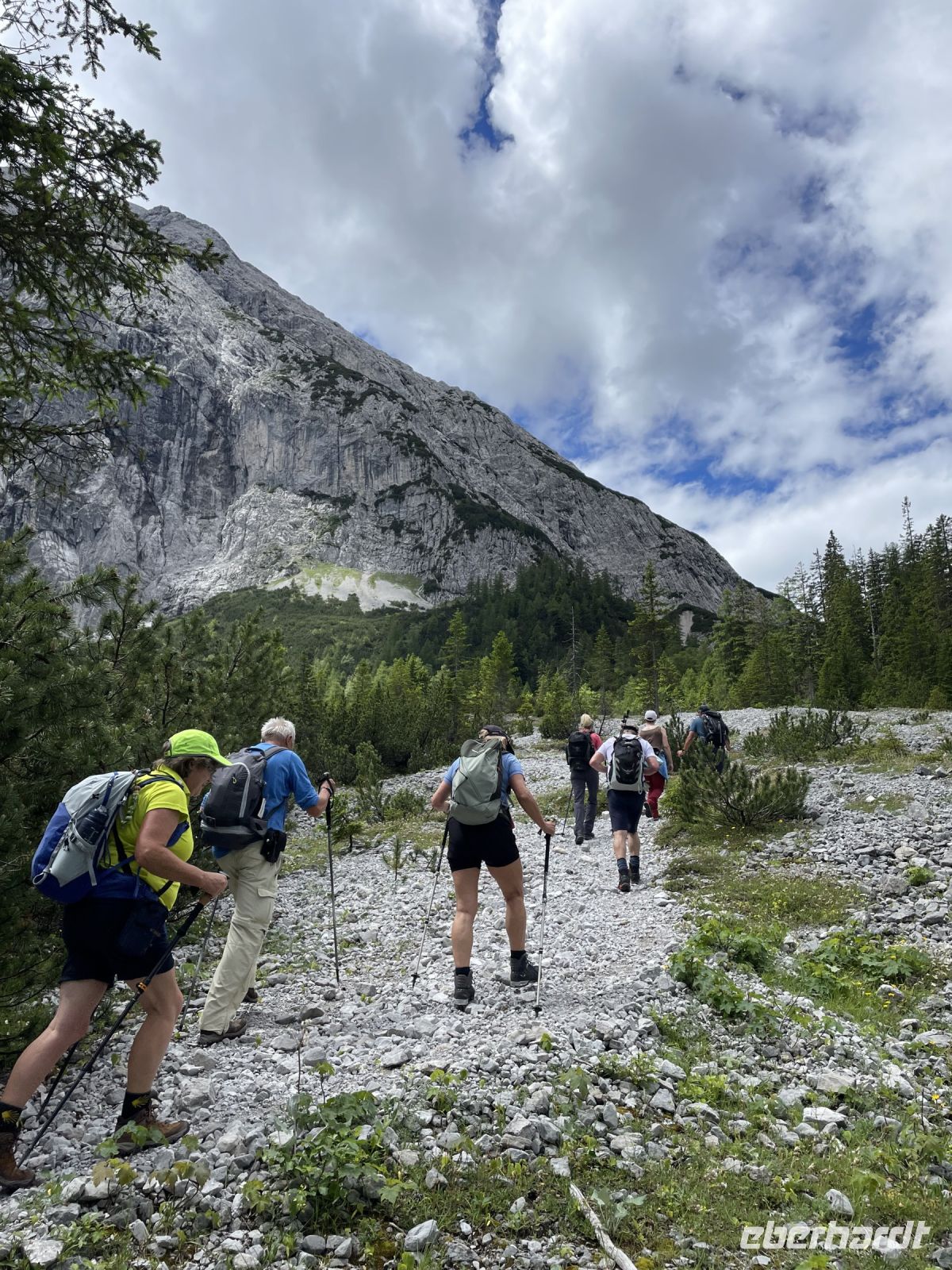 Gut ausgeruht und vorzüglich gefrühstückt, werden wir pünktlich von unseren privaten Taxen abgeholt. Zunächst geht es bis nach Scharnitz, wo wir in ein Taxi steigen, welches die Berechtigung zur Einfahrt ins Tal hat. Vor dem Abstieg in den Klamm-Einstieg gibt es das obligatorische „Morgengebet“ und dann geht es auch schon steil hinab. Doch es ist nur ein kurzes Stück und die nun beginnende Gleirschklamm entschädigt für alles. Es ist ein wunderschöner Weg durch dieses wildromantische Naturschauspiel. Die Sonne und der blaue Himmel tun den Rest – schon fast kitschig, aber eines der Höhepunkte der gesamten Alpenüberquerung.