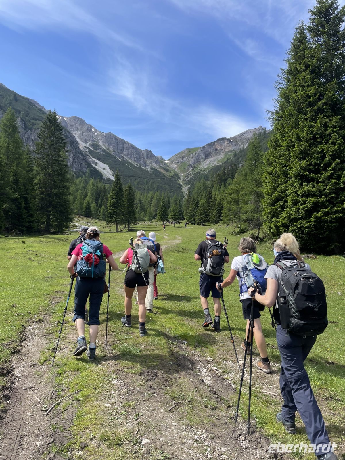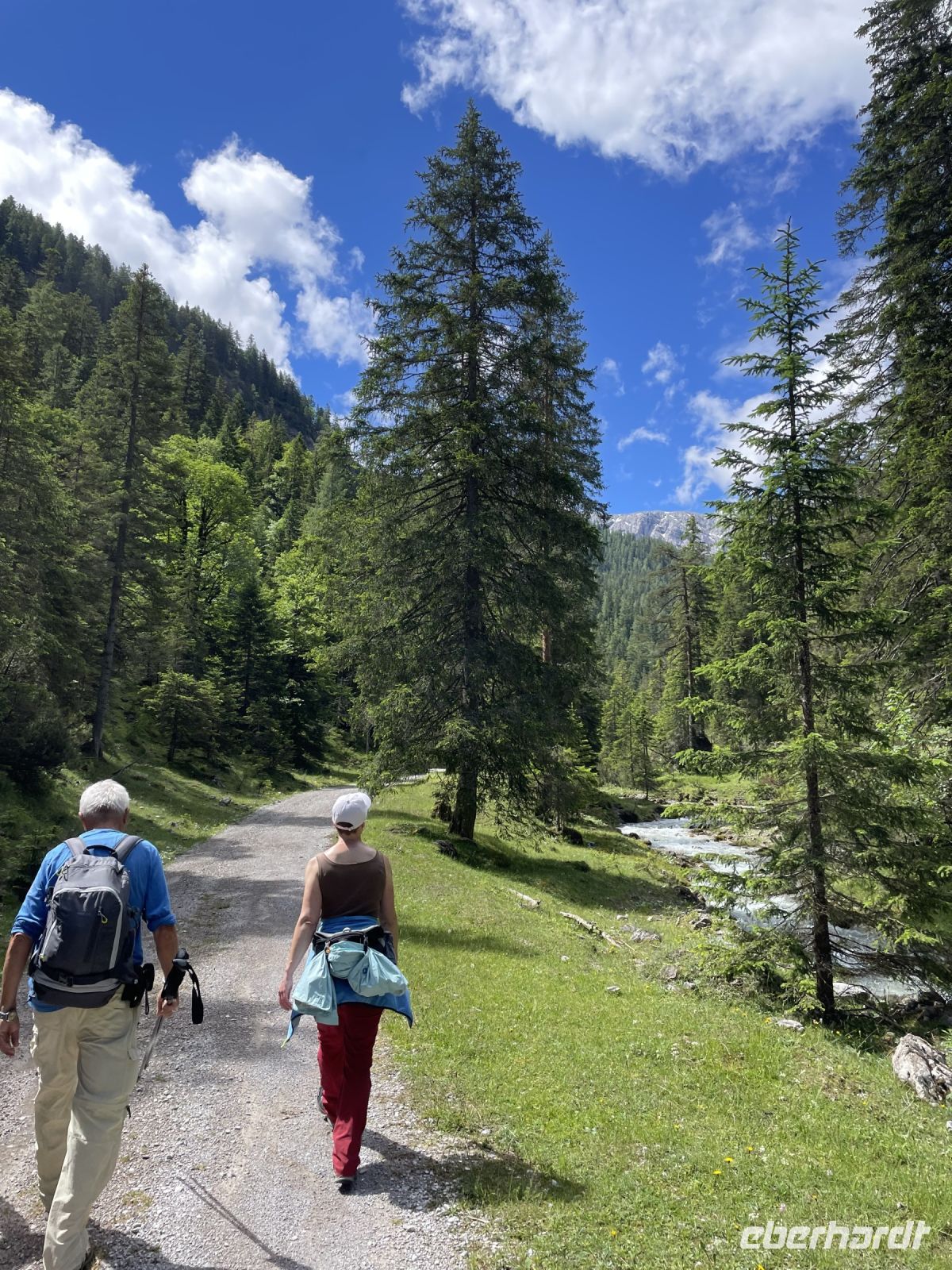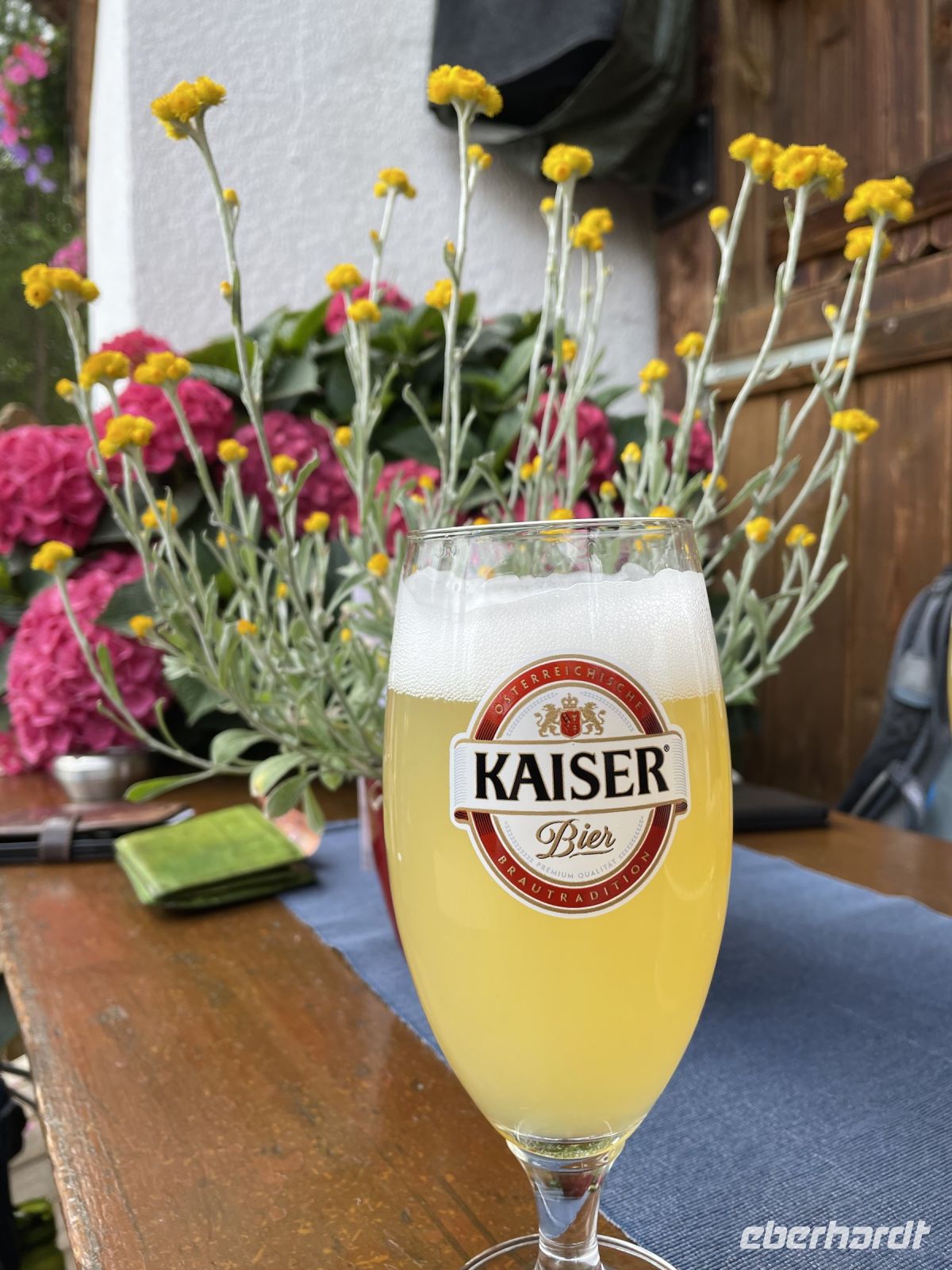 Leider ist der Weg hinauf zur Kaiserschnarrnalm gesperrt, sodass wir nur noch ein Stück ins Tal hineingehen; zurück geht’s auf dem gleichen Weg. Noch ein Kaffee in einem Biergarten und anschließend checken wir im Hotel ein.