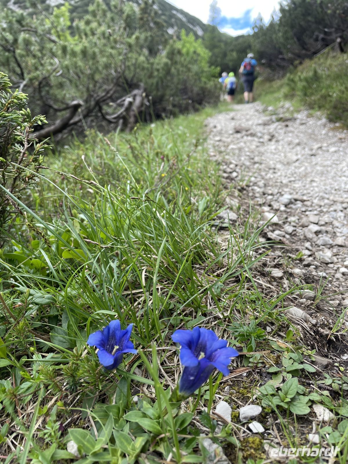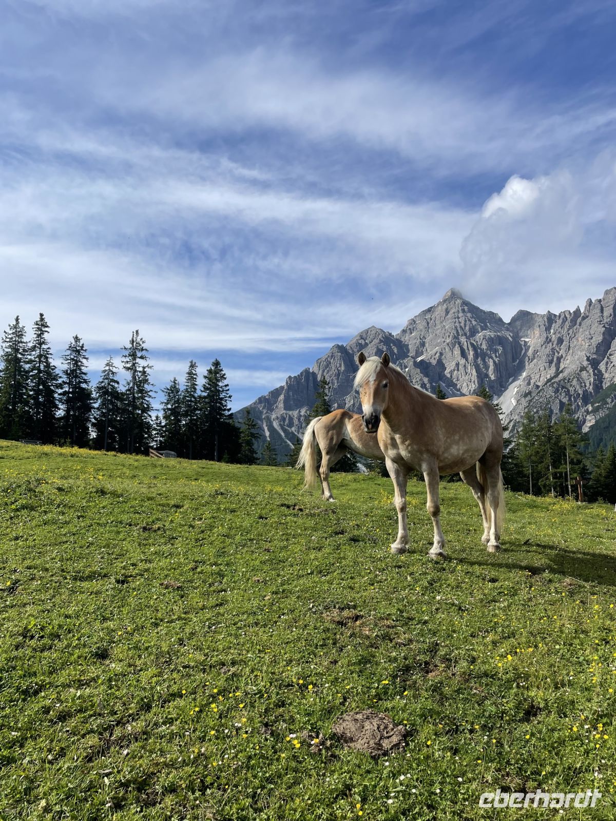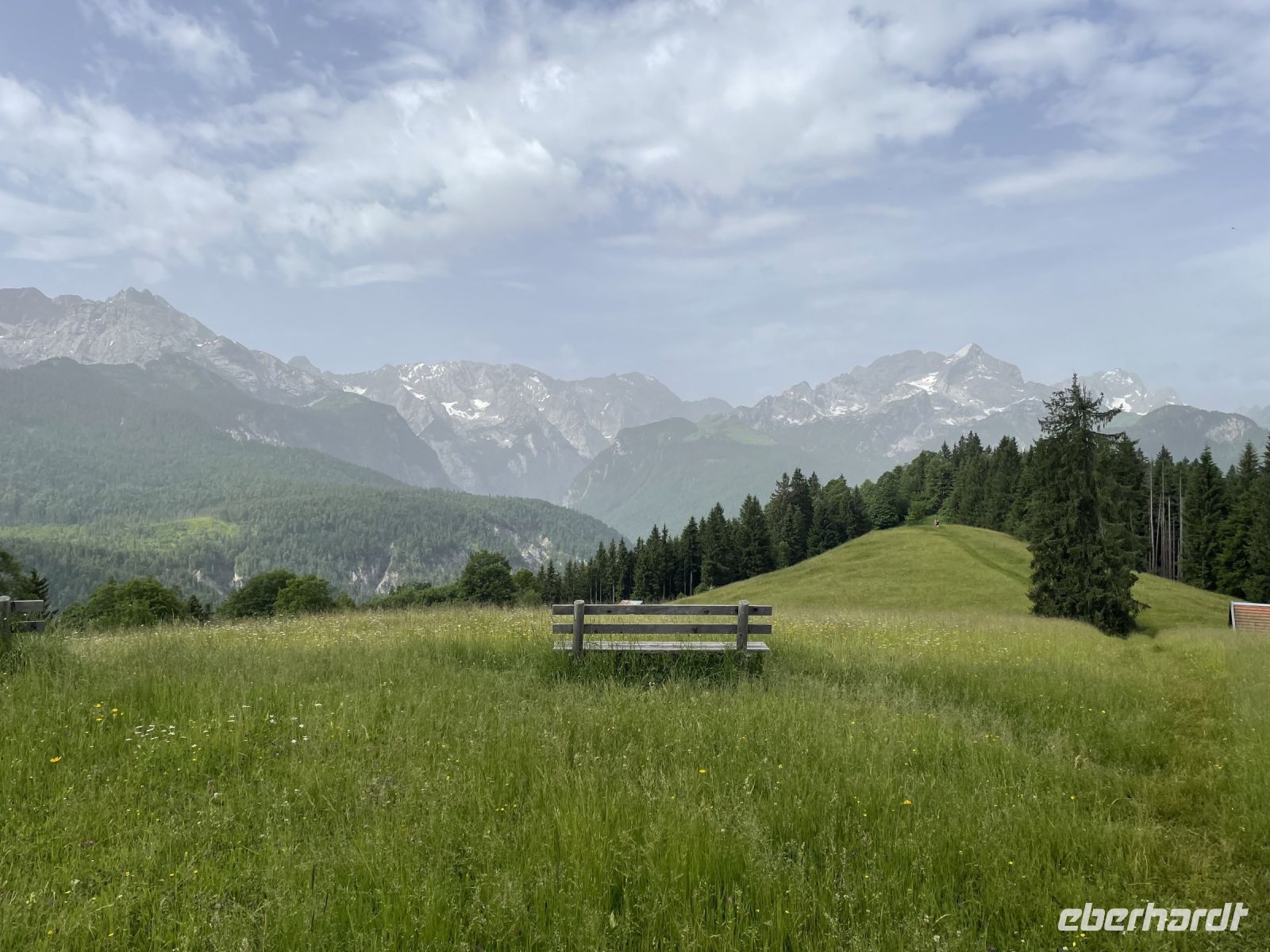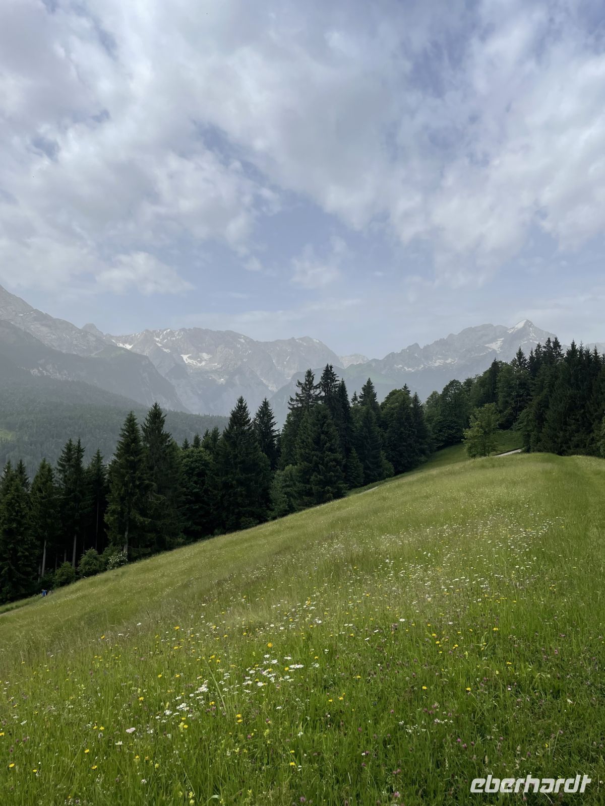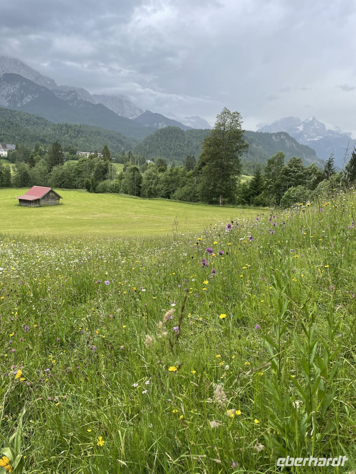 Mit Blick auf das gigantische Wettersteingebirge wandern wir gemütlich auf einem Höhenrücken von der Bergstation in Richtung Elmauer Alm. Die ersten Almwiesen begeistern uns schon sehr und Rudi legt sich schon in den ersten Kilometern öfter ins Blumenmeer für das perfekte Foto. Im leichten Auf und Ab erreichen wir den Wamberg, die Elmauer Alm und nach dem Abstieg das Schloss Elmau - Ort des G7-Gipfels 2015.