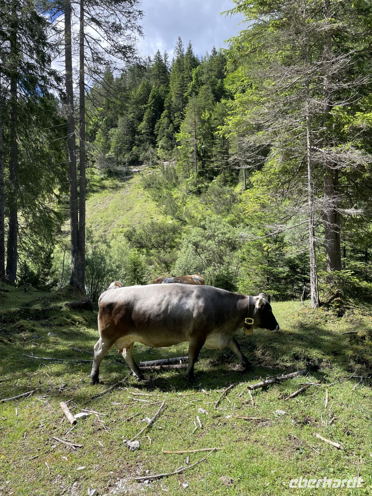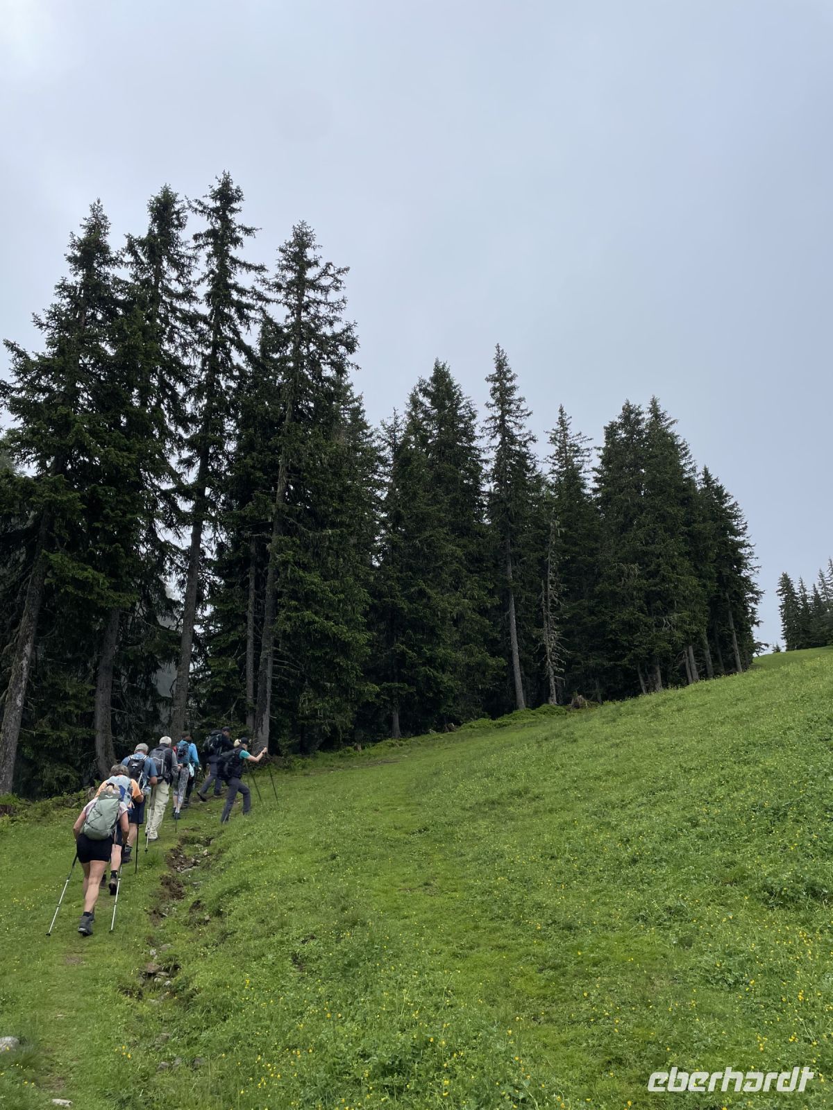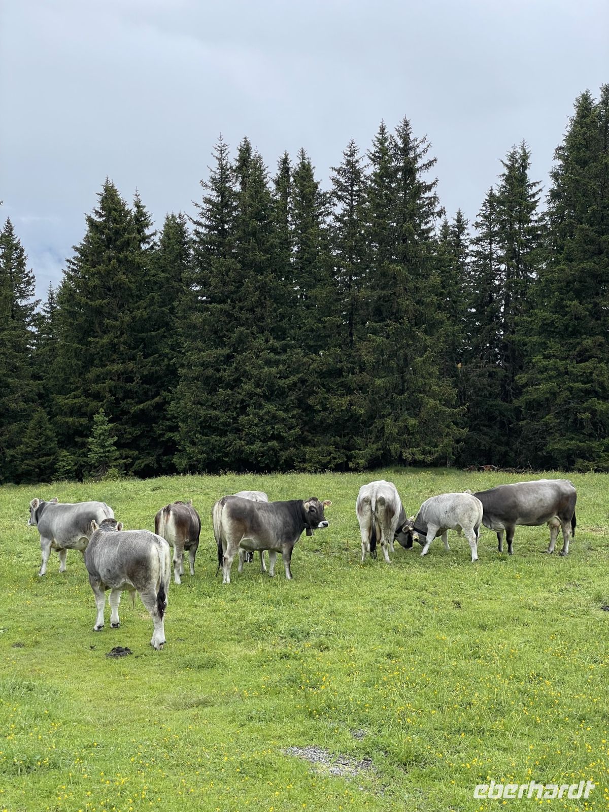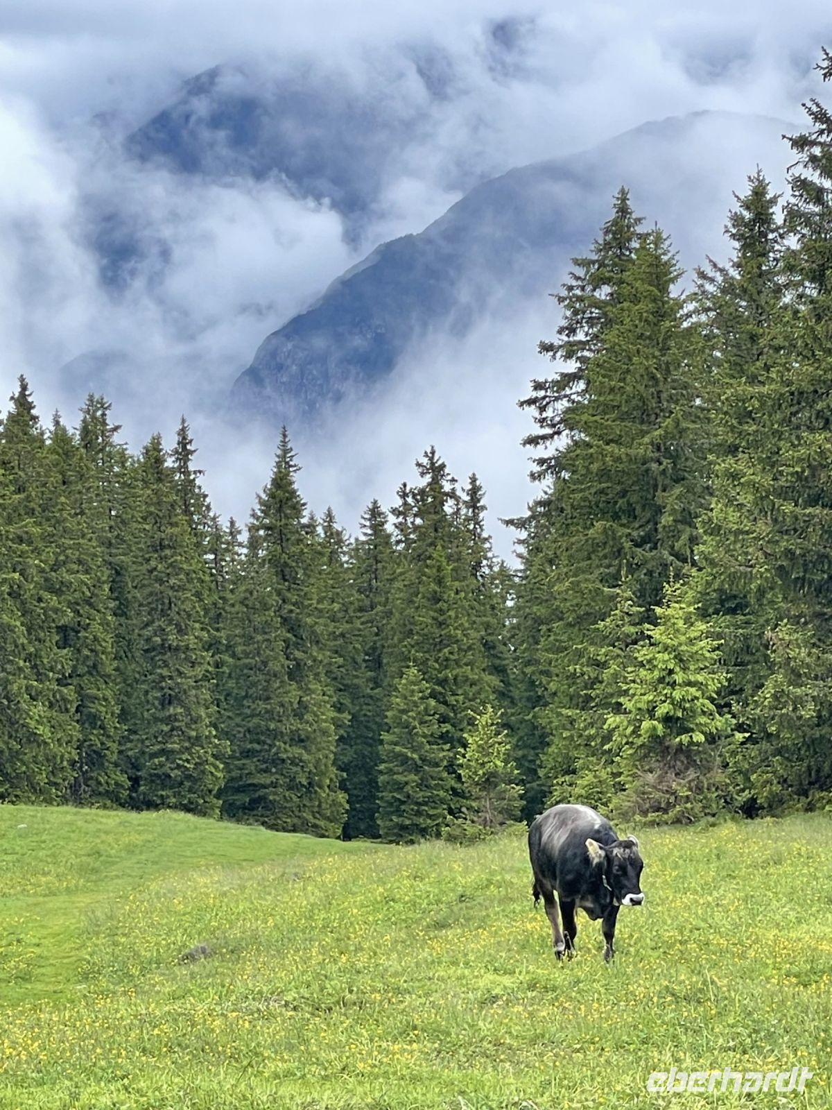 Durch den kühlen Nebelwald steigen wir stetig bergauf. Über eine recht steile Wiese (wir wollten die Serpentinen-Forststraße nicht nehmen) geht es hinauf zur Birgitzeralm. Friedlich grasende Kühe schauen uns Wanderer verwegen an und weiden gemütlich weiter.