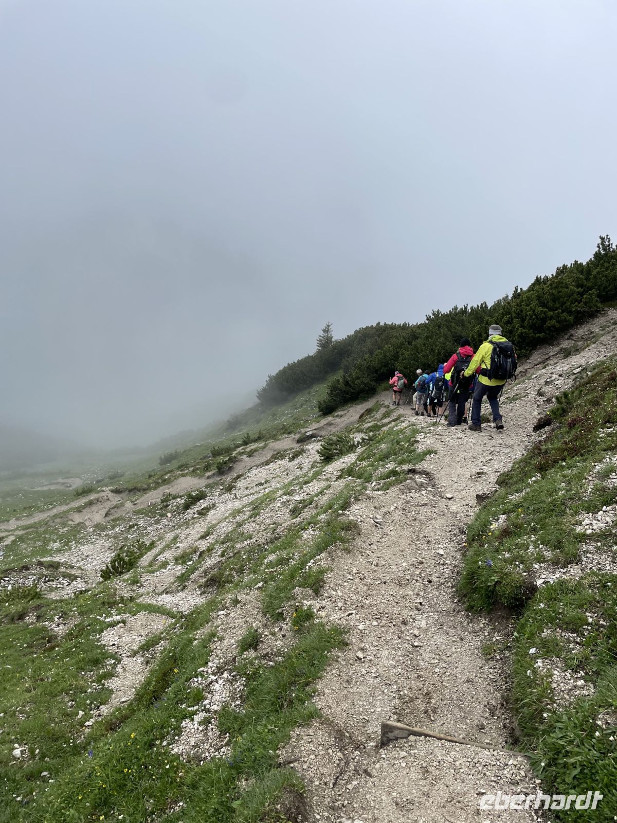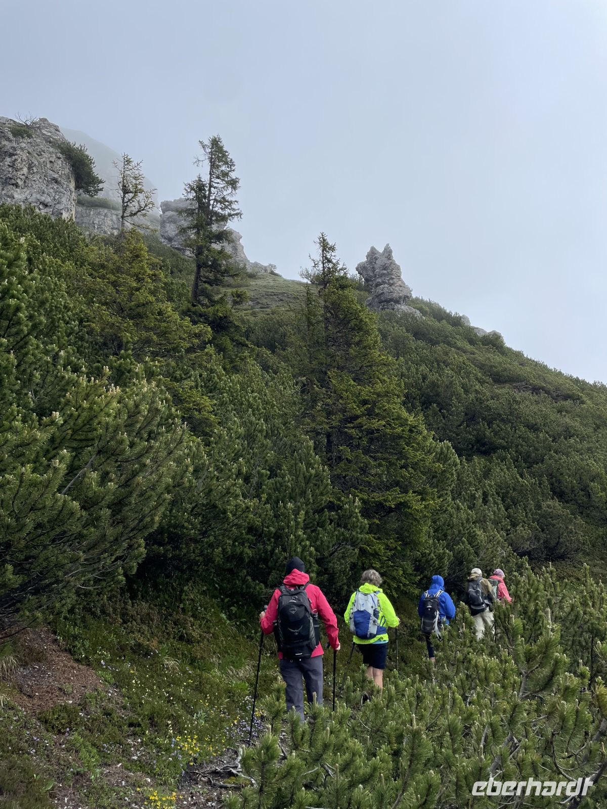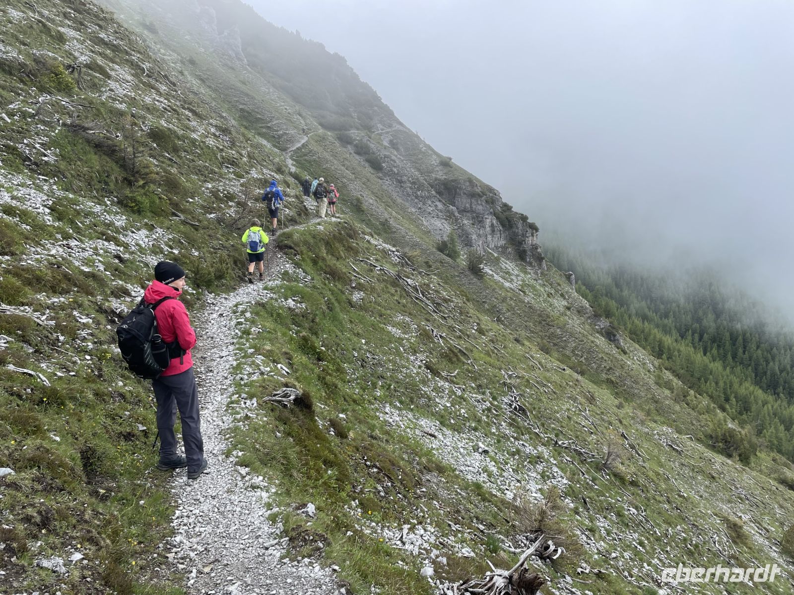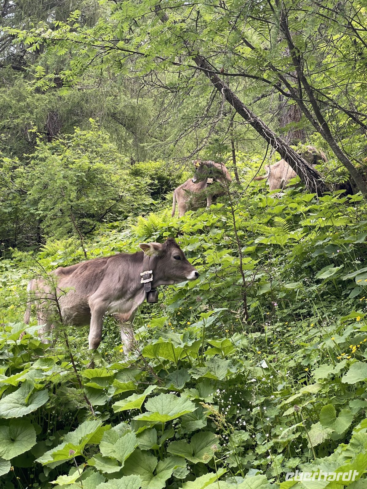 Durch den kühlen Nebelwald steigen wir stetig bergauf. Über eine recht steile Wiese (wir wollten die Serpentinen-Forststraße nicht nehmen) geht es hinauf zur Birgitzeralm. Friedlich grasende Kühe schauen uns Wanderer verwegen an und weiden gemütlich weiter.