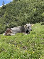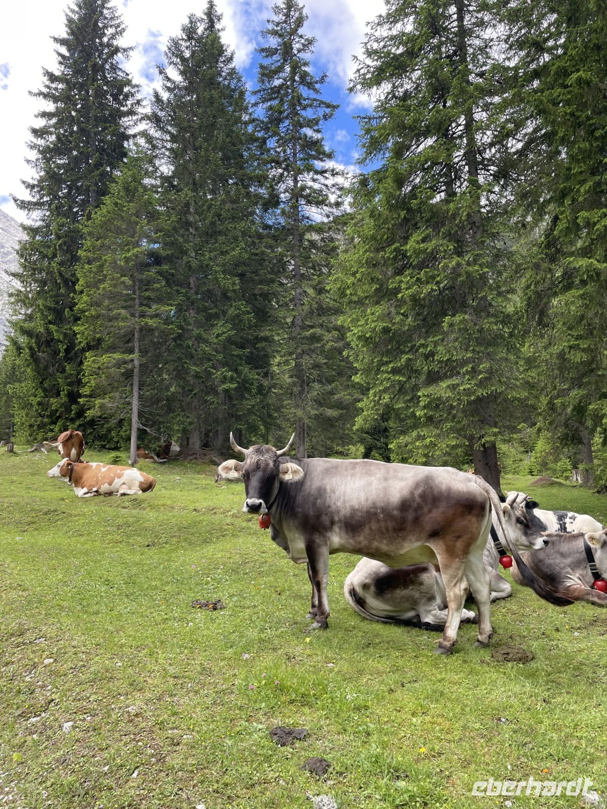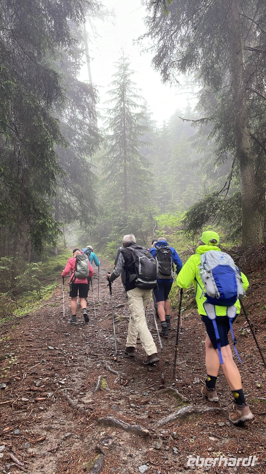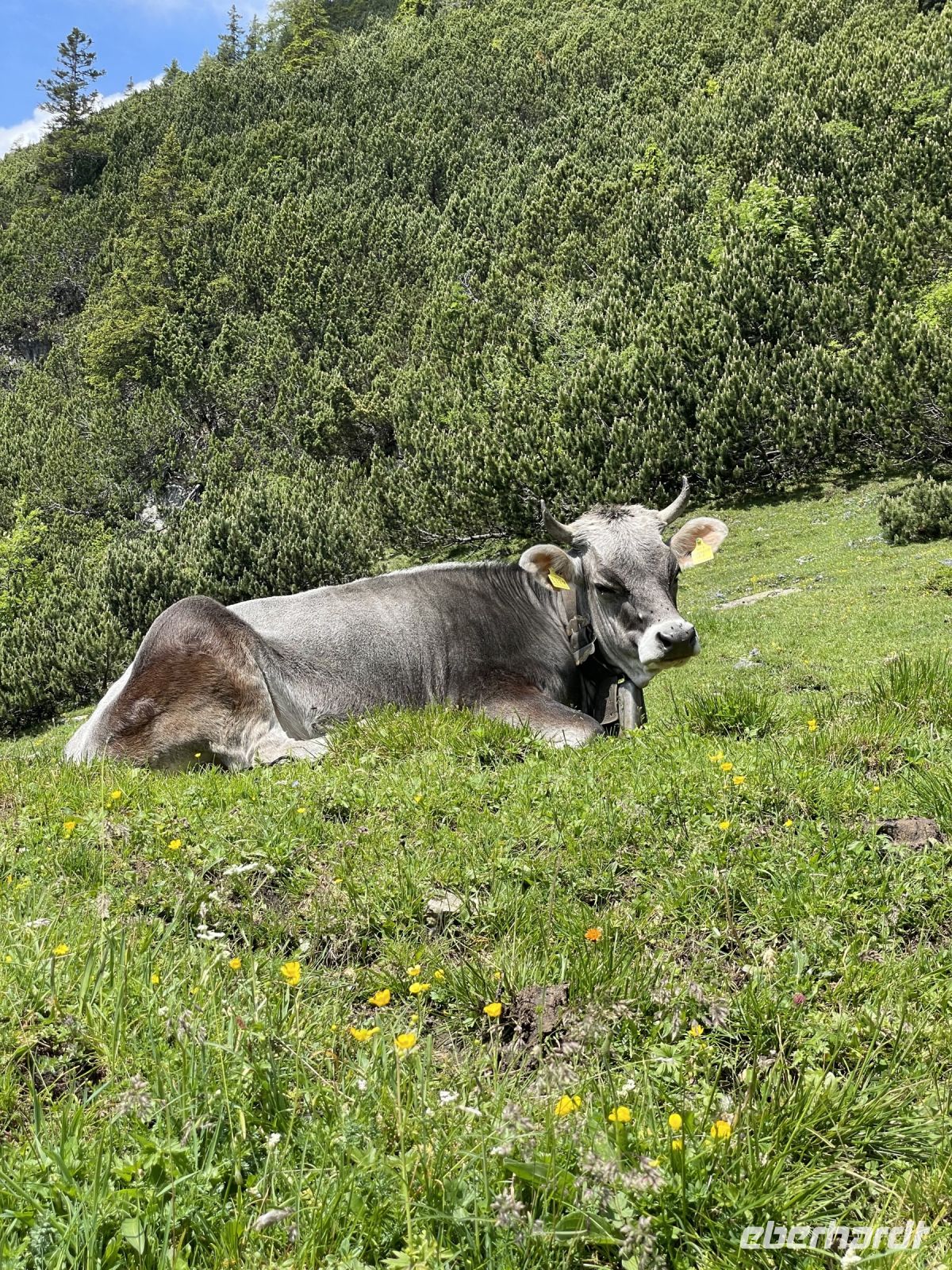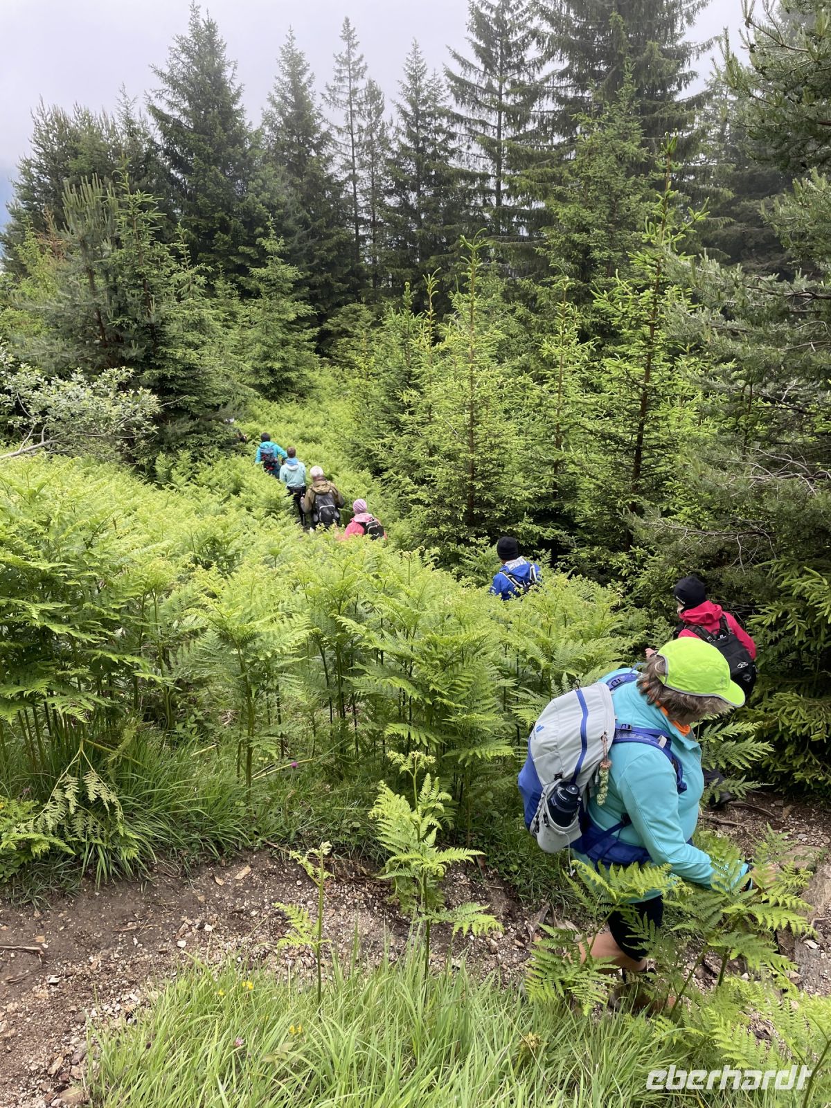 Durch den kühlen Nebelwald steigen wir stetig bergauf. Über eine recht steile Wiese (wir wollten die Serpentinen-Forststraße nicht nehmen) geht es hinauf zur Birgitzeralm. Friedlich grasende Kühe schauen uns Wanderer verwegen an und weiden gemütlich weiter.