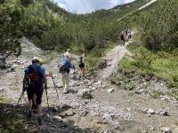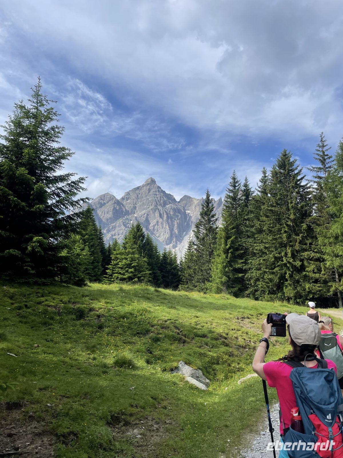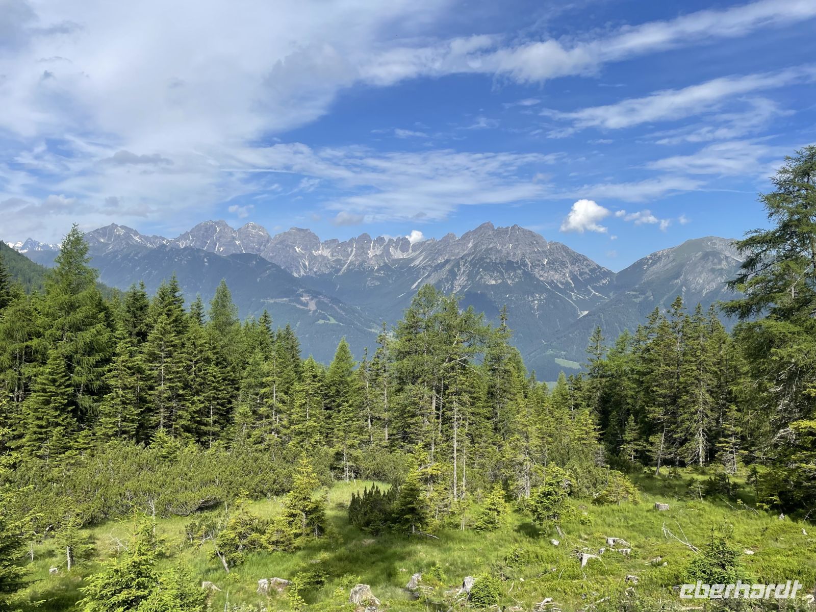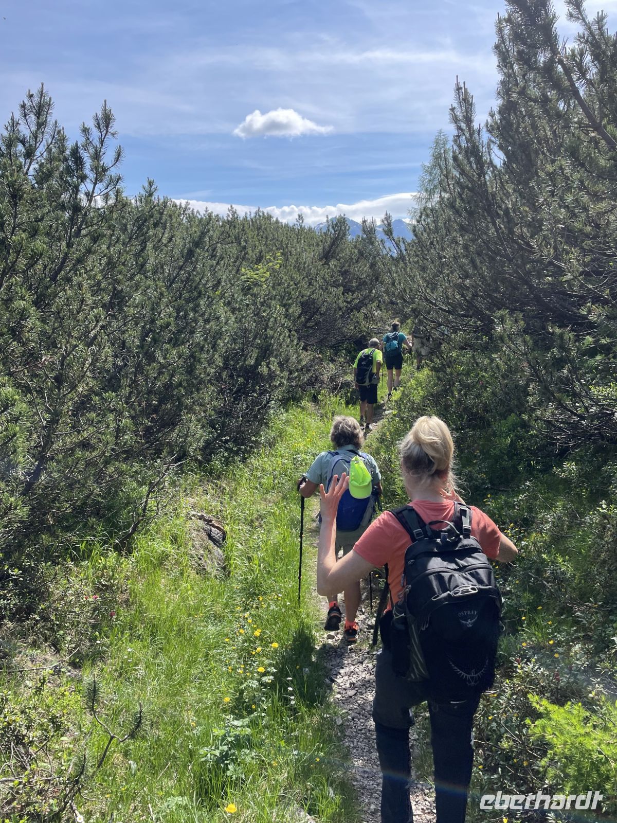 Gemütlich wandern wir anschließend auf der Forststraße bis zur Kristenalm, die wir aber noch nicht für unsere heutige Rast wählen. Wir queren einen Bach und folgen schließlich einem wunderschönen, moderaten Steig in Richtung Solsteinhaus. Diese Hütte ist eine Schutzhütte der Sektion Innsbruck des Österreichischen Alpenvereins in 1.806 Metern Höhe am Erlsattel zwischen Nordkette und Erlspitzgruppe. Der Weg führt zunächst durch den Wald, über ein Schotterfeld und weiter durch einen Latschenhang bis zum Solsteinhaus. Hier legen wir eine ausgiebige Mittagsrast ein und genießen österreichische Leckereien!