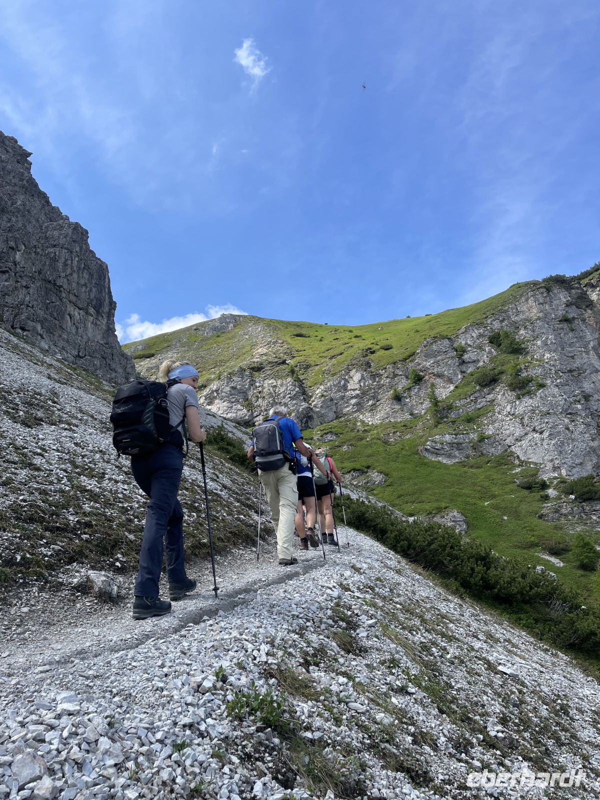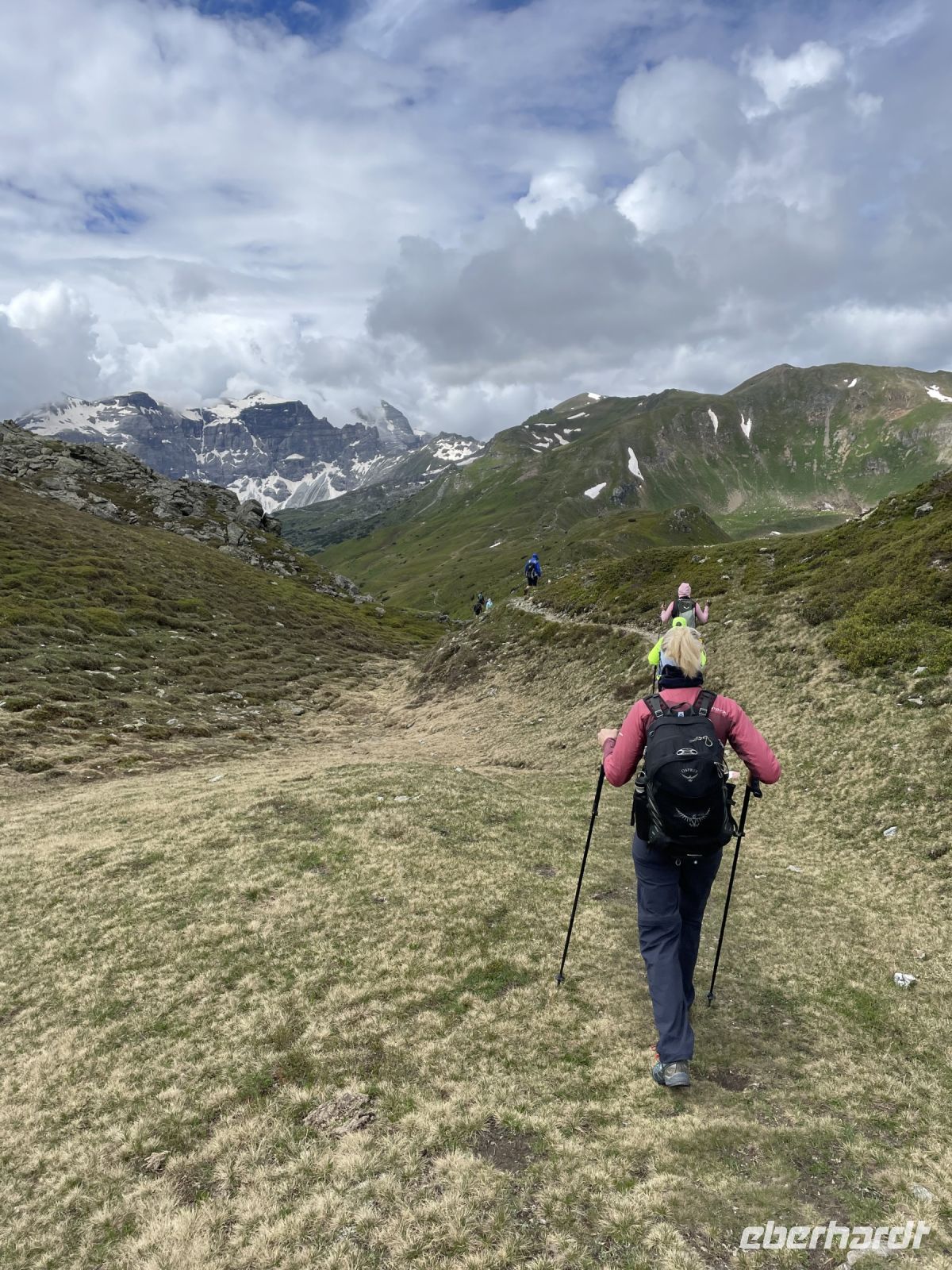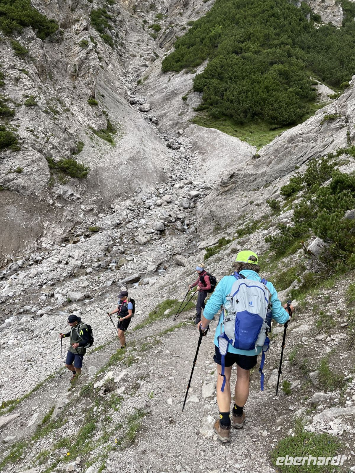 Der Abstieg fordert unsere volle Aufmerksamkeit und Trittsicherheit. Es geht über Geröllfelder, immer im Bann der mächtigen Berge um uns herum.