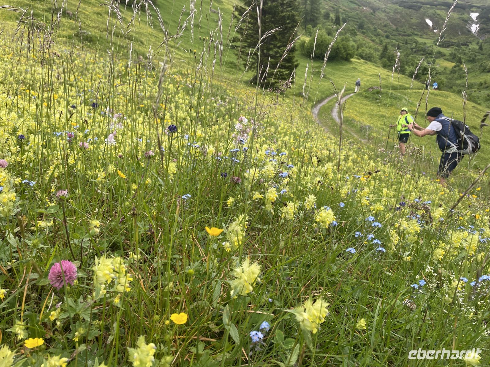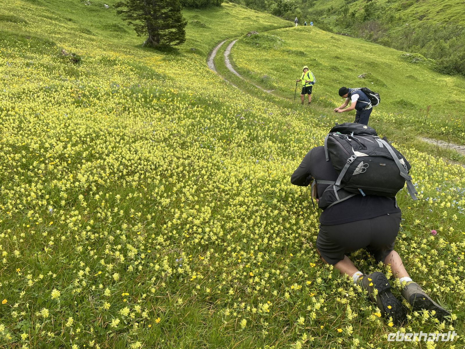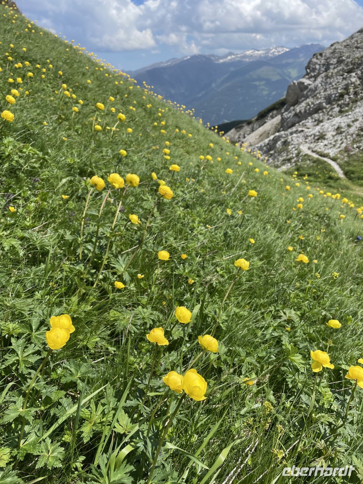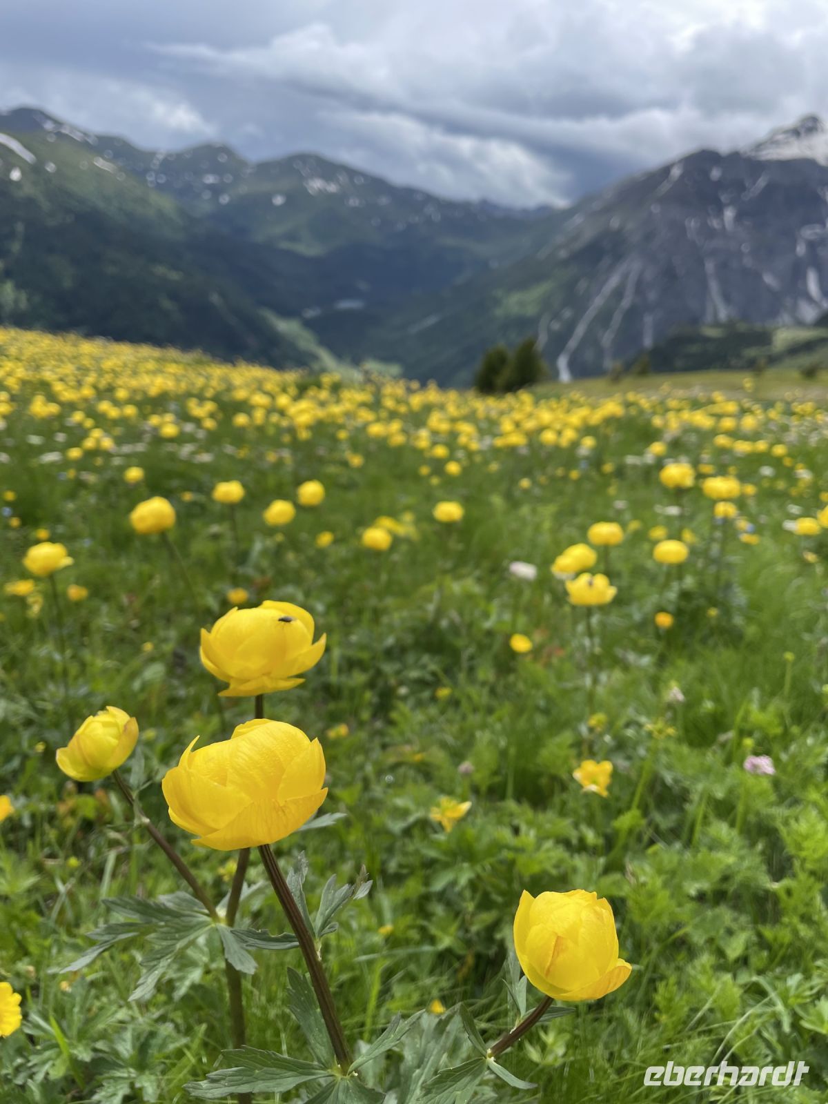 Von hier haben wir schon unser Zwischenziel, den Blaser (2.241 Meter) immer vor Augen. Wir wandern in das Lange Tal, überqueren schöne Mähder und kommen zu einer Latschenzone. Ein rauher Serpentinensteig führt uns hinauf auf die Kalbenjochmähder, die wie ein gelbes Meer aus Trollblumen erscheinen. So wunderschön und einfach „der Wahnsinn“.