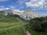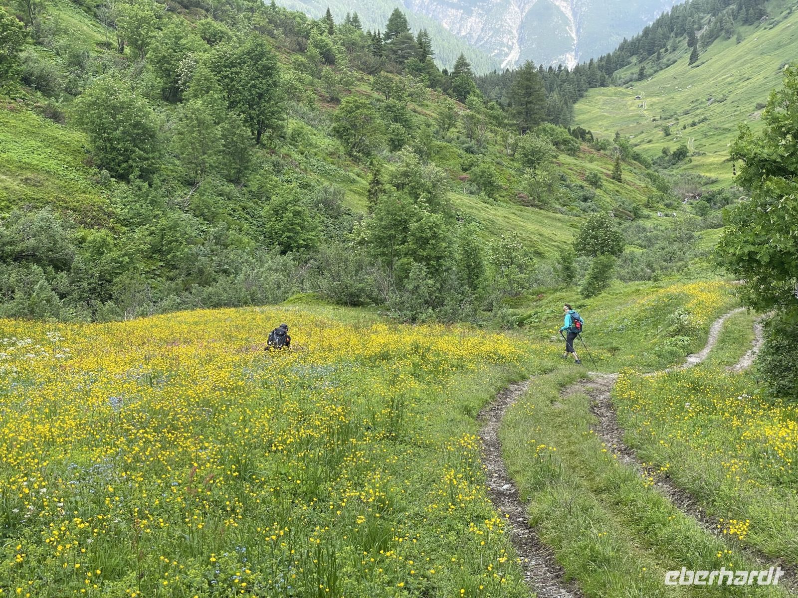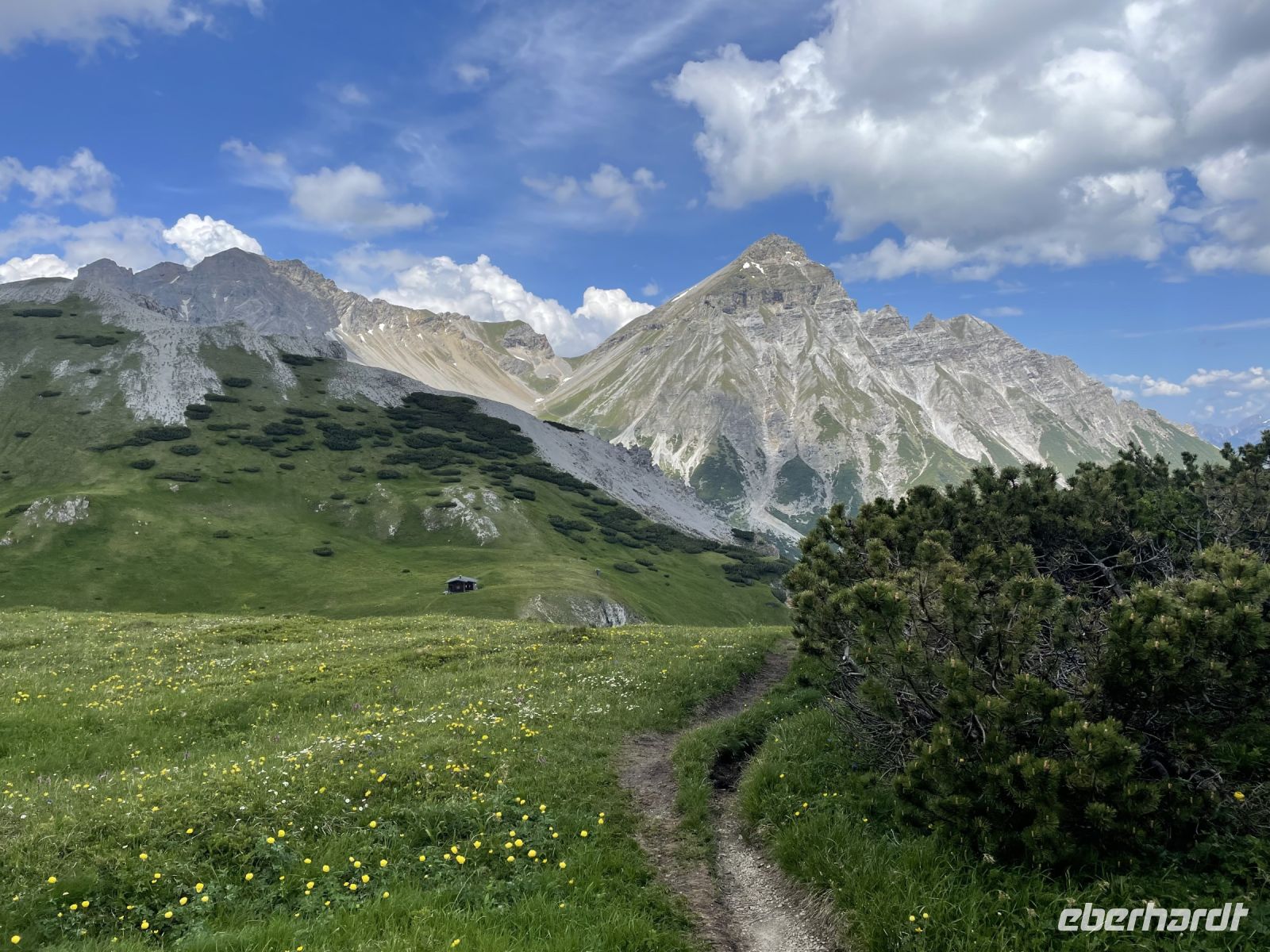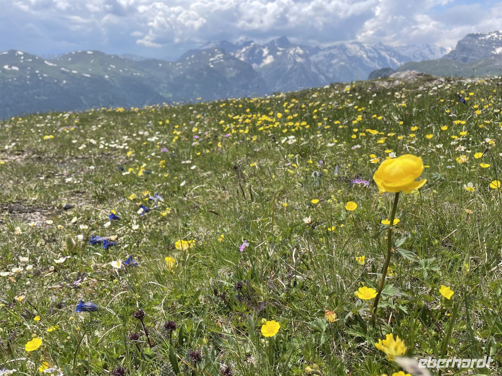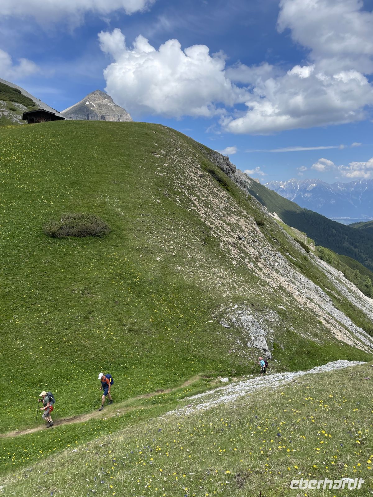 Von hier haben wir schon unser Zwischenziel, den Blaser (2.241 Meter) immer vor Augen. Wir wandern in das Lange Tal, überqueren schöne Mähder und kommen zu einer Latschenzone. Ein rauher Serpentinensteig führt uns hinauf auf die Kalbenjochmähder, die wie ein gelbes Meer aus Trollblumen erscheinen. So wunderschön und einfach „der Wahnsinn“.