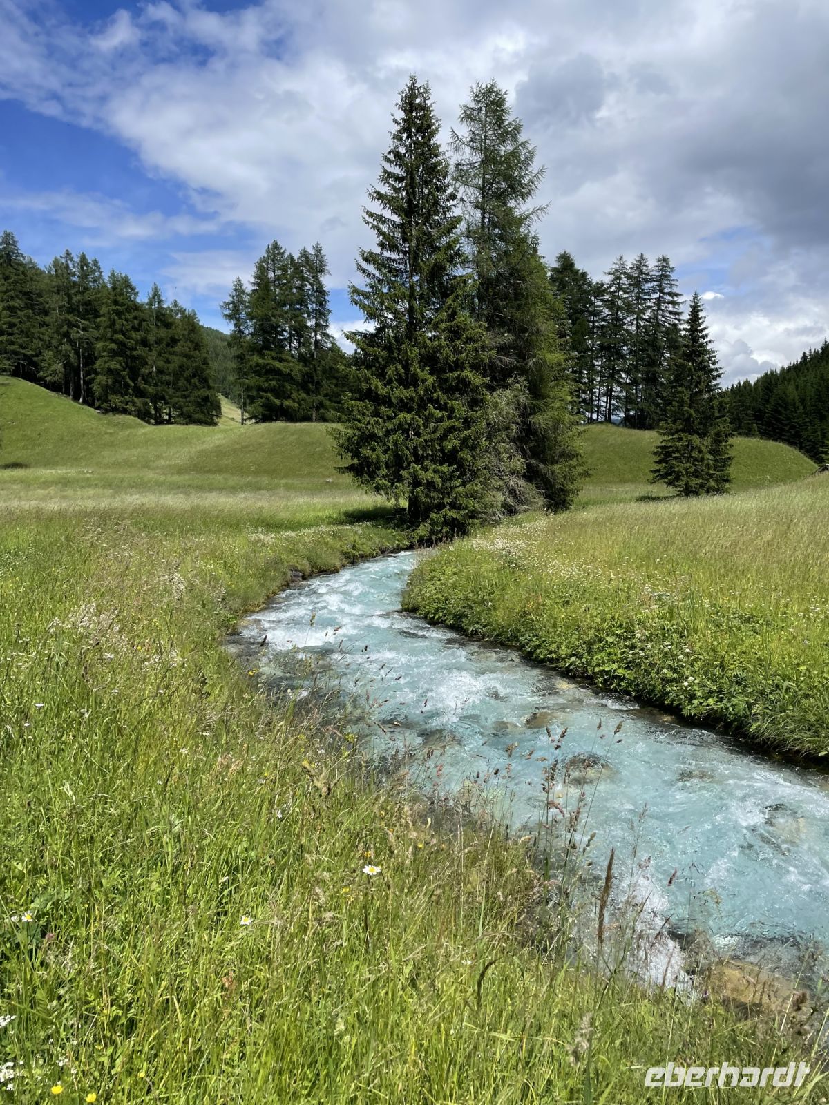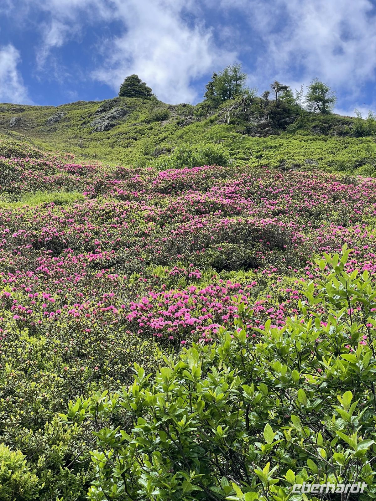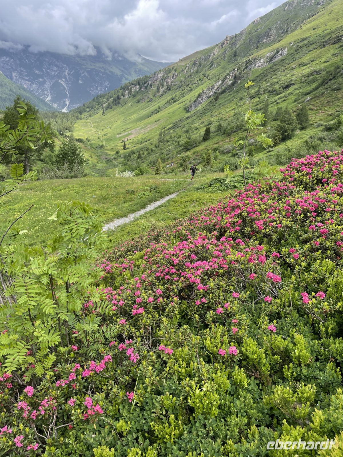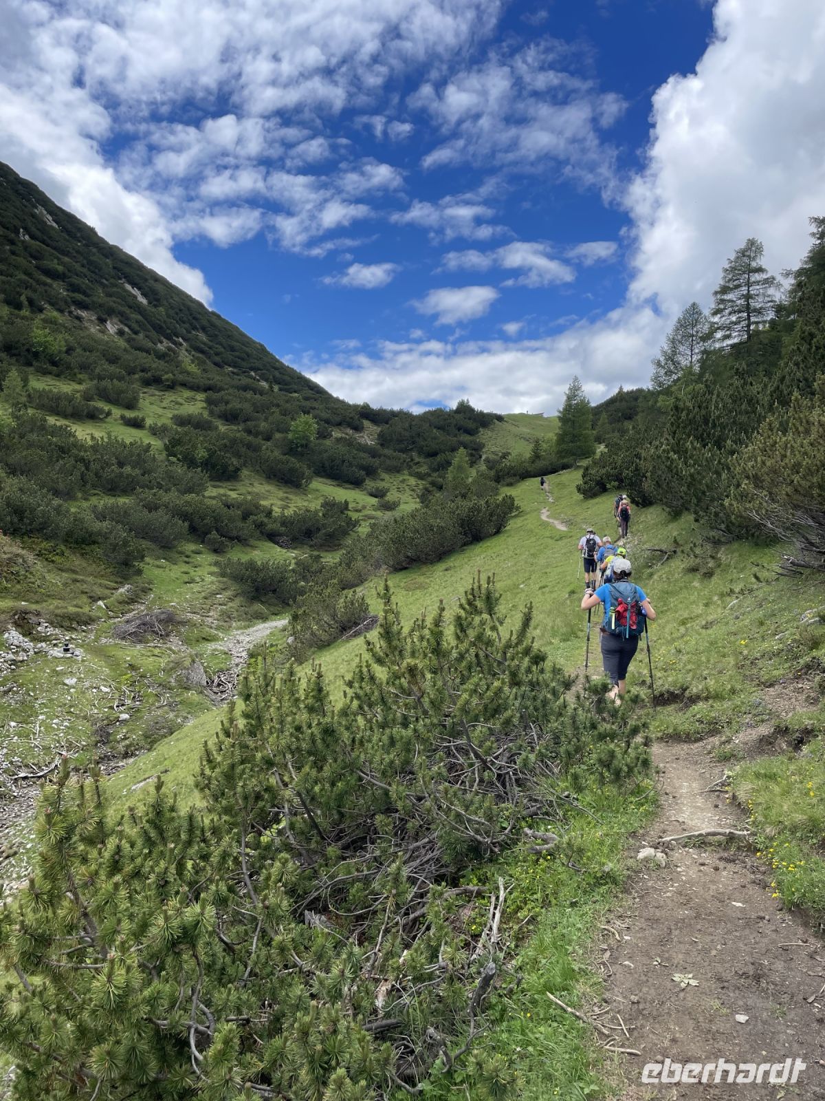 Von hier haben wir schon unser Zwischenziel, den Blaser (2.241 Meter) immer vor Augen. Wir wandern in das Lange Tal, überqueren schöne Mähder und kommen zu einer Latschenzone. Ein rauher Serpentinensteig führt uns hinauf auf die Kalbenjochmähder, die wie ein gelbes Meer aus Trollblumen erscheinen. So wunderschön und einfach „der Wahnsinn“.