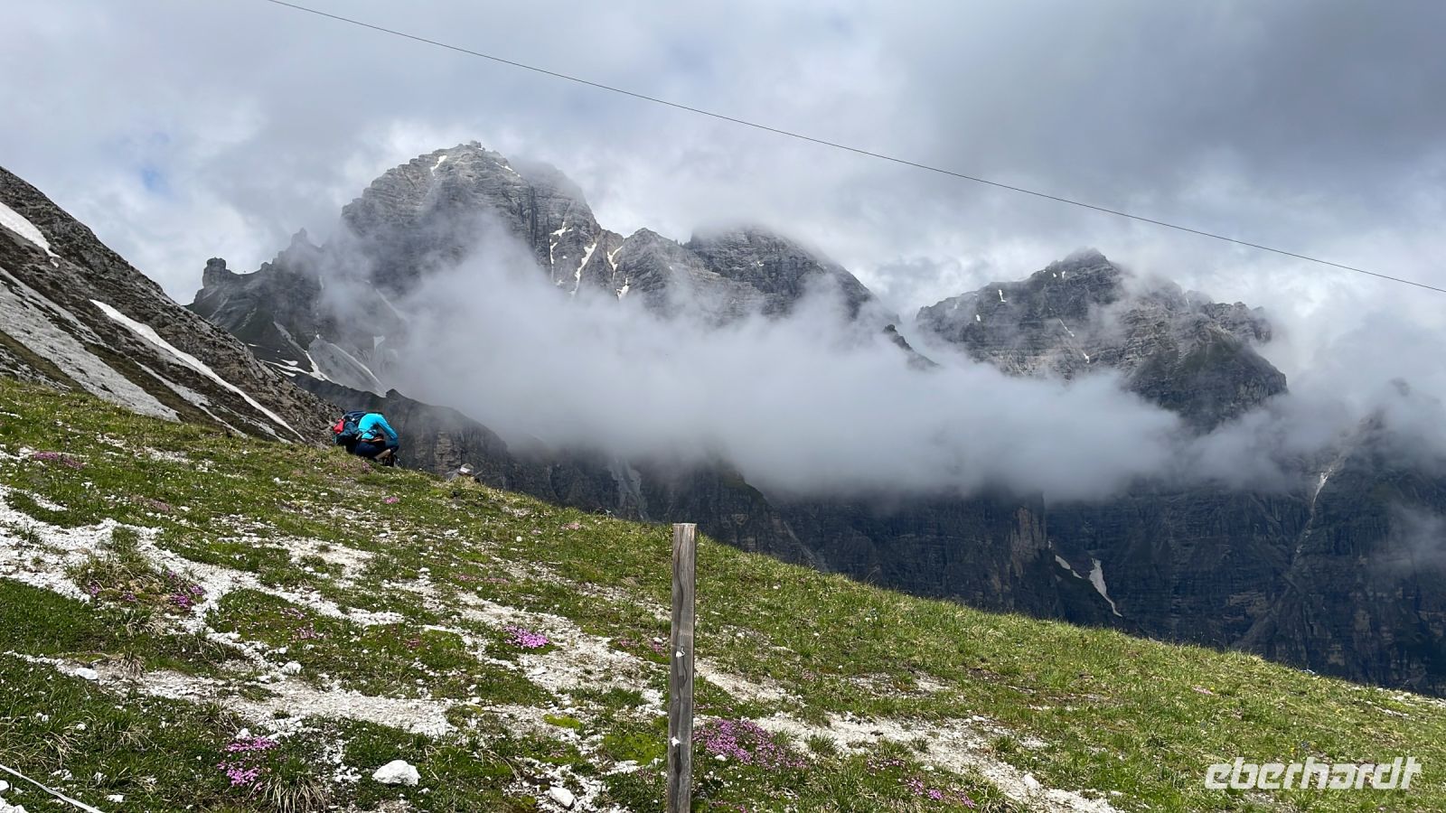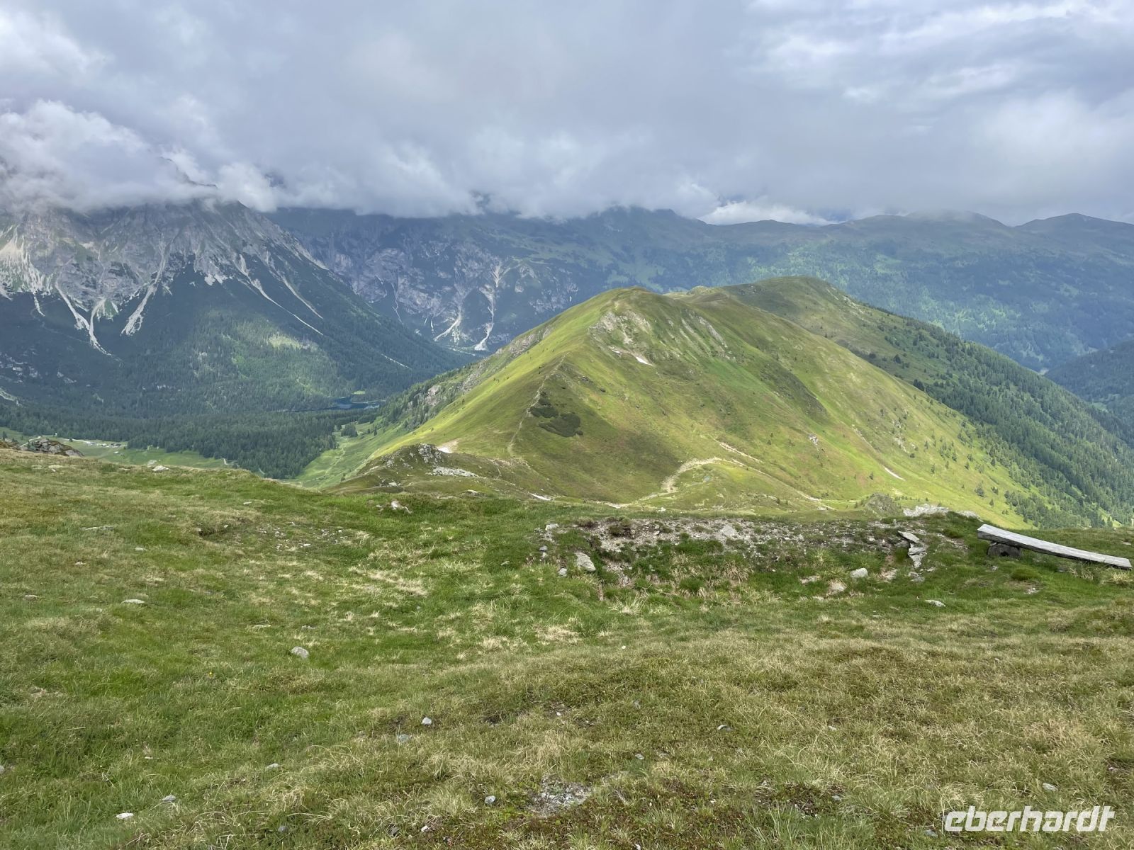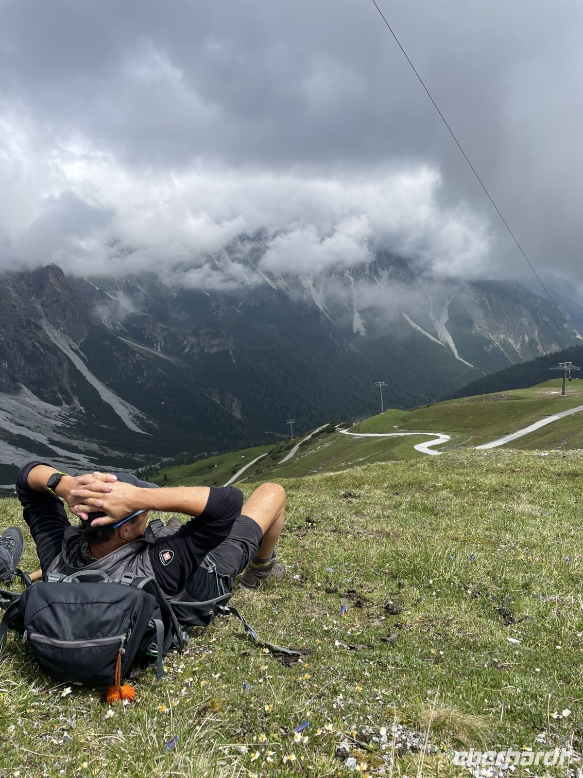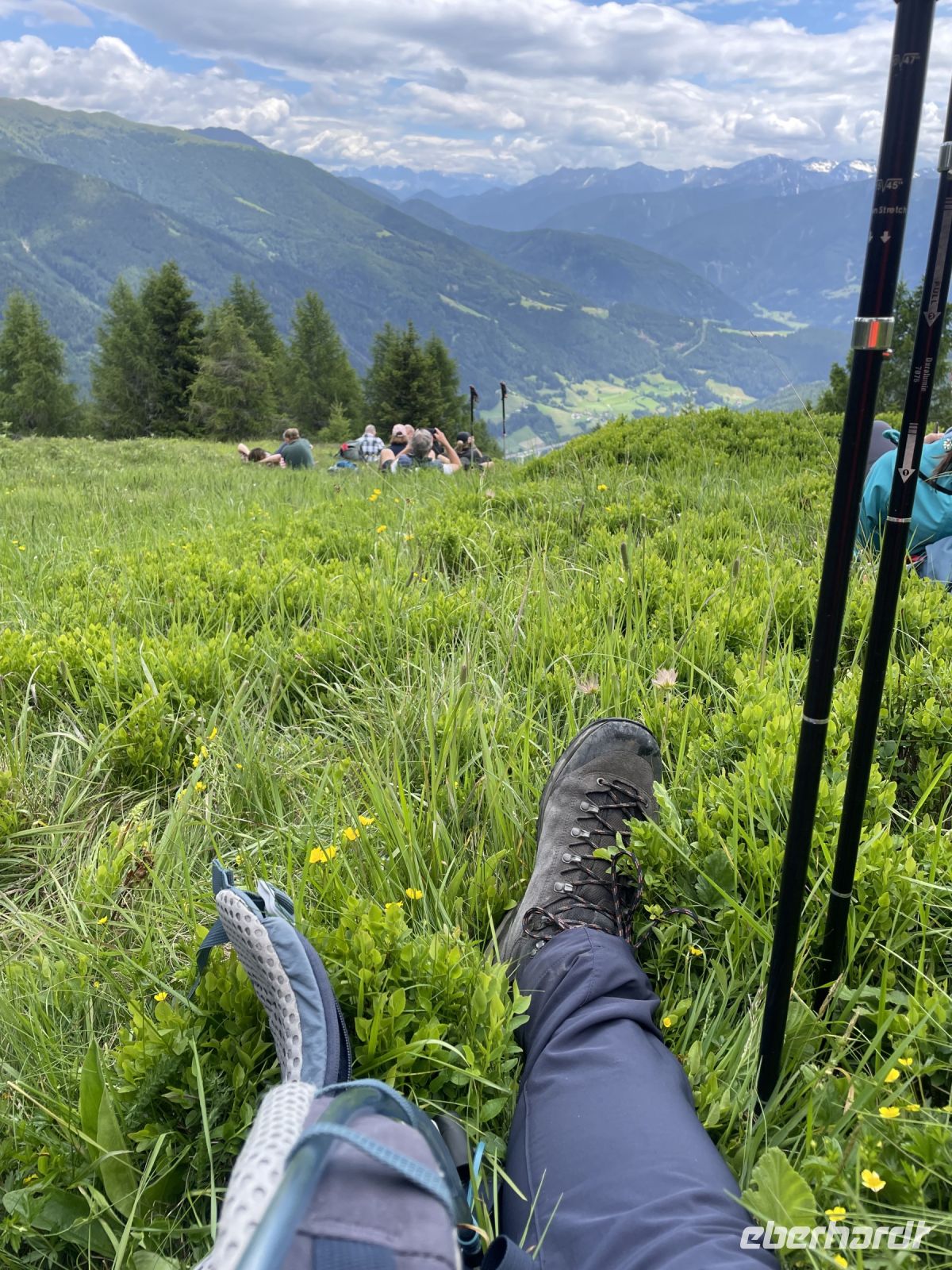 Der erste Eindruck ist erschütternd – Baumaschinen, Kräne, Betonmischer. Idyllisches Bergerleben sieht anders aus. Doch wir wandern gleich los und folgen dem Panoramaweg zur Sennjochhütte. Ein wunderbarer Steig führt uns weiter in die Höhe und wir erreichen das Gipfelkreuz des Niederen Burgstalls (2.436 Meter). Wir sind frohen Mutes, dass sich der Nebel lichtet, doch es zeigen sich nur wenige Gipfel. Während des Abstiegs kommt tatsächlich noch die Sonne zum Vorschein und wir lassen uns sogar wenige Minuten in der Wiese nieder.