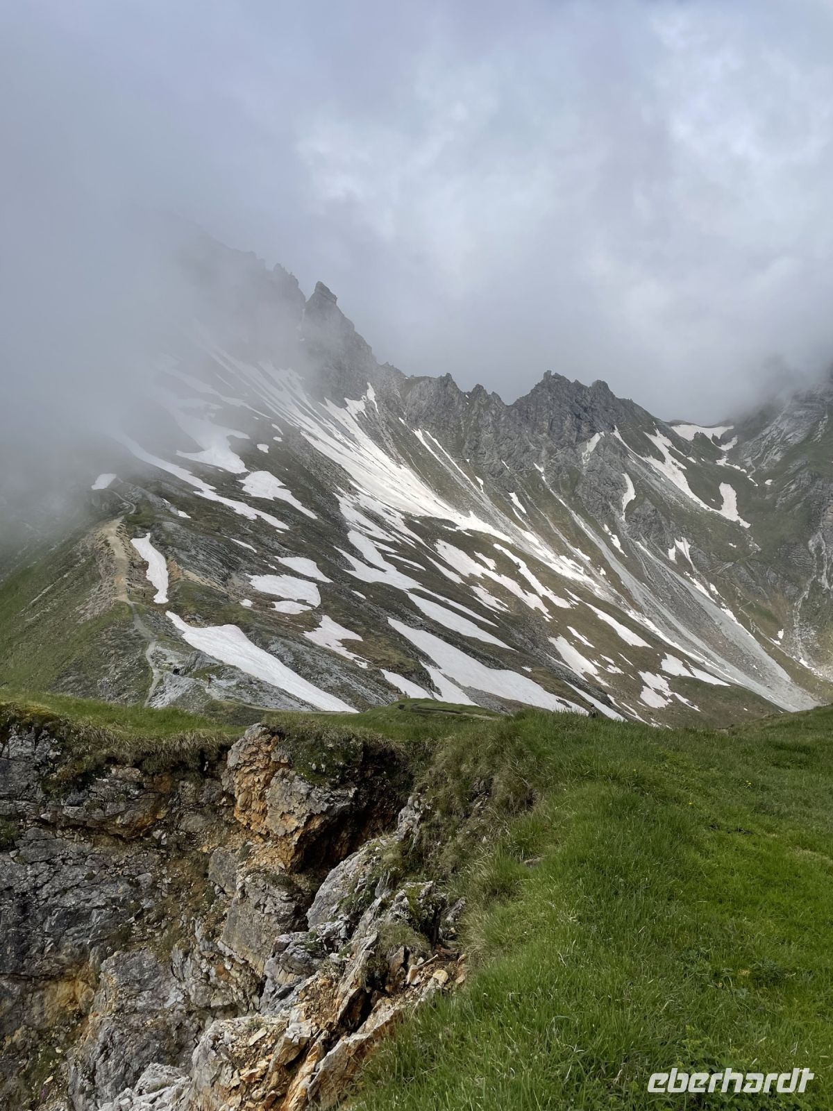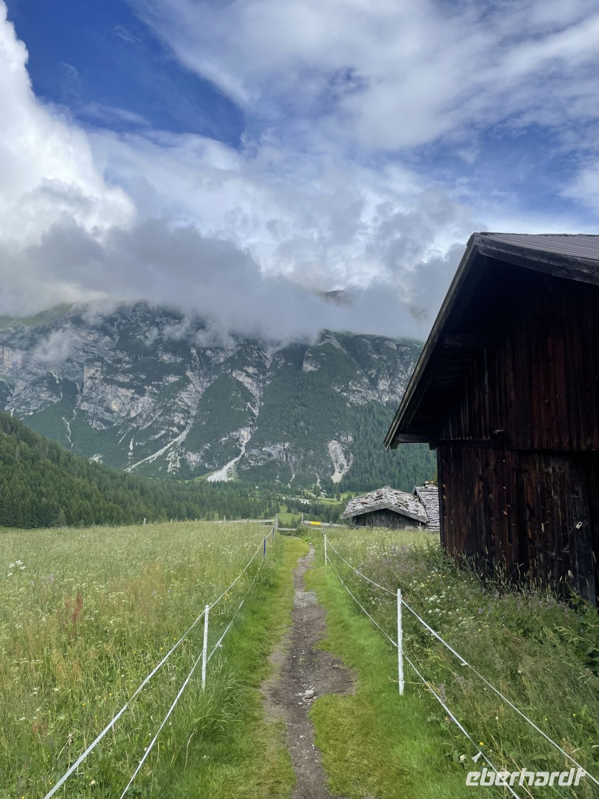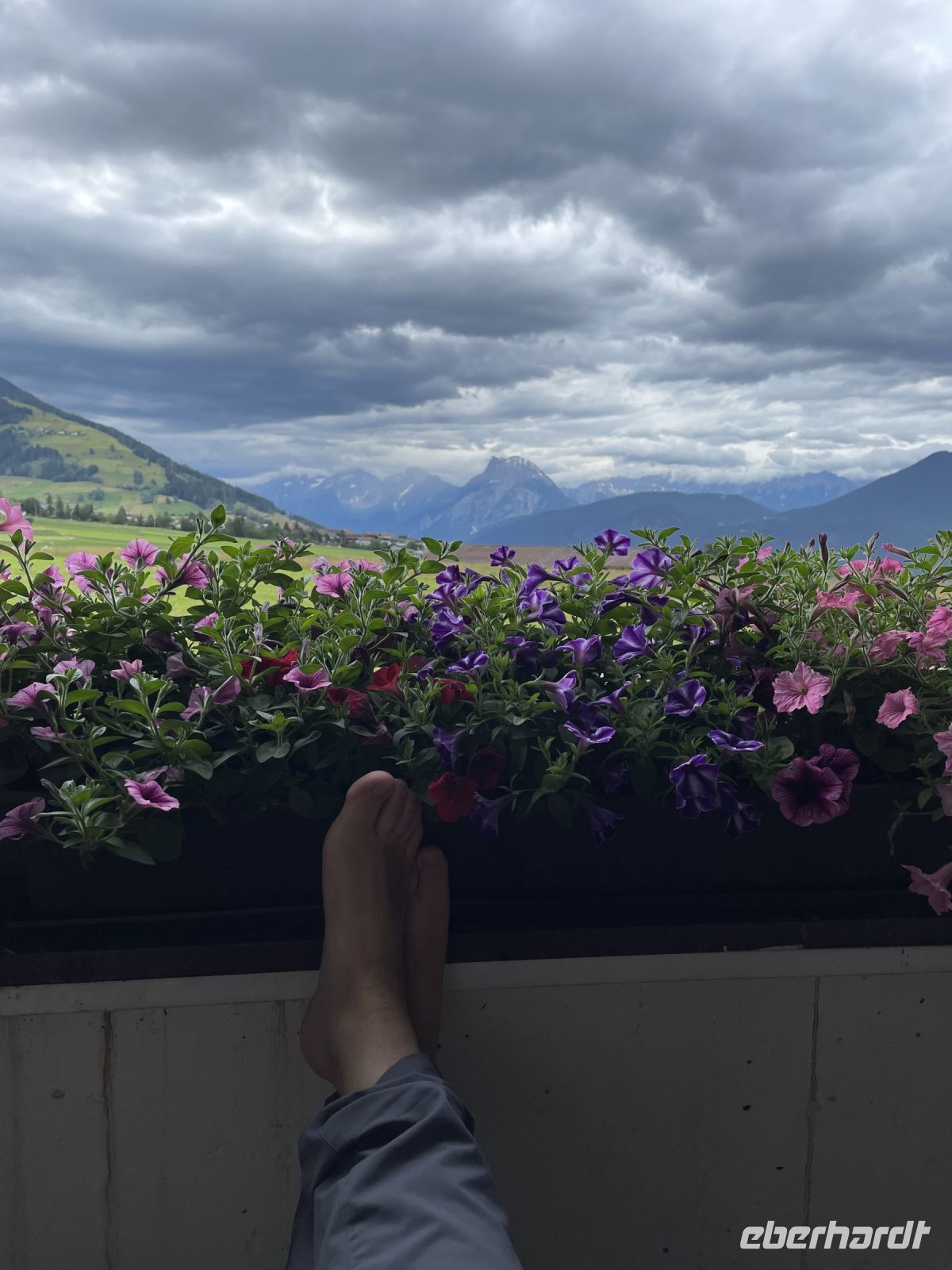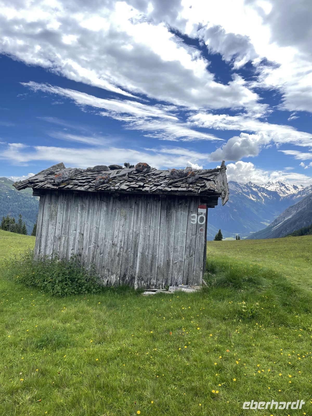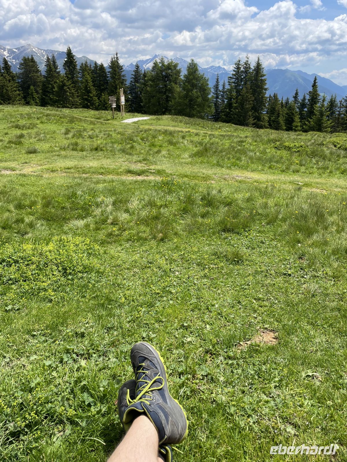 Der erste Eindruck ist erschütternd – Baumaschinen, Kräne, Betonmischer. Idyllisches Bergerleben sieht anders aus. Doch wir wandern gleich los und folgen dem Panoramaweg zur Sennjochhütte. Ein wunderbarer Steig führt uns weiter in die Höhe und wir erreichen das Gipfelkreuz des Niederen Burgstalls (2.436 Meter). Wir sind frohen Mutes, dass sich der Nebel lichtet, doch es zeigen sich nur wenige Gipfel. Während des Abstiegs kommt tatsächlich noch die Sonne zum Vorschein und wir lassen uns sogar wenige Minuten in der Wiese nieder.