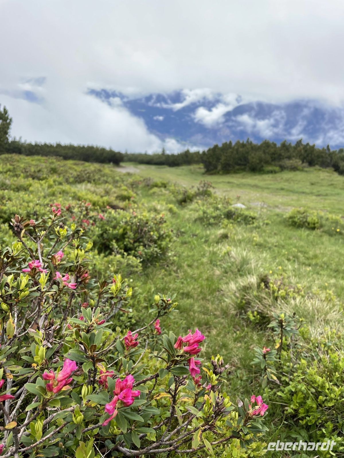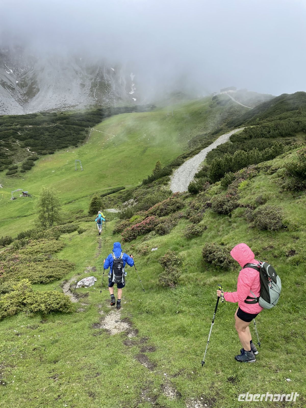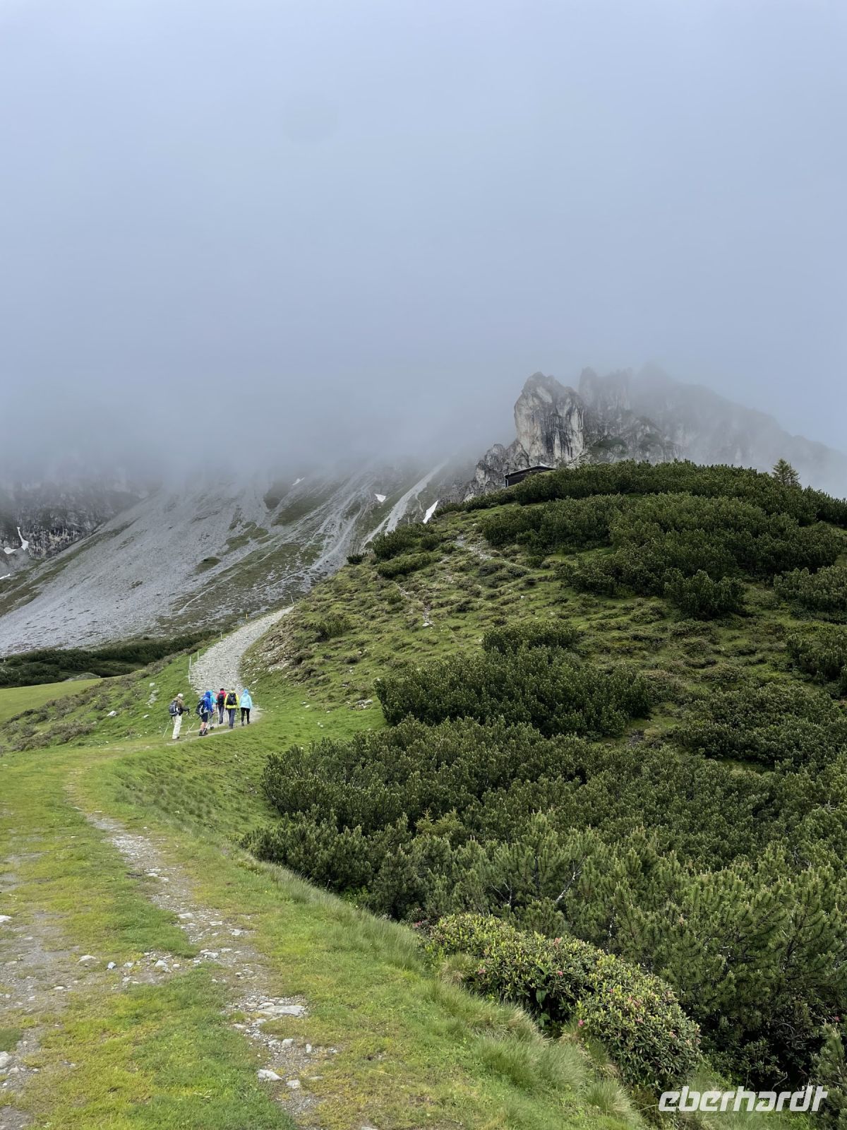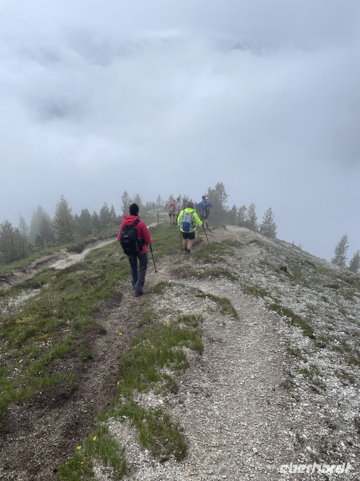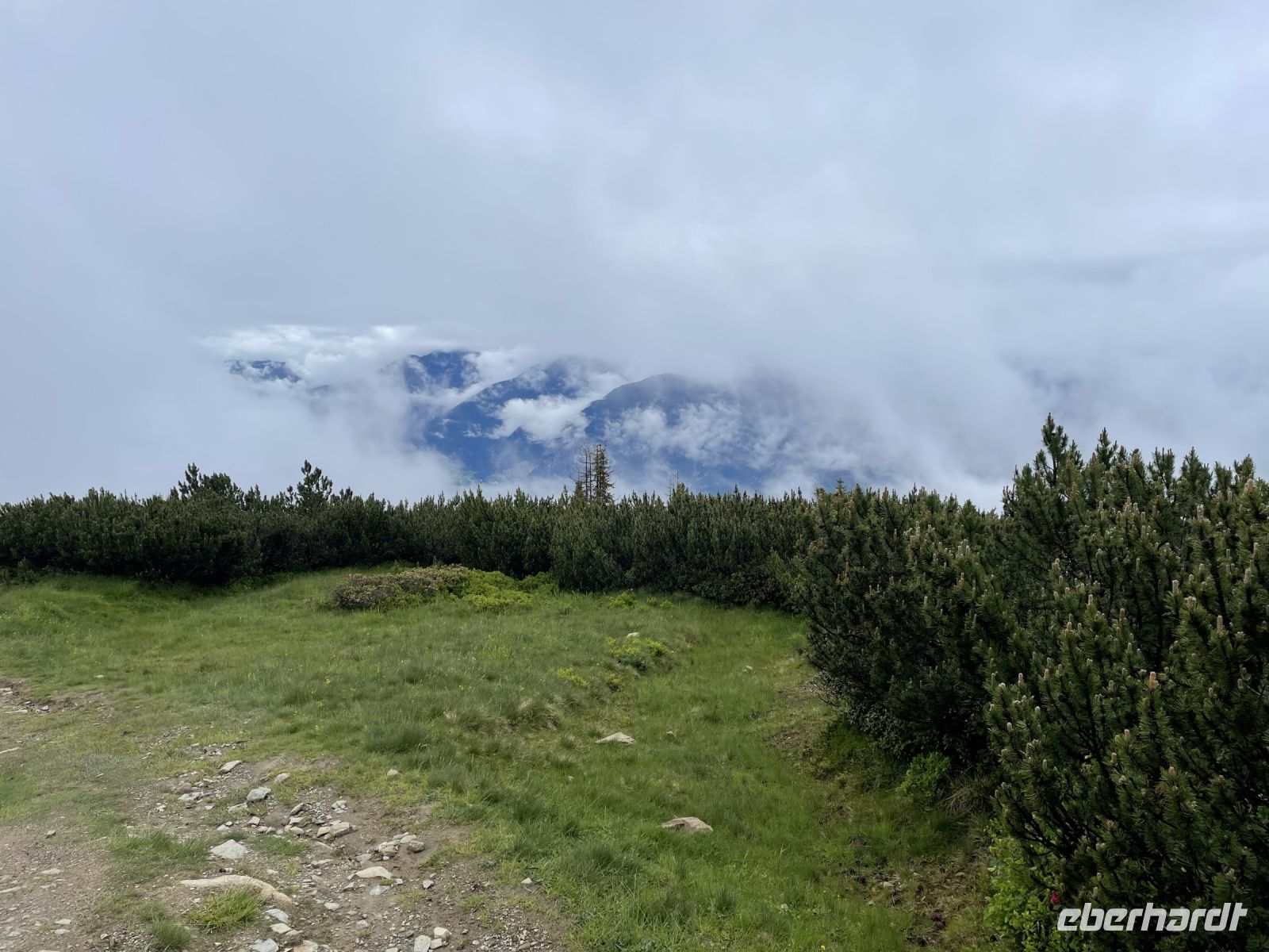 Von der Birgitzeralm steigen wir weiter hinauf durch viele Alpenrosen bis zum Gipfelkreuz des Birgitzköpfl (1.982 Meter). Der Nebel verdeckt uns leider die Sicht auf die Tiroler Bergwelt, doch auch diese mystische Stimmung hat ihren Reiz.