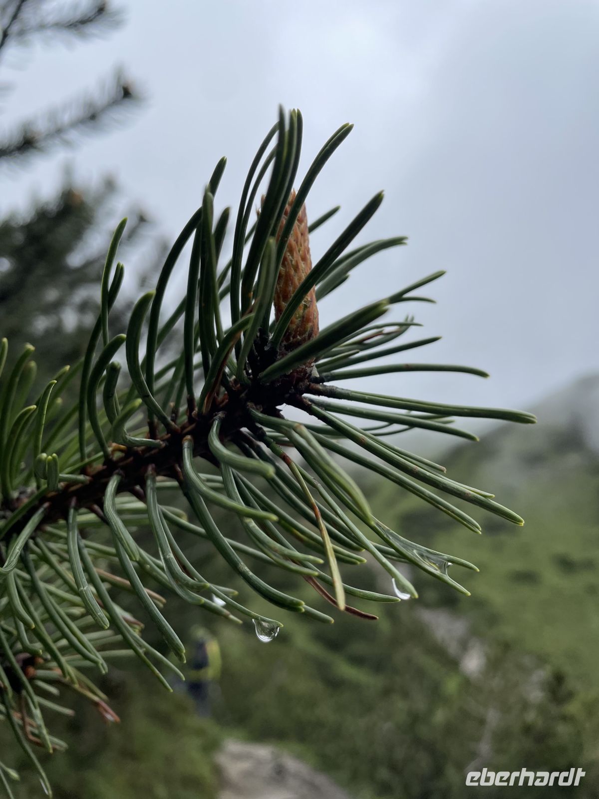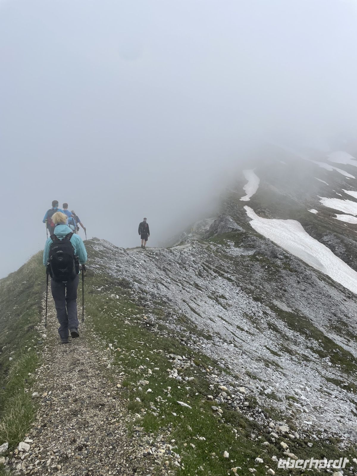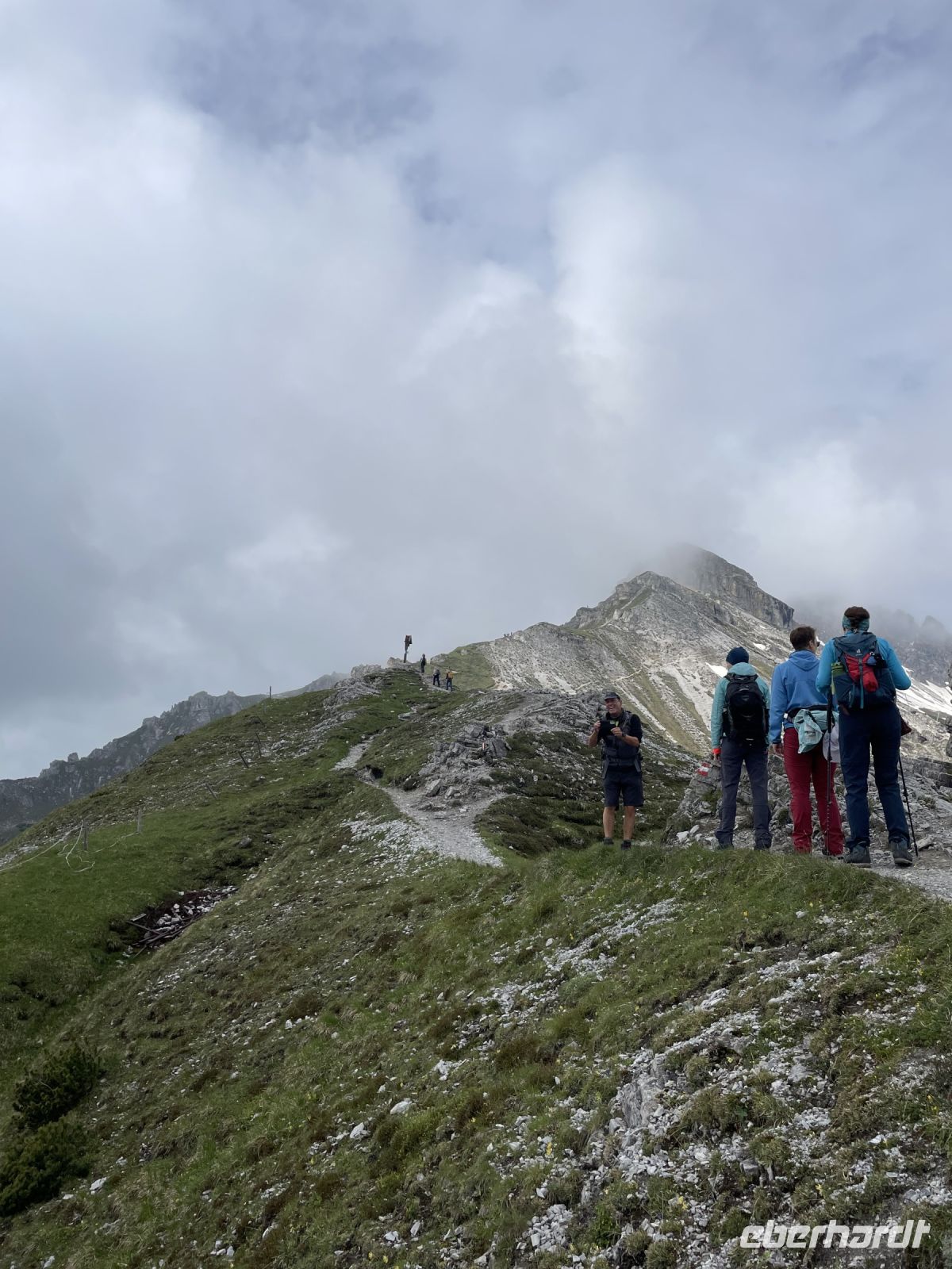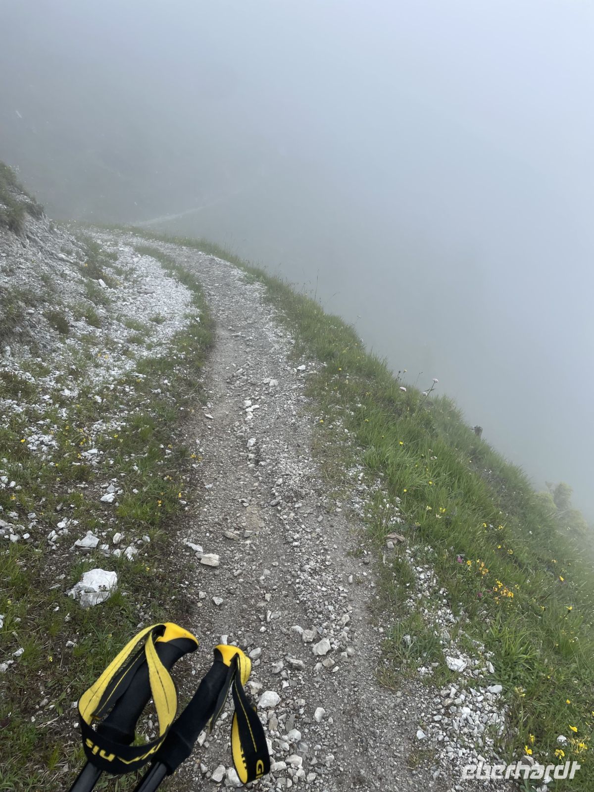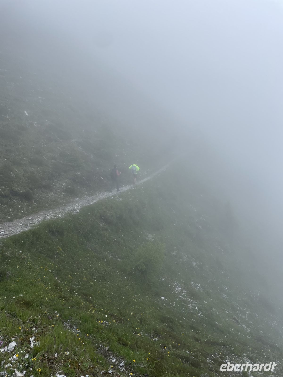 Von der Birgitzeralm steigen wir weiter hinauf durch viele Alpenrosen bis zum Gipfelkreuz des Birgitzköpfl (1.982 Meter). Der Nebel verdeckt uns leider die Sicht auf die Tiroler Bergwelt, doch auch diese mystische Stimmung hat ihren Reiz.