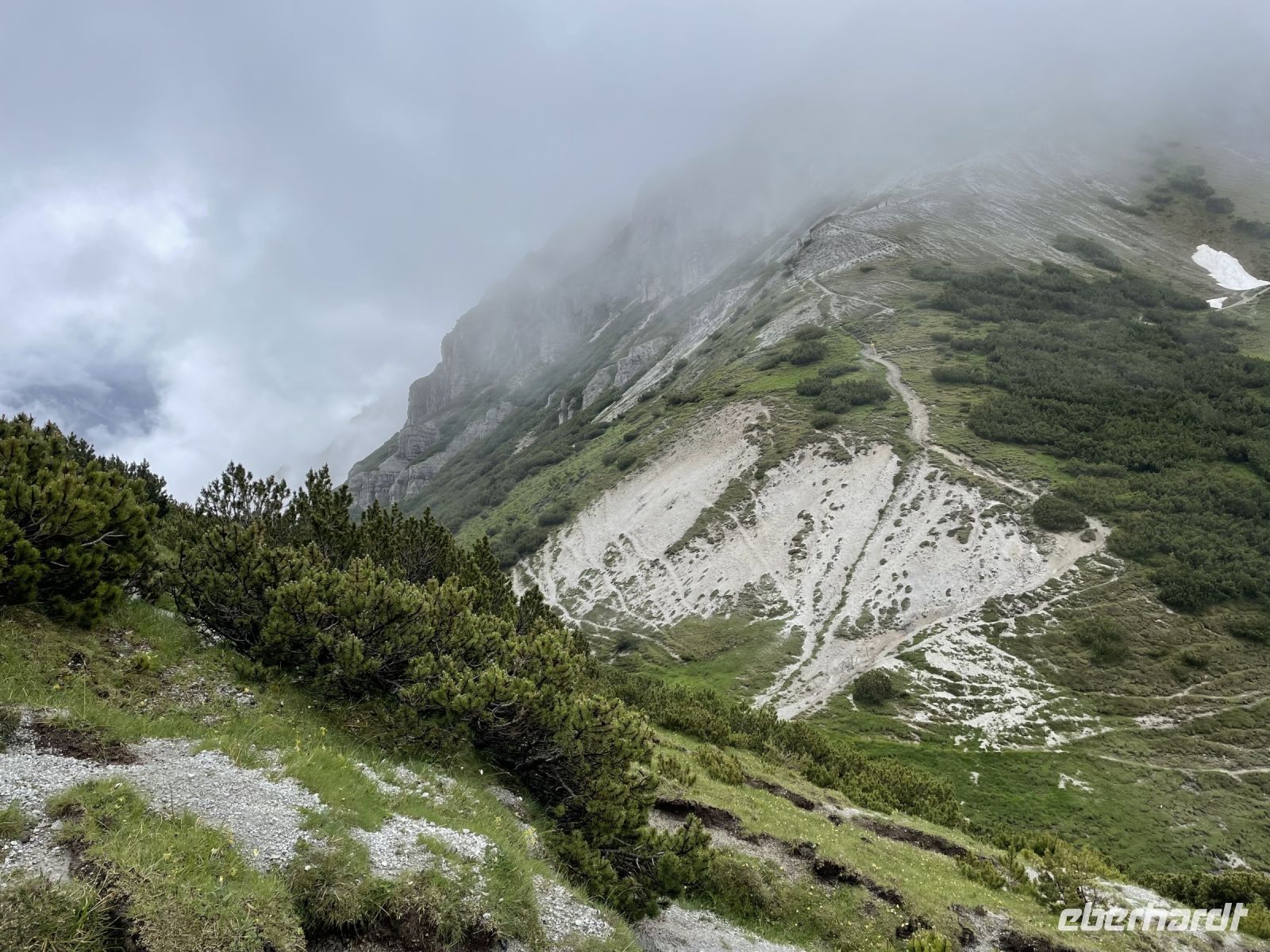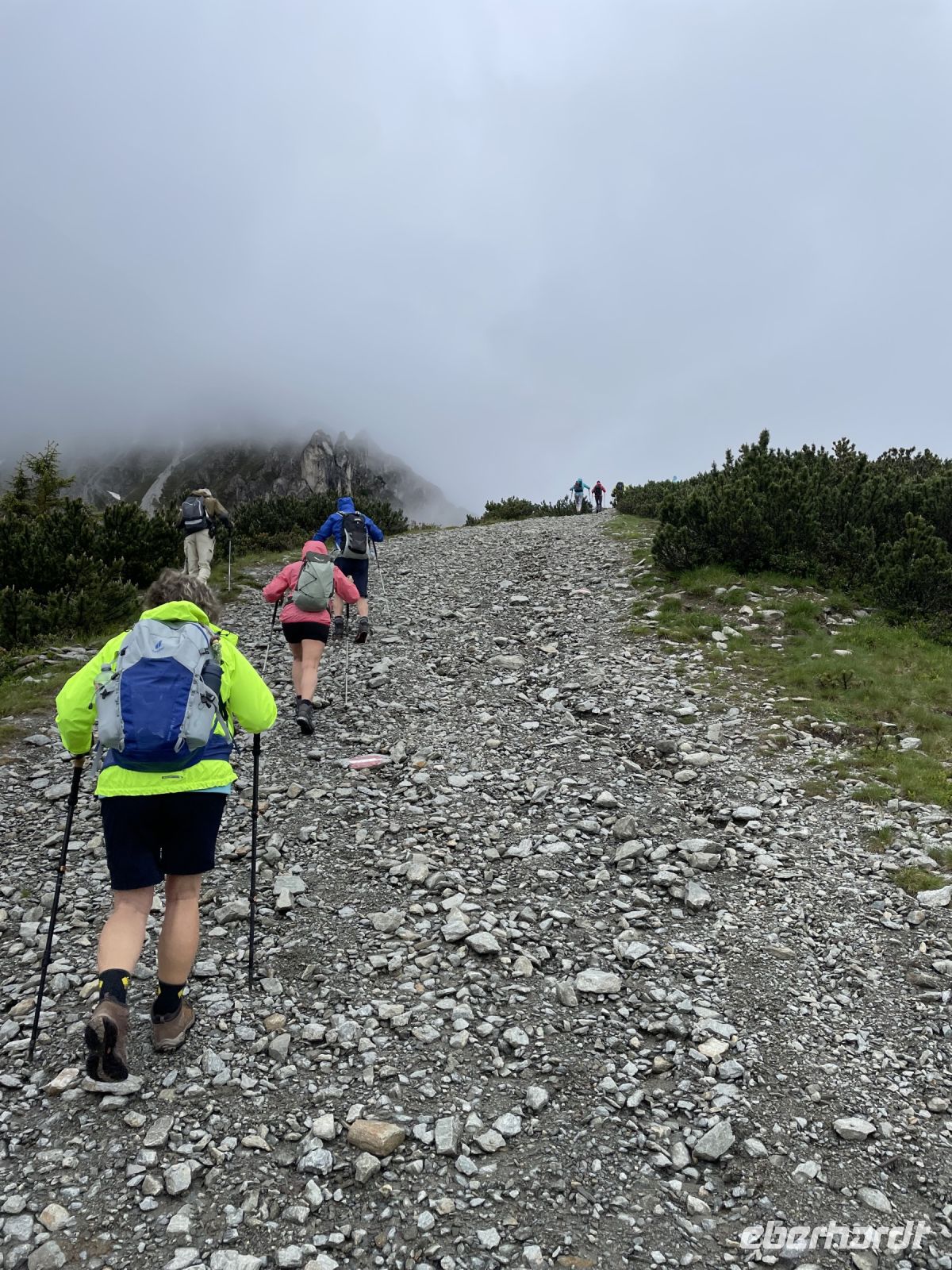 Ein weiterer steiler Anstieg führt uns zur Birgitzköpflhütte, eine Schutzhütte der Naturfreunde Österreich. Durch die raue Bergwelt wandern wir von hier über einen Pfad durch alpines Gelände und entlang der Lawinensicherungsanlagen, steigen immer wieder etwas auf und schließlich erreichen wir nach einem Abstieg das Halsl, Übergang vom Axamer Lizum zum Stubaital.