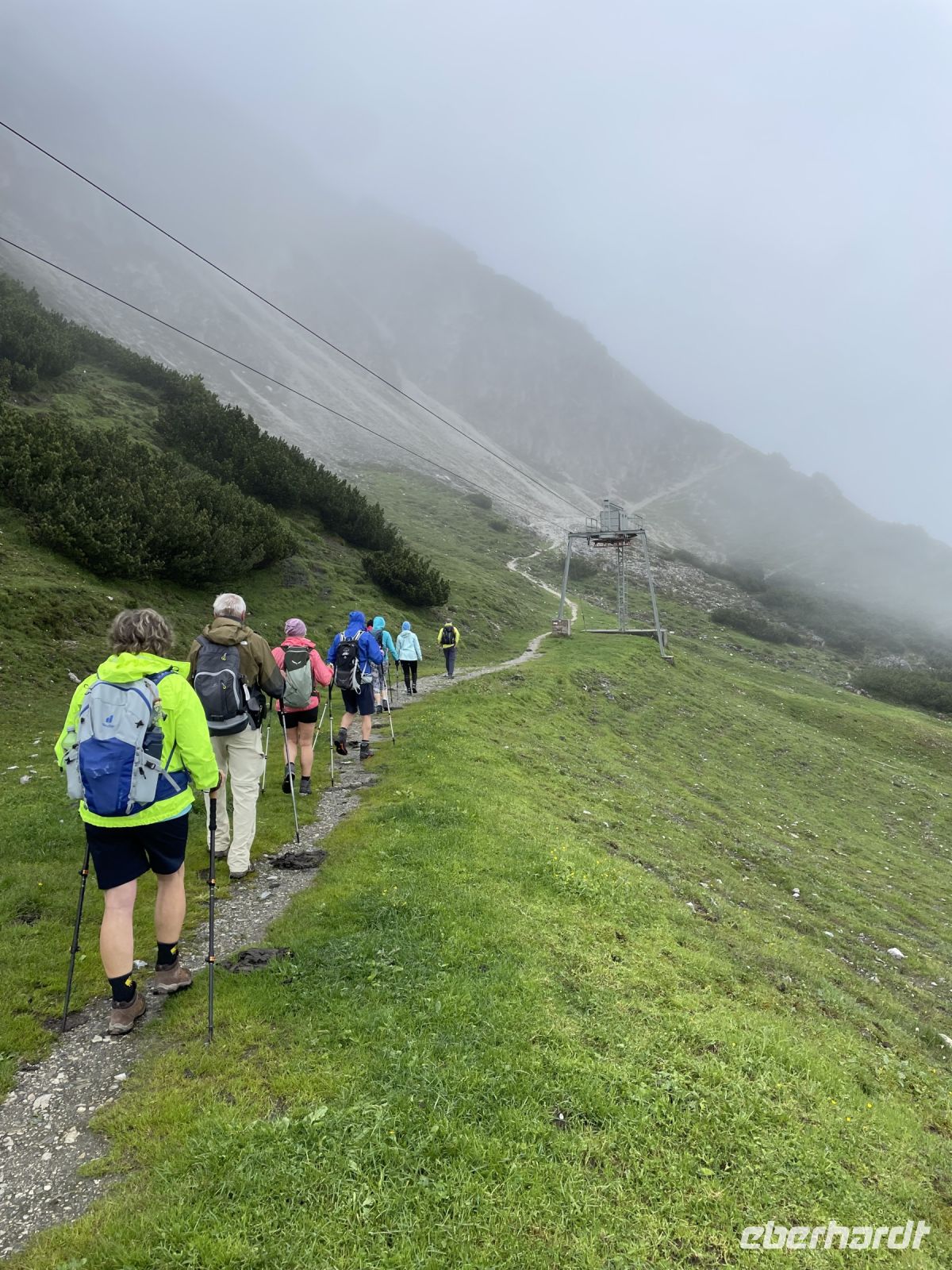 Dieser Tag steht allen zur freien Verfügung im schönen Stubaital oder auch in der Landeshauptstadt Innsbruck. Wir wären aber keine Alpenüberquerer, wenn wir uns heute auf die faule Haut legen würden ?? Mit dem öffentlichen Bus fahren wir bis zur Talstation der Kreuzjochbahn und schweben – leider noch bei dichtem Nebel – hinauf zum Kreuzjoch (2.136 Meter) im Skizentrum Schlick2000.