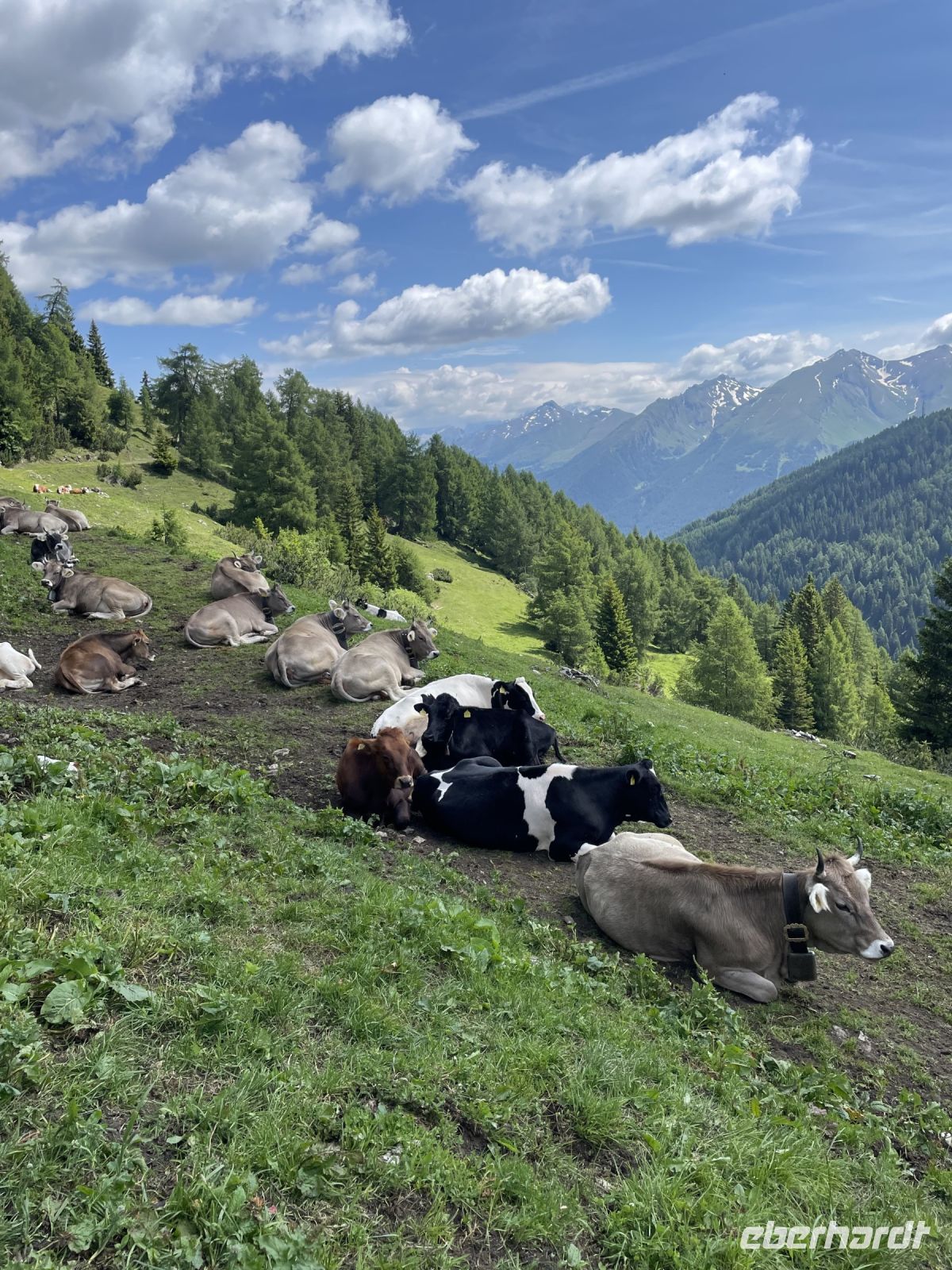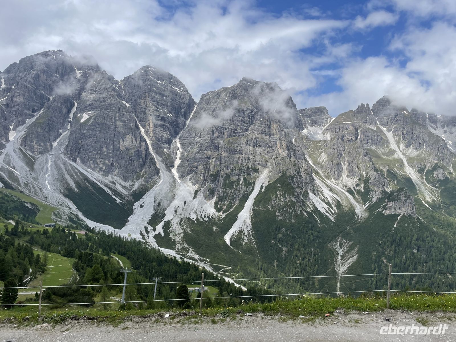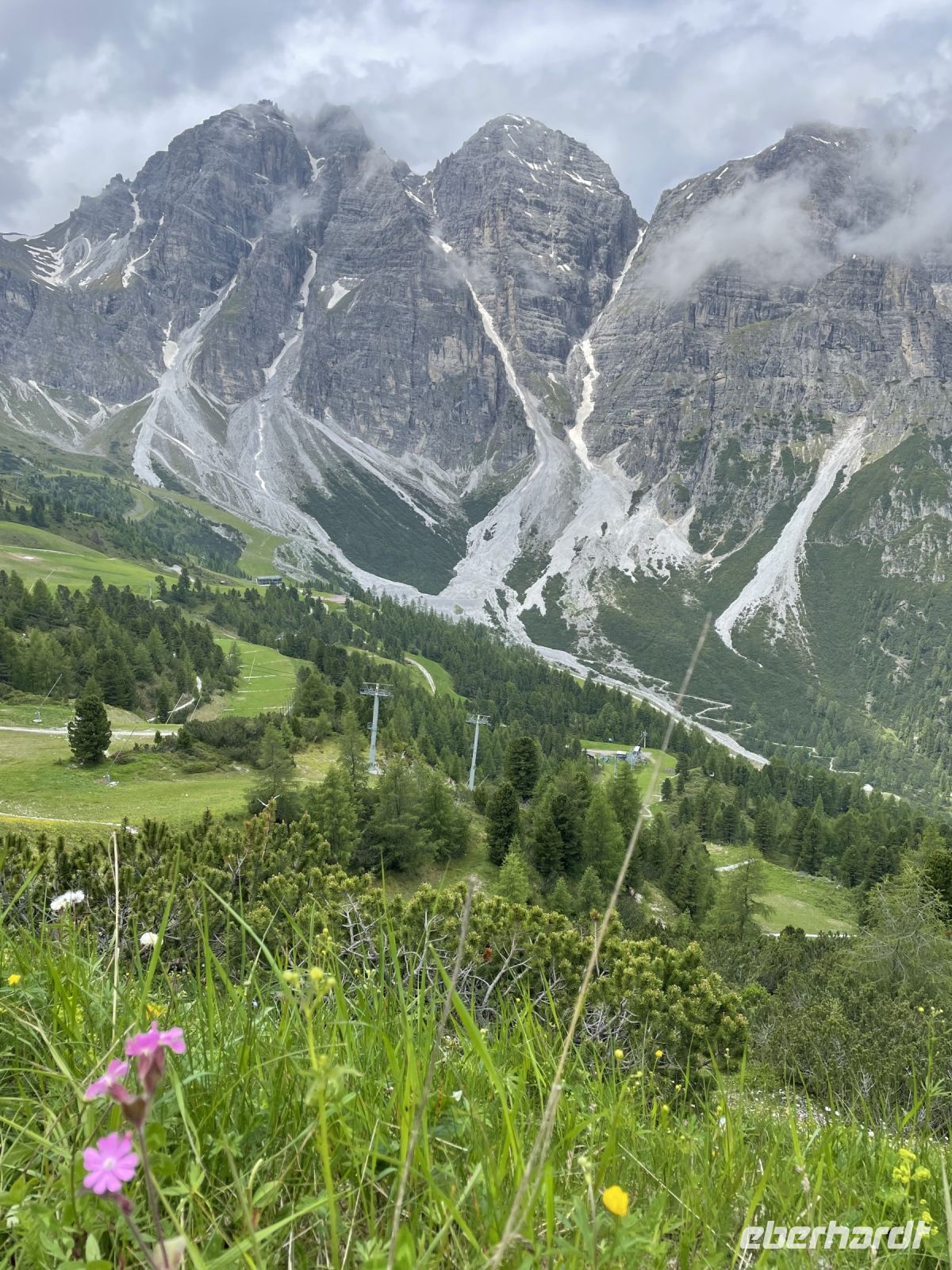 Bevor wir heute zum letzten Mal die Wanderschuhe schnüren, feiern wir den Geburtstag unserer lieben Susi und auch den von Bergführer Rudi. Standesgemäß gibt es eine große Torte zum Frühstück. Unser Hotel Bergkristall liegt ideal – direkt an der Talstation der Ladurns Seilbahn, die uns hinauf zur Ladurner Hütte bringt. Der Tag verspricht super zu werden und so genießen wir schon während der Auffahrt ein grandioses Bergpanorama.