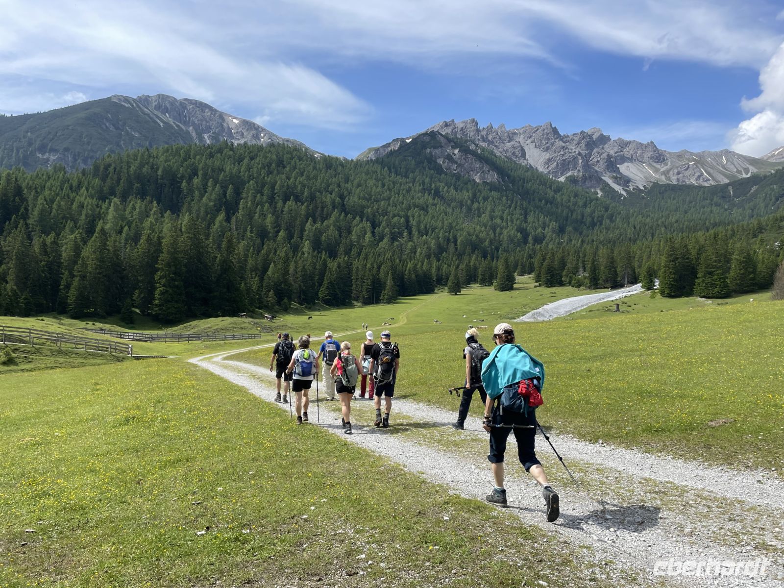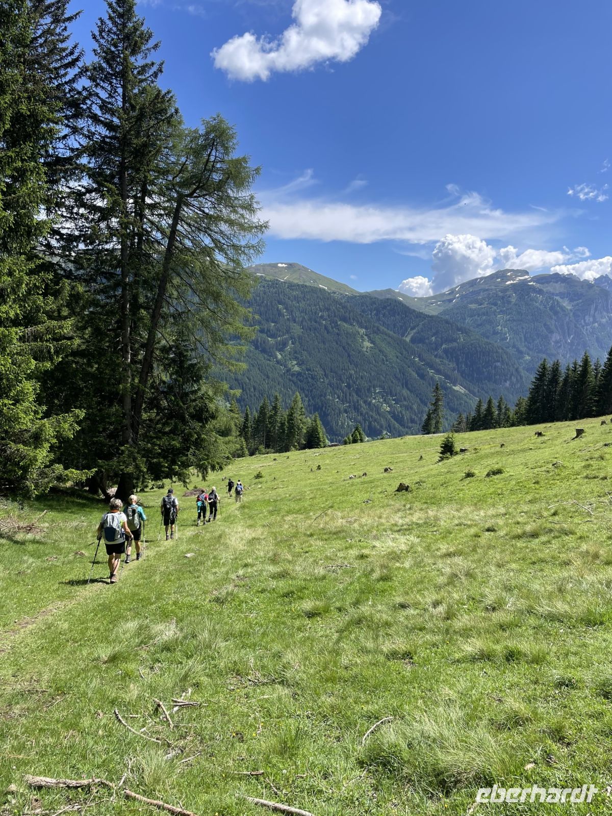 Der angenehm zu gehende Abstieg führt uns durch farbenfrohe Almwiesen und durch einen Zirbenkiefernwald hinunter ins Obernbergtal, ein eher unbekanntes Seitental im Wipptal am Brenner. Es ist eine der geheimsten Ecken in Tirol - zum Glück! Denn dadurch ist es eines der letzten Täler in den Alpen, das wirklich naturnah und ruhig ist. Das letzte Stück unserer Wanderung gehen wir ganz gemütlich am Bach entlang, der förmlich dazu einlädt, die Füße ins kühle Nass zu stellen. Wir erreichen Almis Berghotel, ein uriges, familiengeführtes Wanderhotel mit einem ganz besonderen Charme und außerordentlicher Gastfreundschaft. Wir genießen Kaffee und Kuchen, Eis oder ein Bierchen auf der Sonnenterrasse und die Herrlichkeit dieses Tals! Ein privater Bus holt uns hier ab und bringt uns zur heutigen Unterkunft nach Steinach am Brenner.