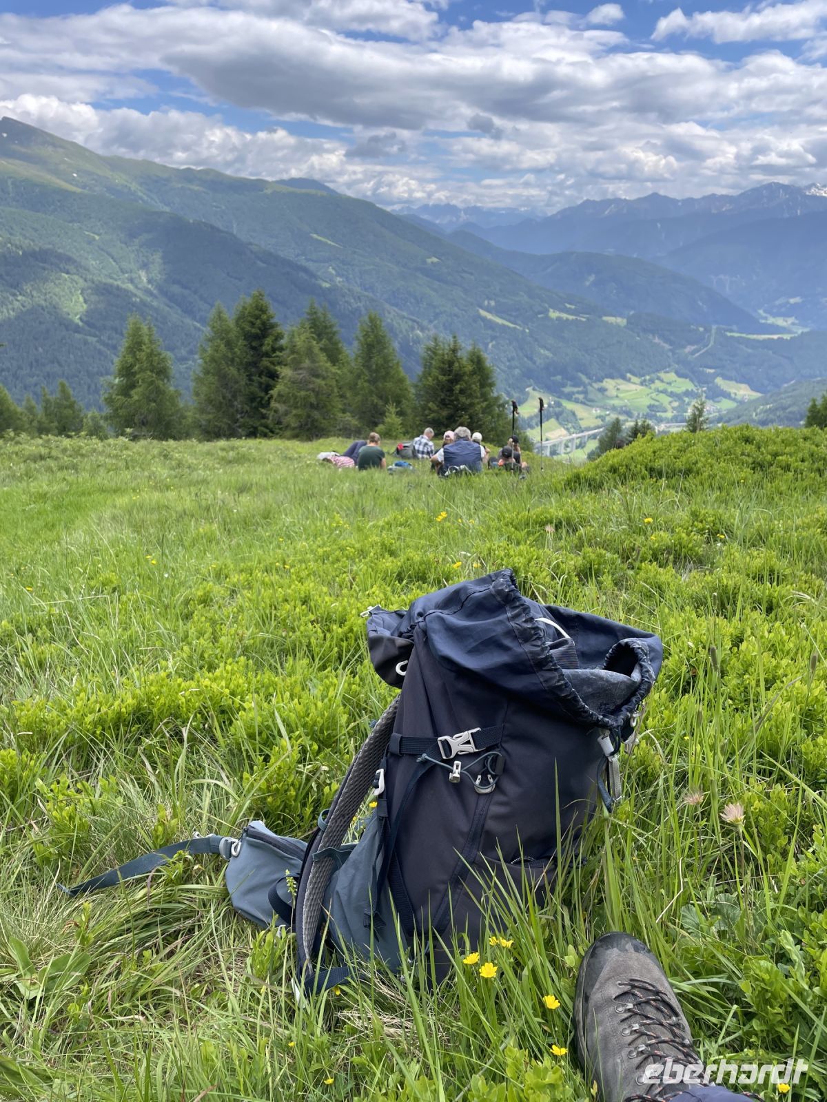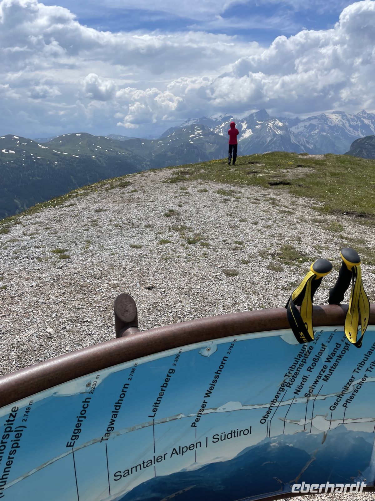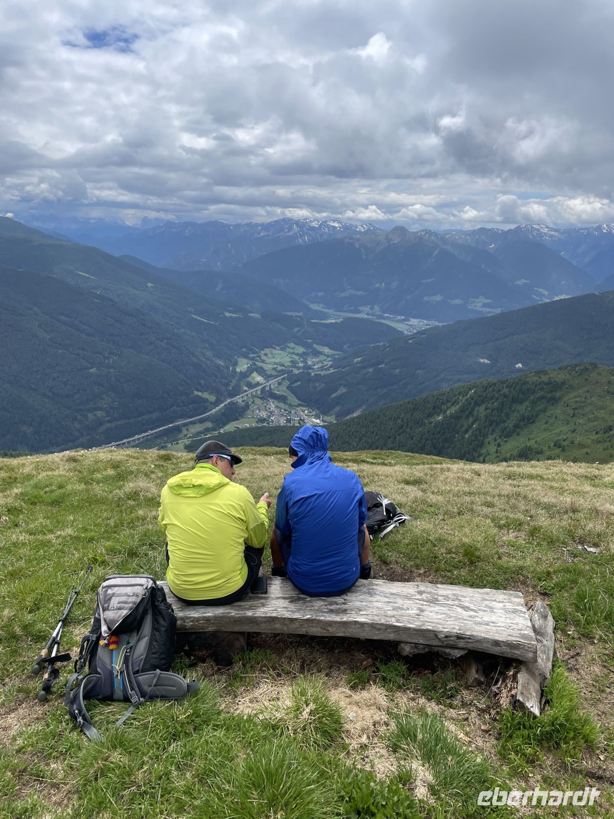Da der Regen doch nicht einsetzt, entscheiden wir uns für den zusätzlichen Aufstieg zum Hohen Lorenzenberg (2.313 Meter) und genießen von hier einen traumhaften Blick auf unser Ziel Gossensaß und weiter nach Sterzing.