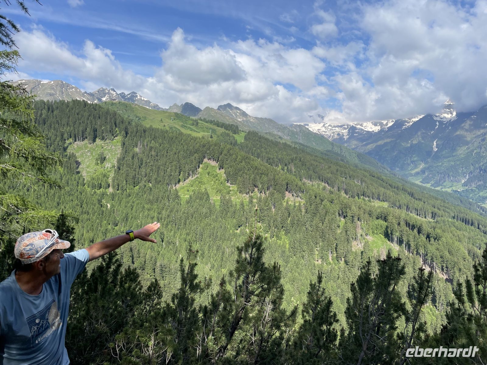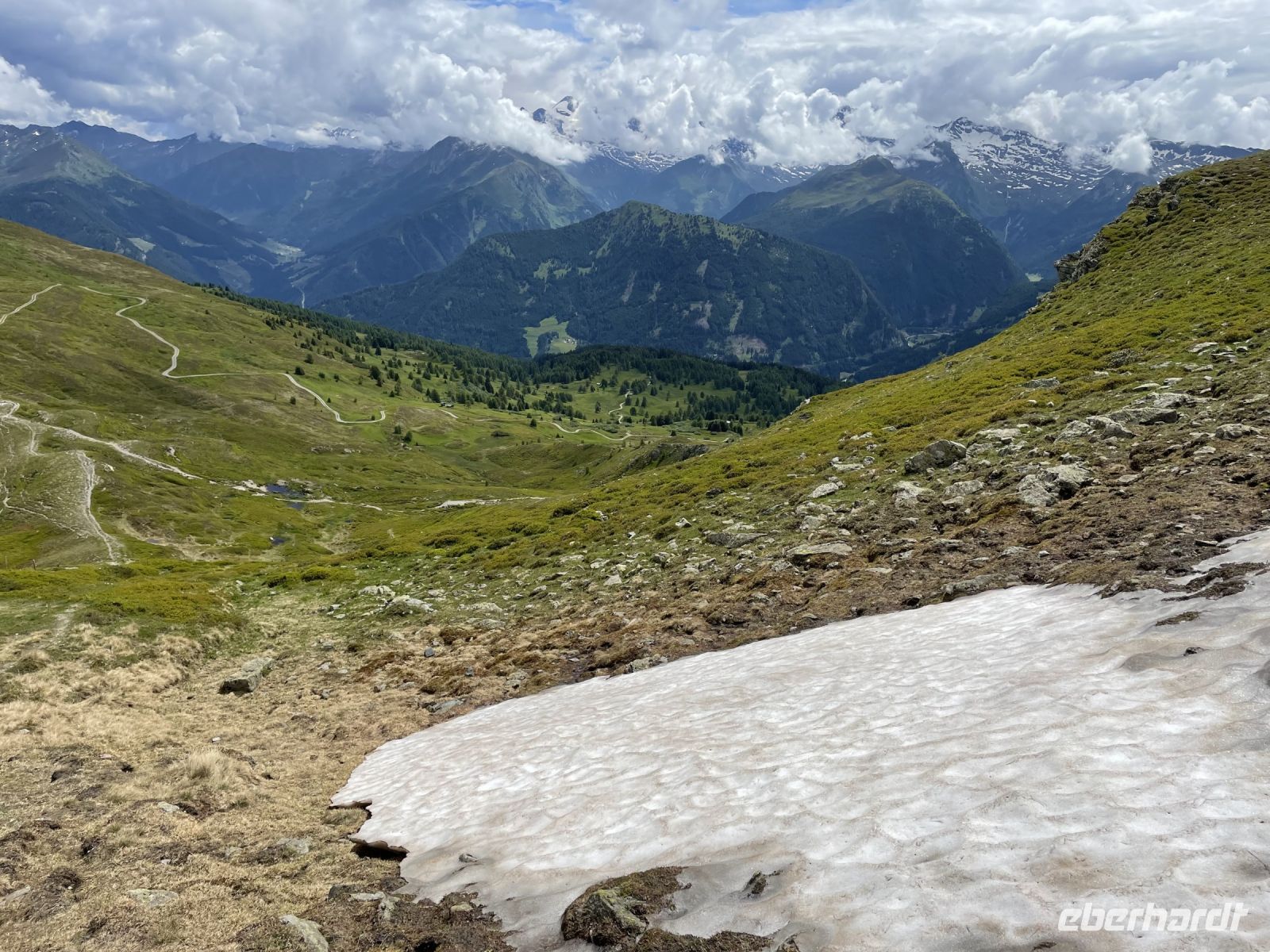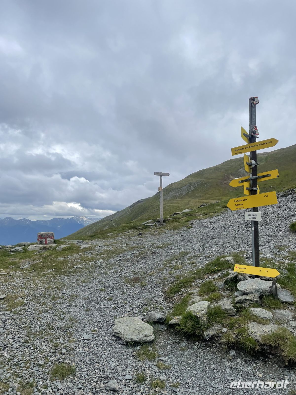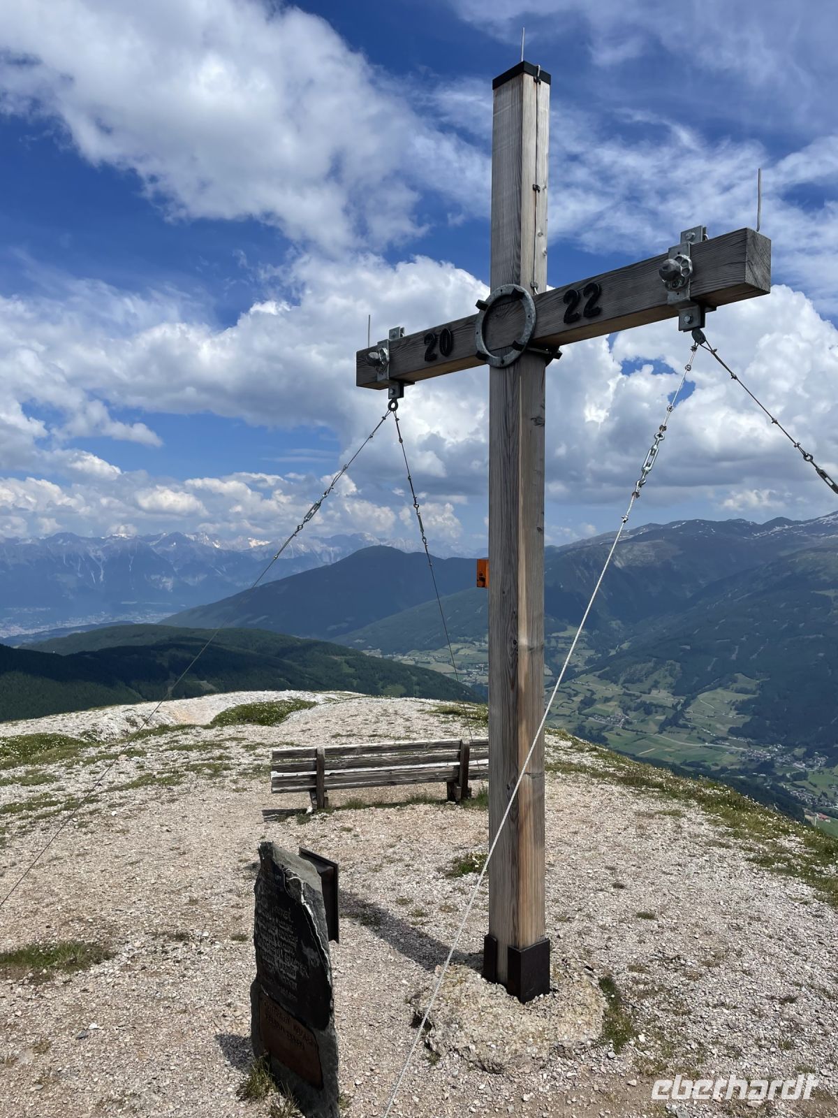Da der Regen doch nicht einsetzt, entscheiden wir uns für den zusätzlichen Aufstieg zum Hohen Lorenzenberg (2.313 Meter) und genießen von hier einen traumhaften Blick auf unser Ziel Gossensaß und weiter nach Sterzing.