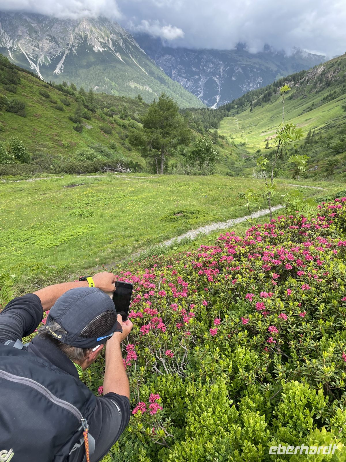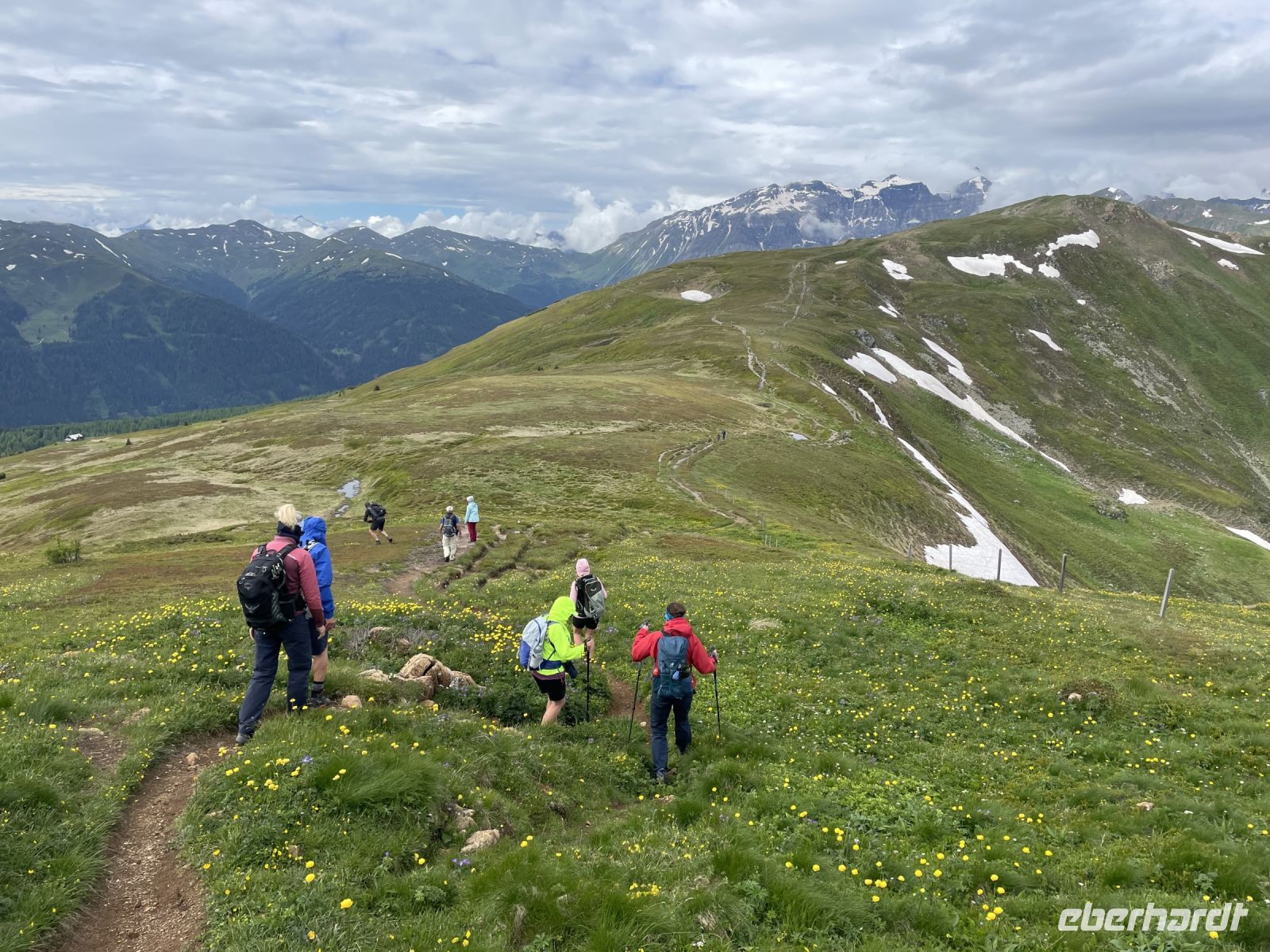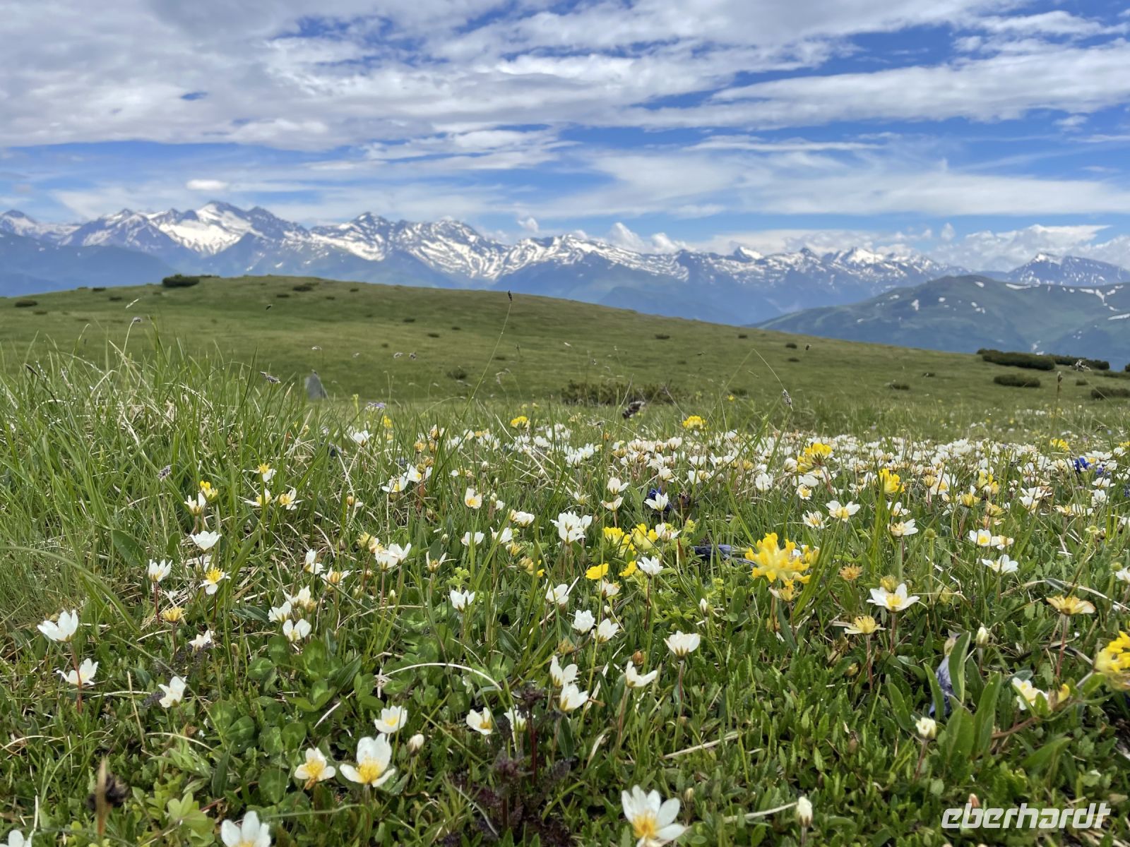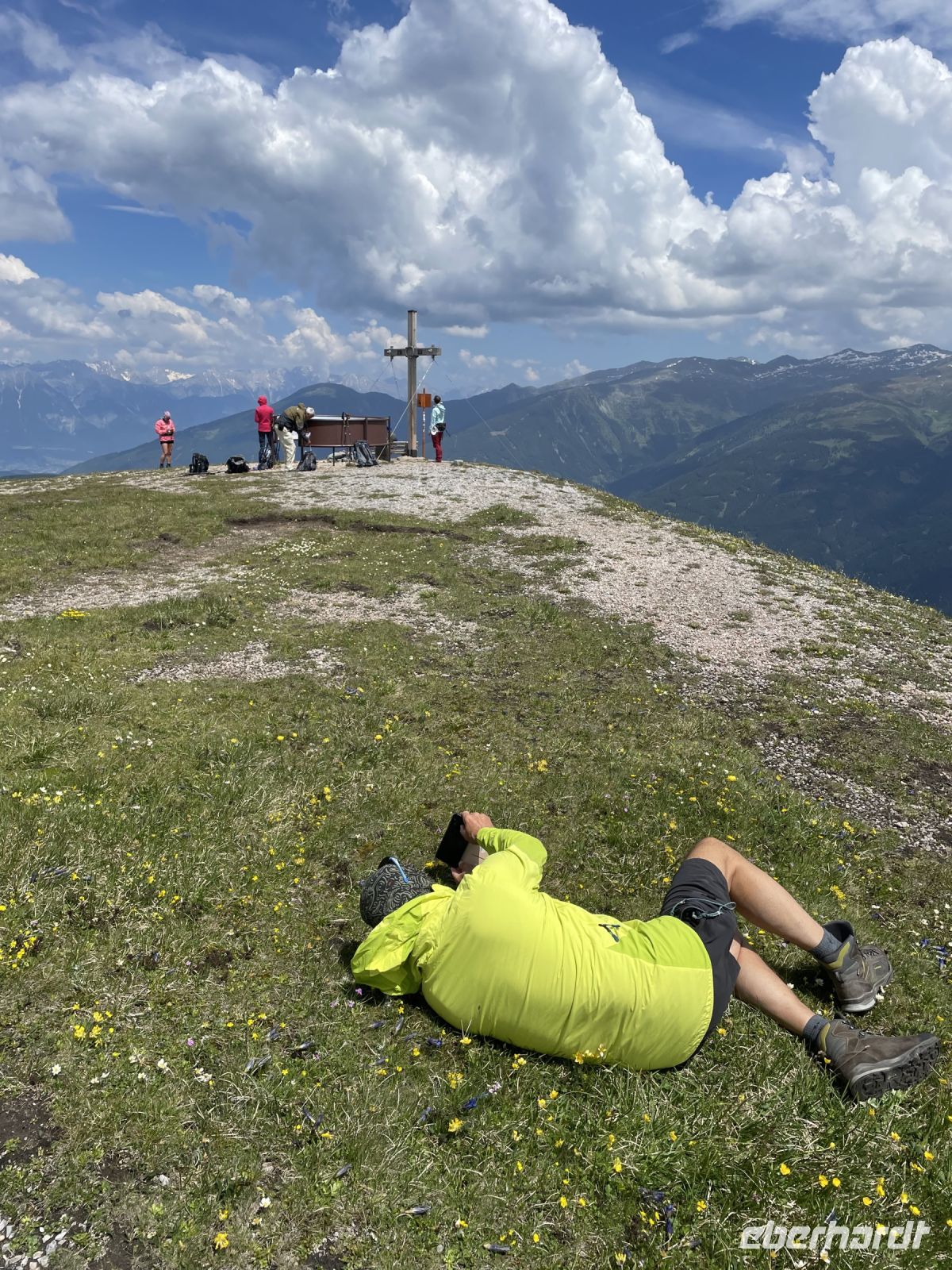 Doch der Aufstieg ist noch nicht ganz geschafft. Stetig steigend erreichen wir die Blaserhütte, die wir aber auch vorerst „rechts liegen“ lassen. Wir möchten den Gipfel des Blasers, den Blumenberg Tirols, erklimmen. Diesen erreichen wir auf einem Wiesenweg und sind von der Vielfalt der Blumen und Blüten überwältigt. Die gigantische Aussicht setzt dem Ganzen noch die Krone auf.