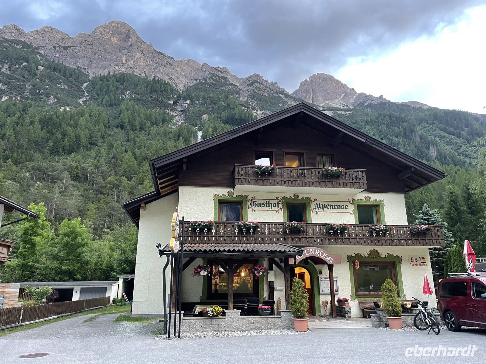 An der Blaserhütte (2.176 Meter) machen wir unsere Brotzeit und treffen die einzig richtige Entscheidung, den drohenden Regenguss abzuwarten. Wir bekommen von der netten Wirtin Anja einen schönen Platz im Gastraum und verweilen hier eine Stunde, bis der Regen verzogen ist. Trockenen Fußes steigen wir anschließend auf der Forststraße hinab ins Gschnitztal und werden von einem bestellten Transfer von Trins talwärts zur heutigen, recht urigen Unterkunft nach Geschnitz gebracht. Nach dem vorzüglichen Abendessen treffen wir zufällig die nette Hüttenwirtin der Blaserhütte mit Ihrem Mann und lassen gesellig den Abend ausklingen.