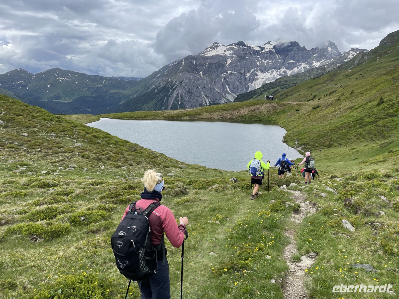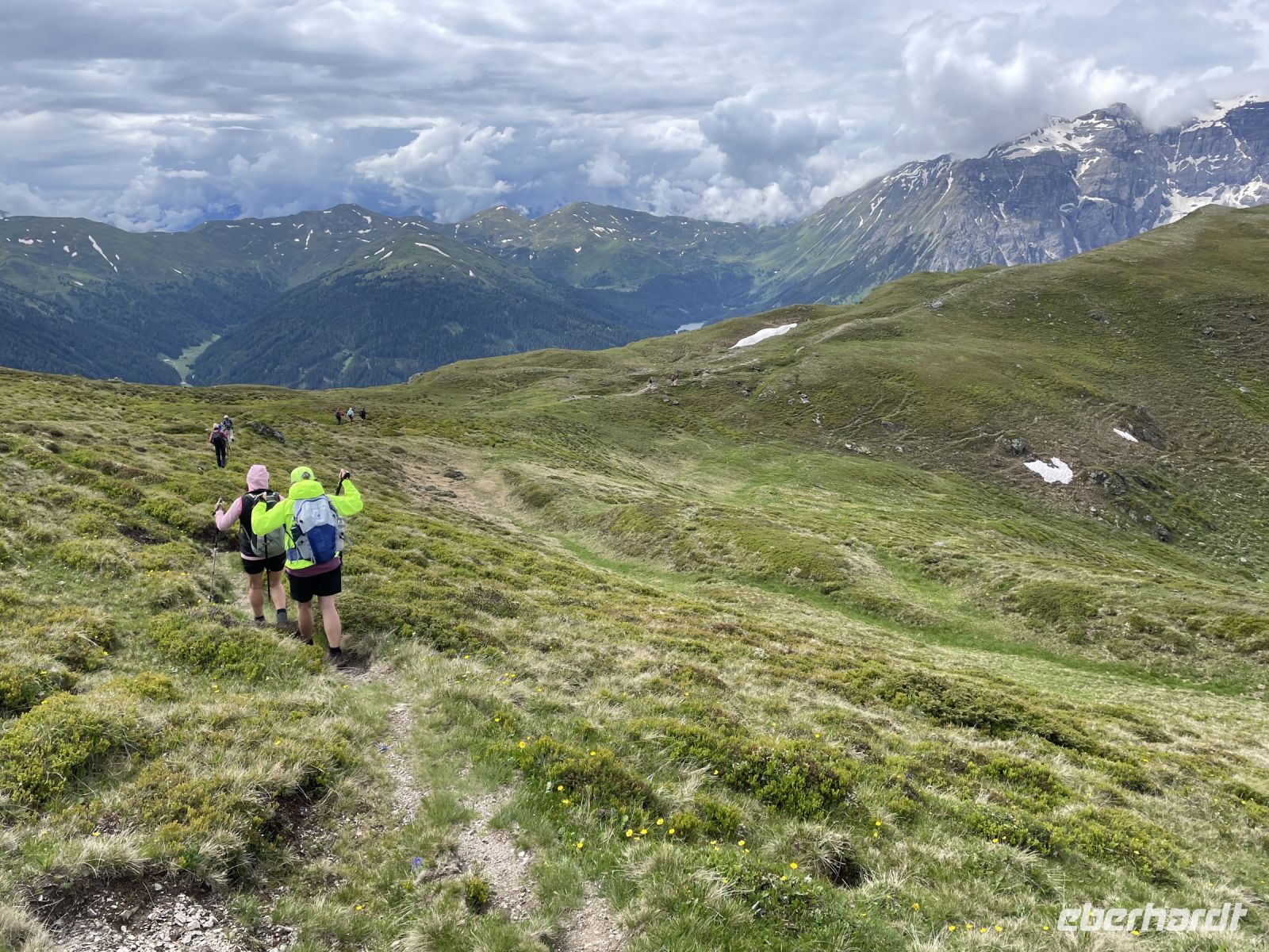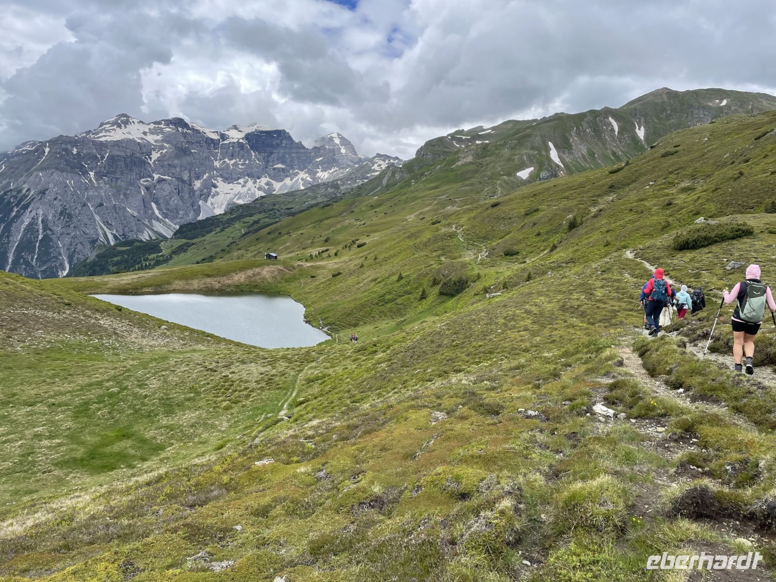 Über das Eggerjoch (2.132 Meter) steigen wir steil hinauf zum Leitnerberg (2.309 Meter), der höchste Punkt unserer gesamten Tour. Es pfeift ein frischer Wind, daher steigen wir nun hinab zum malerischen Lichtsee. Dieser liegt in einer Mulde unterhalb des Trunajochs auf ca. 2.110 Metern Höhe und besitzt eine hervorragende Wasserqualität. Nun kommt pünktlich zur Mittagsjause auch die Sonne raus und wir genießen die herrliche Natur, die traumhaften Ausblicke und die wärmenden Sonnenstrahlen.