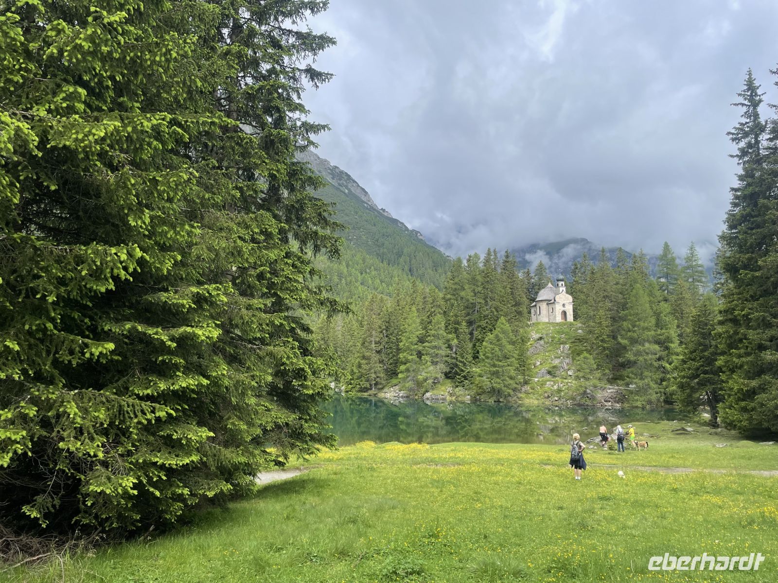 Das Frühstück im JUFA Hotel Wipptal lässt keine Wünsche offen und so starten wir bestens gestärkt in den Tag. Die Koffer werden wieder für den Weitertransport verladen und unsere Patientin wird ins Zentrum von Steinach zum Arzt gebracht. Wir Wanderer werden mit einem privaten Taxi hinein ins schöne Obernbergtal gebracht. Am Tal-Ende starten wir gemütlich auf einem Forstweg in Richtung Obernberger See. Auf Betriebstemperatur kommen wir auf dem Wiesenweg, der uns zum idyllisch gelegenen See führt. Es ist ein echtes Juwel inmitten der Tiroler Alpen, von majestätischen Bergen umgeben und dichten Wäldern geschützt. Das türkisblaue Wasser ist einfach traumhaft. Wir umrunden den See teilweise und machen an der kleinen Kapelle „Maria am See“ auf der Halbinsel eine kleine Pause für das Morgengebet. Nun beginnen wir den anspruchsvollen Aufstieg zum Sandjoch. Hier ist der Weg das Ziel und wir wandern wieder durch farbenfrohe Almwiesen, durch ein Meer von Alpenrosen und immer mit dem Blick zum Alpenhauptkamm. Wir passieren die Waldgrenze und schließlich auch die Landesgrenze zu Italien. Der Wind pfeift kräftig und wir suchen uns einen windgeschützten Platz an der kleinen Schutzhütte auf italienischer Seite.