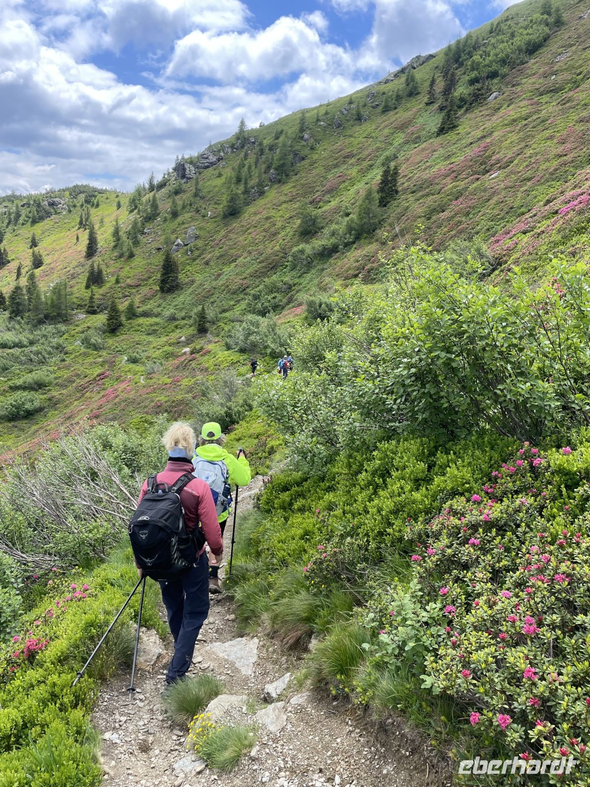 Der Abstieg hinunter nach Gossensaß im italienischen Pflerschtal führt und wieder durch eine wilde und bunte Alpenvegetation auf einem angenehm absteigenden Pfad. Am Ende des Wanderweges oberhalb von Gossensaß steht schon der Transfer für die Fahrt zum Hotel bereit. Heute übernachten wir im Hotel Bergkristall im inneren Pflerschtal. Auf der Sonnenterrasse gönnen wir uns einen Apfelstrudel mit oder/und Sahne, Kaffee oder oder oder… ??