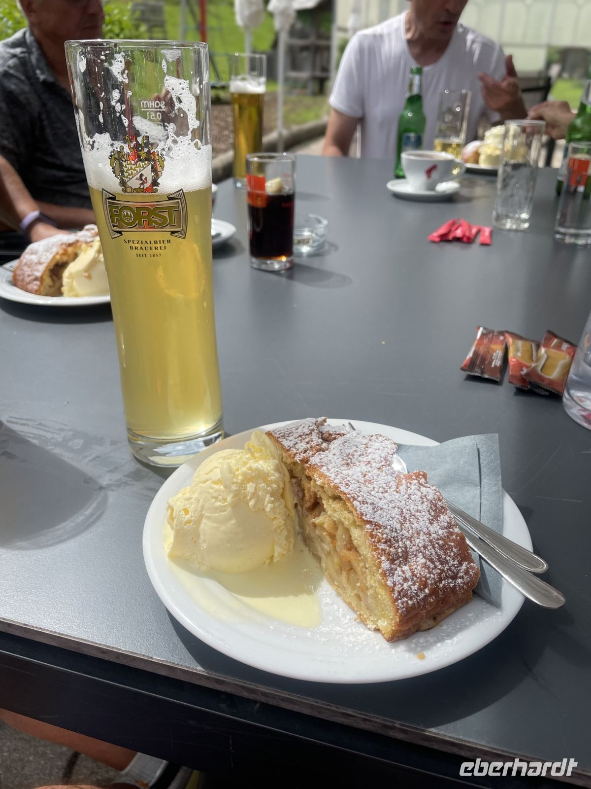 Am Krankenhaus in Hochzirl erwarten uns schon die beiden Taxen, die uns zum nächsten Hotel bringen. Wir übernachten heute im MONDI Hotel in Axams. Die Sauna und auch der Innenpool werden gern genutzt und zum Abendessen werden wir kulinarisch verwöhnt – diese Marillenknödel! ??