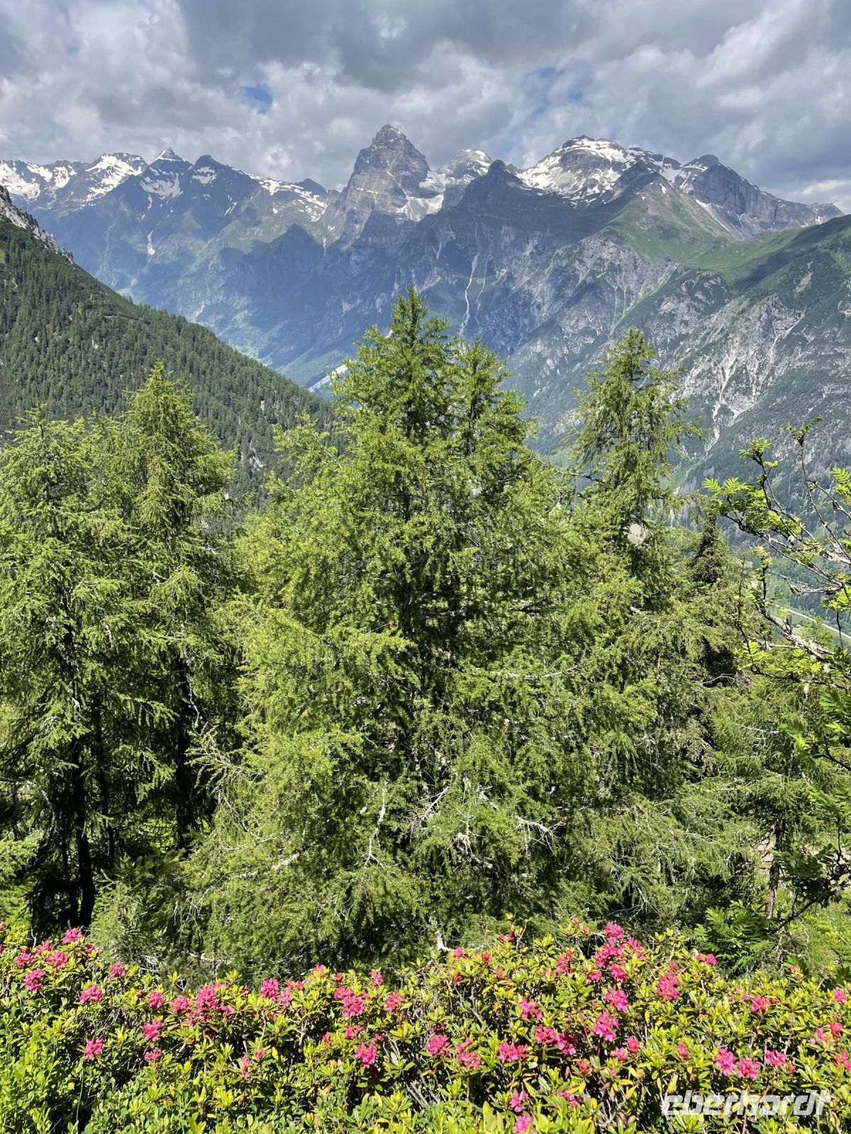 Gemütlich verläuft unser Weg zunächst leicht bergab auf einer Forststraße bis wir schließlich auf den Wanderpfad kommen. Wir wandern auf dem Dolomieu-Weg, der uns Einblicke in die Geologie, Natur, Tier- und Pflanzenwelt des gesamten Alpenraums gewährt. Nun geht es wieder bergauf, abwechselnd mit flachen Passagen. Immer wieder bleiben wir stehen und staunen über die Schönheit des mächtigen Alpenhauptkamms, der zum Greifen nah scheint. Über eine angenehm zu gehende Forststraße erreichen wir das bezaubernde Almendorf im beschaulichen Vallmingtal und gönnen uns eine kurze Rast. Der letzte Anstieg unserer Alpenüberquerung führt uns zu einem malerischen Biotop, wo wir auch nochmal eine Pause zum Fotografieren und Sonne genießen einlegen. Wir verlängern die Tour und gehen über einen schönen Wiesenweg bis zum Flaner Jöchl und genießen hier nochmals die wilde Schönheit der Natur mit Ausblick auf die Pflerscher Gletscher, die einzigartige Weißwandspitze und den Tribulaun. Nun ist auch schon unser Ziel Sterzing im Tal zu sehen – also nichts wie hin zur Seilbahn, die uns hinunter in die Fuggerstadt Sterzing bringt. Durch die Fußgängerzone schreiten wir bis zum Zwölferturm. Wir haben es geschafft – die Alpenüberquerung von Garmisch-Partenkirchen nach Sterzing ist beendet! Ein großartiges Gefühl. Von unserer lieben Ute werden wir gebührend empfangen und anschließend stoßen wir auf unsere Leistung mit einem Aperol an.