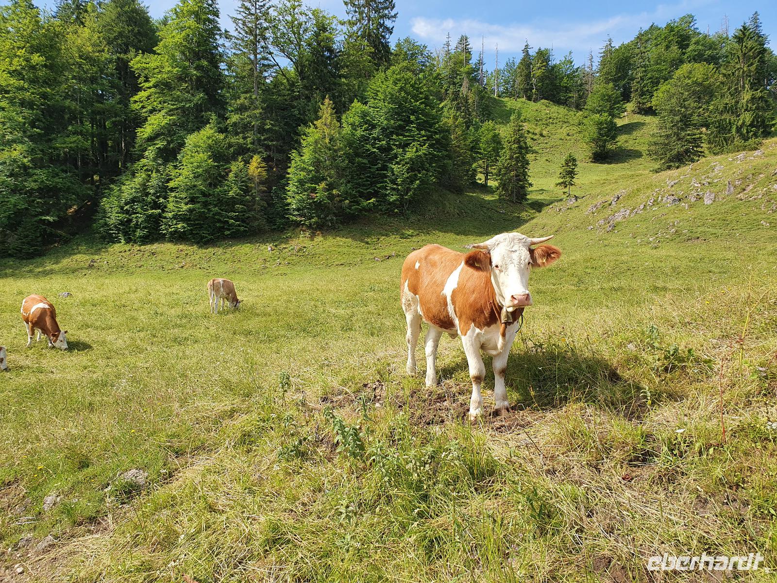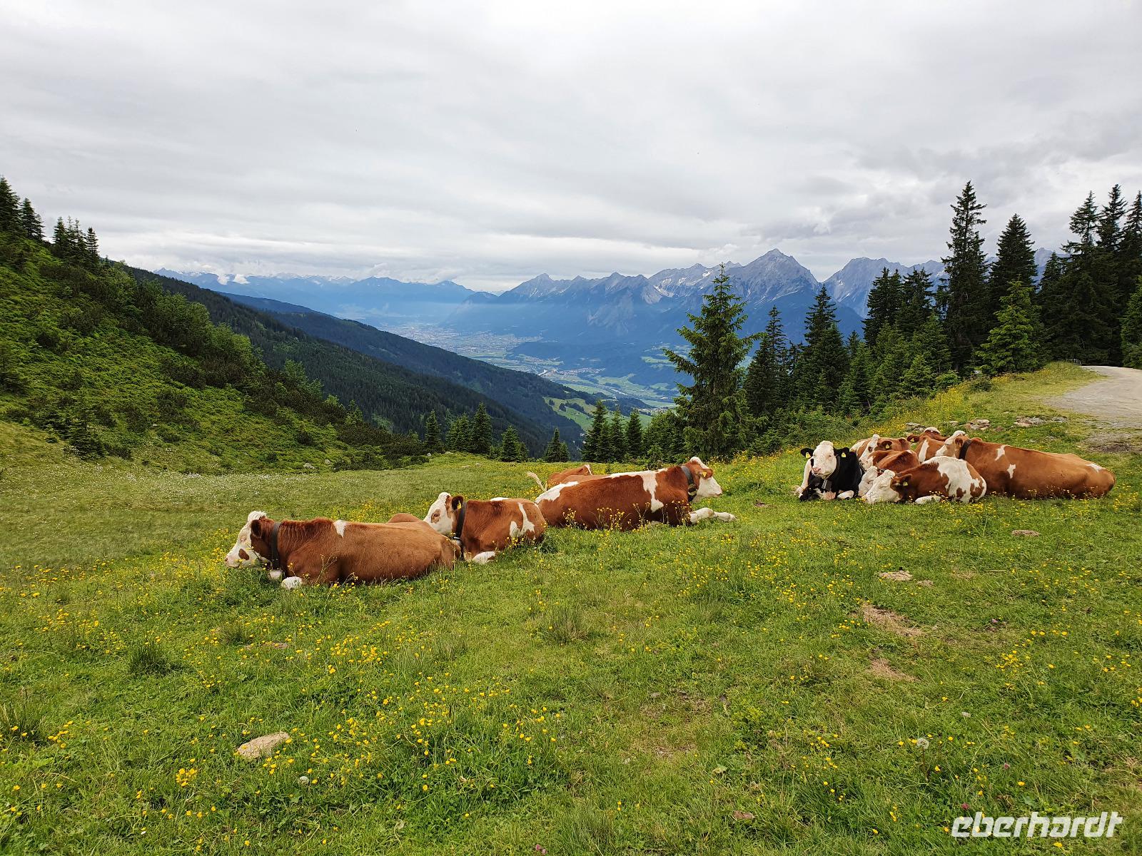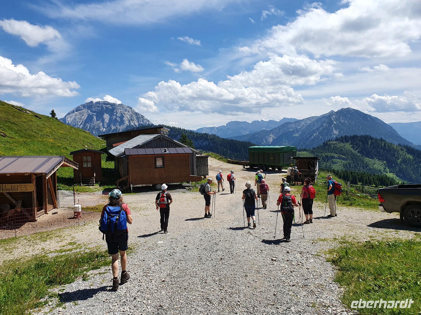 Es war Wochenende und sehr viele Wanderer unterwegs. Steffie half beim Einstellen der Wanderstöcke und gab nochmals Hinweise zur Tour. Wir reihten uns ein und dann ging es auch schon bergan durch einen Mischwald. Immer wieder erreichten wir freie Stellen mit herrlicher Aussicht, trafen auf reichlich Kühe unterwegs und machten nach 2 Stunden eine kleine Pause. Das Gelände wurde freier und war immer mit vielen wunderschönen Aussichten gespickt. Aber es ging stetig mal steiler, mal weniger steiler bergan. Die Kondition der Wanderer unserer Gruppe war recht unterschiedlich und so gingen wir auch nicht immer alle zusammen. Nach viereinhalb Stunden erreichten die ersten unserer Gruppe die Blaubergalm und freuten sich auf die angebotenen Leckereien. Das Wetter war perfekt und so genossen wir die Pause oben in den Blaubergen. Es stand noch ein langer Abstieg bevor und so drängte Steffie zum Aufbruch. Unterwegs gab es noch eine Lehrstunde zur Zirbe. Der 2,5 stündige Abstieg zehrte noch einmal und alle waren glücklich, als endlich die Fahrzeuge auf der Hauptstrasse zu hören waren. Ich bestellte 2 Taxen und die brachten uns zum Hotel Fischerwirt in Achenkirch. Für das Abendessen hatten wir Tische reserviert und jeder ass a la carte auf eigene Rechnung. Danach freute sich jeder auf sein Bett.