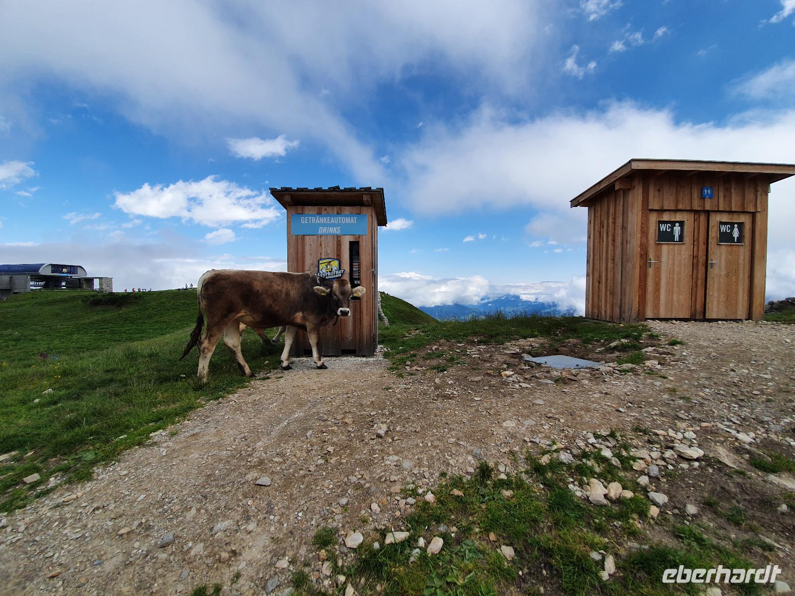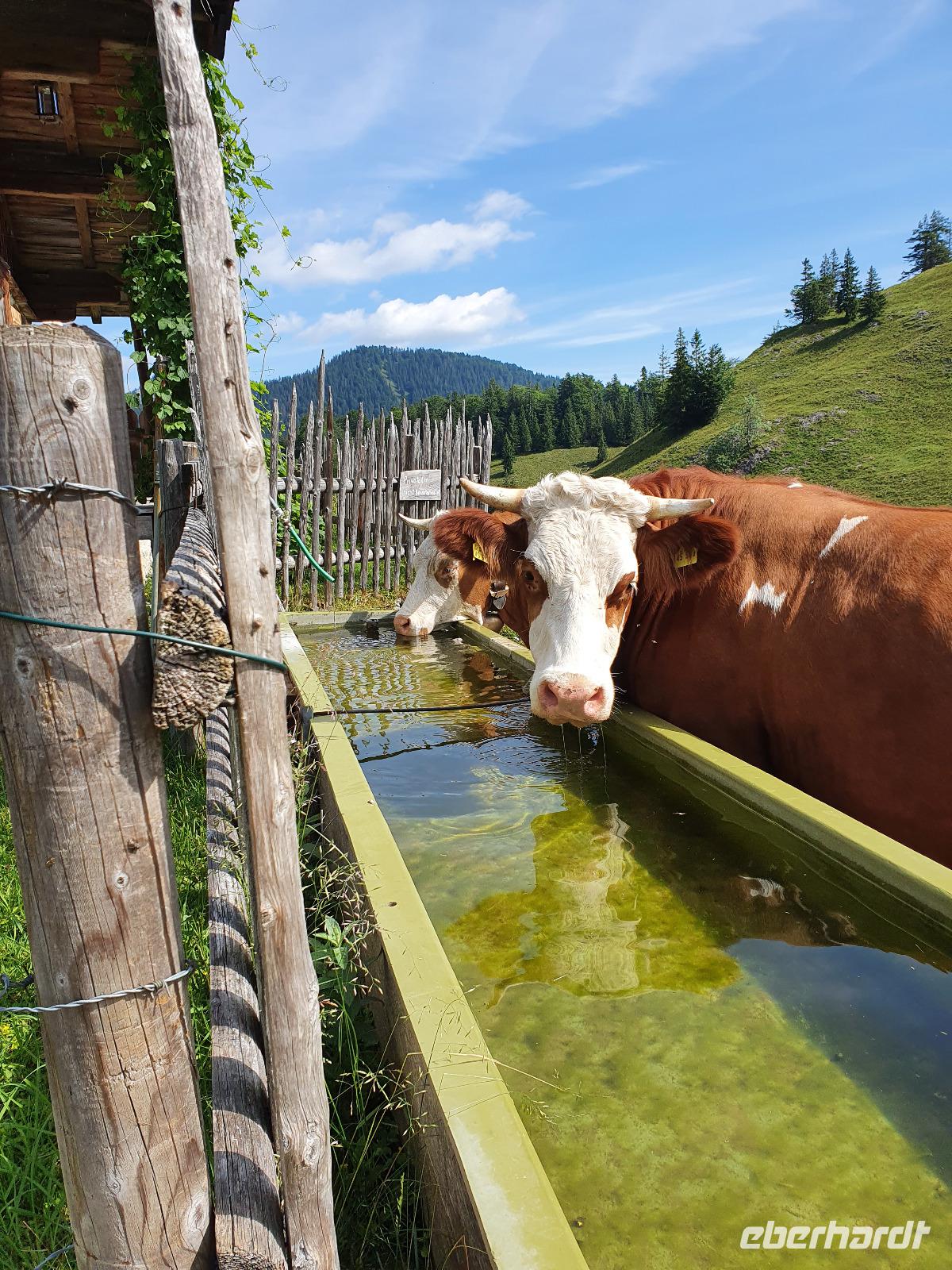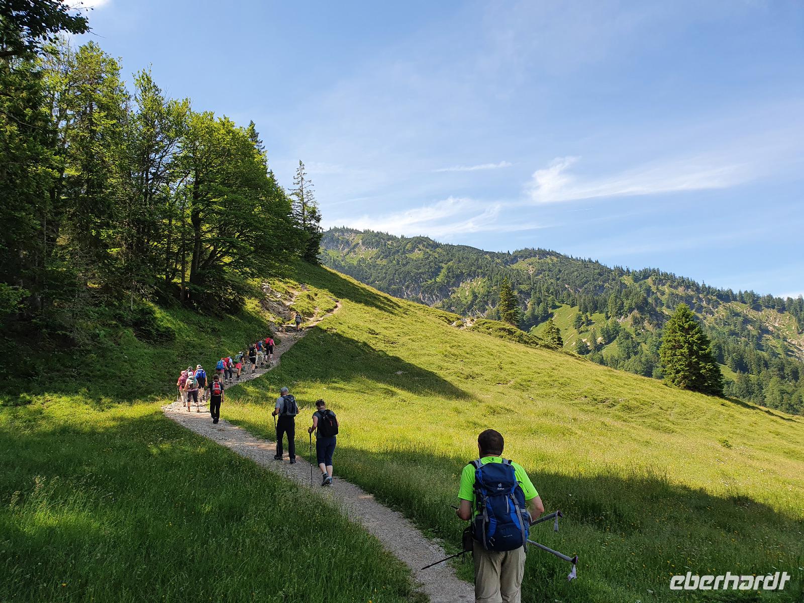 Es war Wochenende und sehr viele Wanderer unterwegs. Steffie half beim Einstellen der Wanderstöcke und gab nochmals Hinweise zur Tour. Wir reihten uns ein und dann ging es auch schon bergan durch einen Mischwald. Immer wieder erreichten wir freie Stellen mit herrlicher Aussicht, trafen auf reichlich Kühe unterwegs und machten nach 2 Stunden eine kleine Pause. Das Gelände wurde freier und war immer mit vielen wunderschönen Aussichten gespickt. Aber es ging stetig mal steiler, mal weniger steiler bergan. Die Kondition der Wanderer unserer Gruppe war recht unterschiedlich und so gingen wir auch nicht immer alle zusammen. Nach viereinhalb Stunden erreichten die ersten unserer Gruppe die Blaubergalm und freuten sich auf die angebotenen Leckereien. Das Wetter war perfekt und so genossen wir die Pause oben in den Blaubergen. Es stand noch ein langer Abstieg bevor und so drängte Steffie zum Aufbruch. Unterwegs gab es noch eine Lehrstunde zur Zirbe. Der 2,5 stündige Abstieg zehrte noch einmal und alle waren glücklich, als endlich die Fahrzeuge auf der Hauptstrasse zu hören waren. Ich bestellte 2 Taxen und die brachten uns zum Hotel Fischerwirt in Achenkirch. Für das Abendessen hatten wir Tische reserviert und jeder ass a la carte auf eigene Rechnung. Danach freute sich jeder auf sein Bett.
