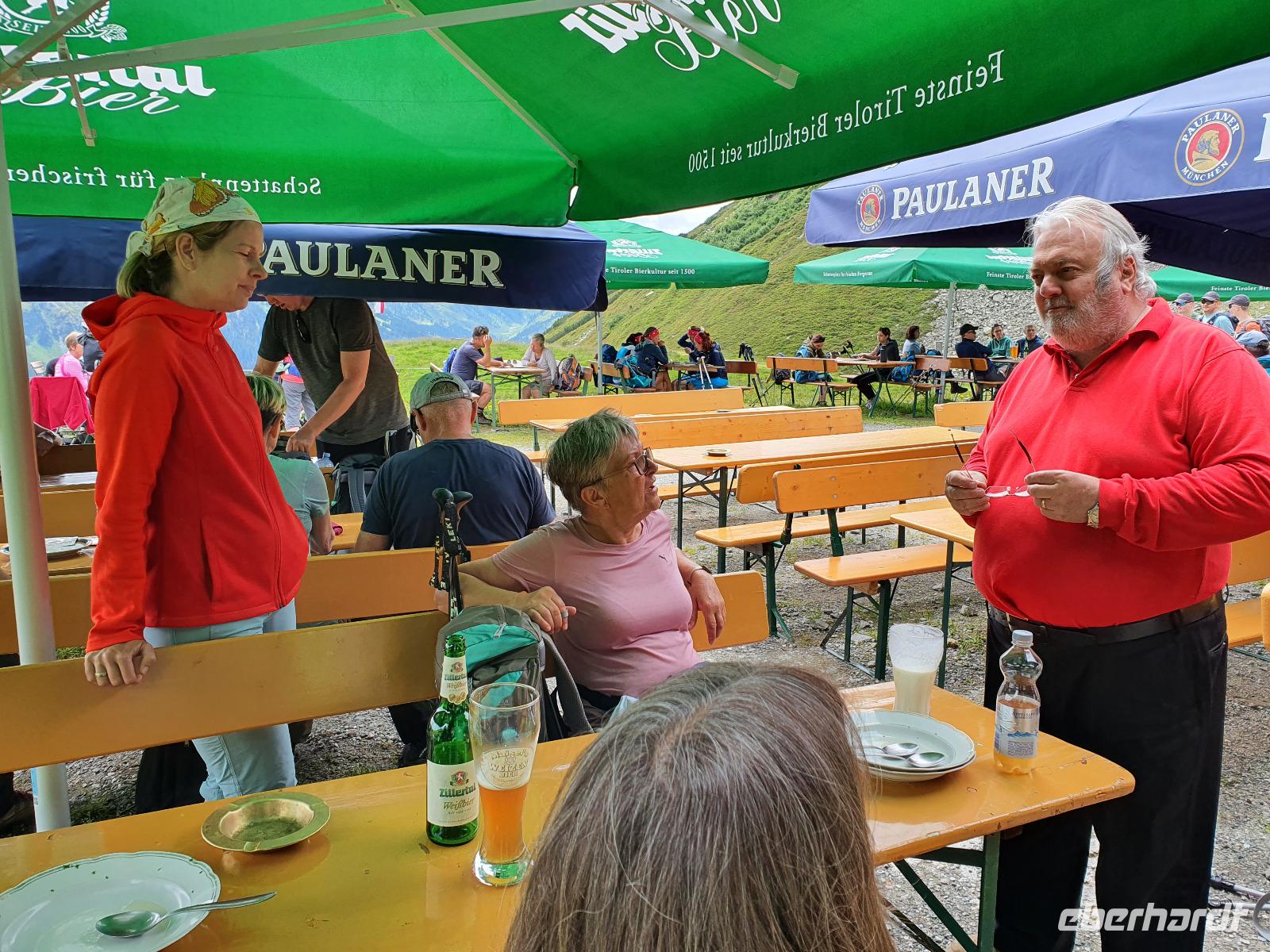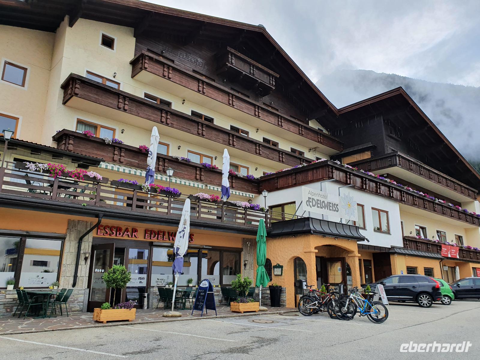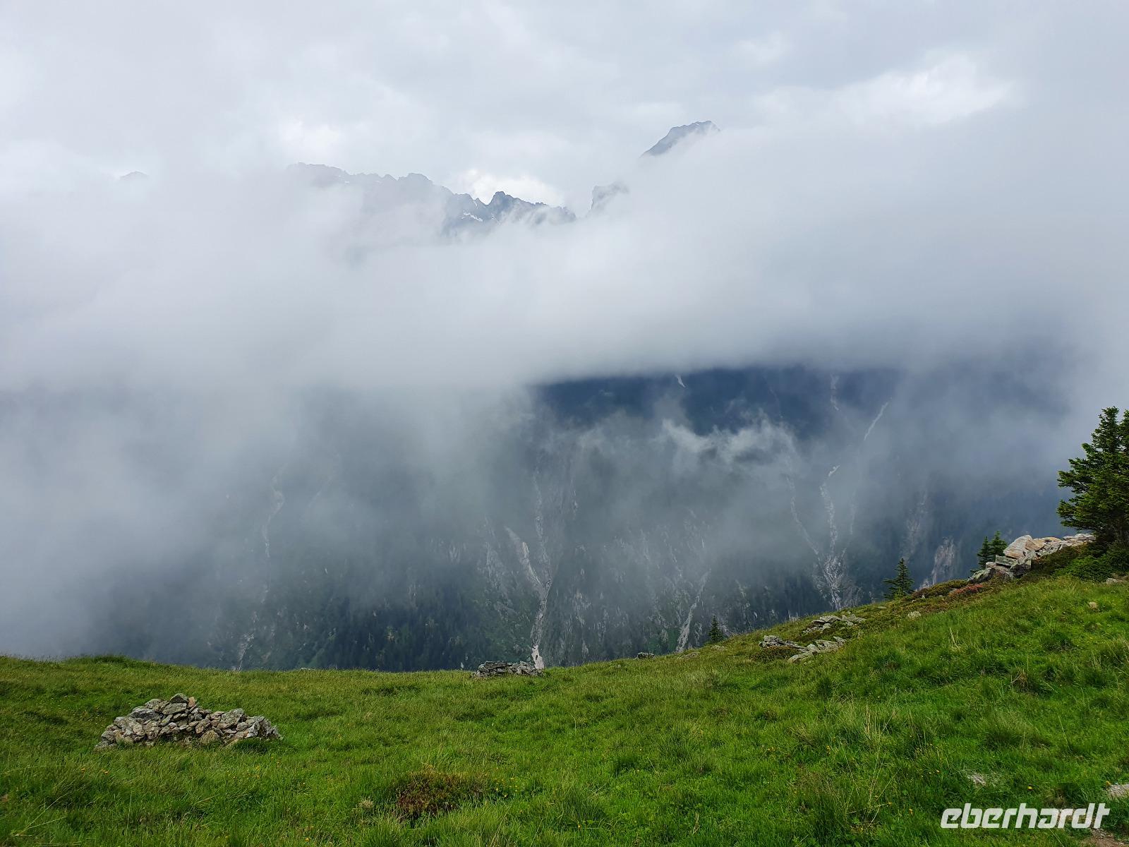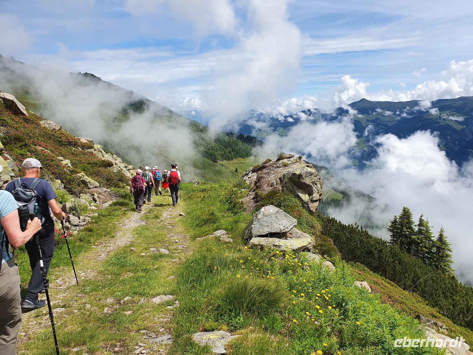 8 Gäste entschieden sich, mit uns per Seilbahn auf das Ahornplateau zu fahren. Oben gab es dann verschiedene Möglichkeiten an kleineren und größeren Wanderungen. 4 Singles schlossen sich Steffie und mir an und wir wanderten zur Edelhütte. Das war eine wunderschöne Tour mit Aussichten hinunter ins Zillertal und hinauf zur Ahornspitze. Nach einem recht steilen Anstieg erreichten wir die Hütte und hatten zu Mittag wieder eine reichliche Auswahl. Der Hüttenwirt machte ein Schwätzchen mit uns und trug uns Grüße für unsere Hotelchefin auf. Leider wurden die Wolken immer dichter und so war der Abstieg teilweise in Wolken, teilweise mit freier Sicht. Wieder unten am Ahornplateau machten wir eine Runde auf einem schönen Aussichtsweg und kehrten dann noch einmal im Panorama Restaurant auf Kaffee und Kuchen ein. Eine Dame hatte unsere Gruppe schon früher verlassen, weil sie einen aktuellen Test für die Einreise nach Italien brauchte. Wieder unten in Mayrhofen schien die Sonne und so bummelte jeder gemütlich zurück zum Hotel. Zum Abendessen gingen wir ins Hotel Berghof gleich neben unserem Hotel. Beim Abendessen gab es einen regen Austausch über das Erlebte am Ruhetag.