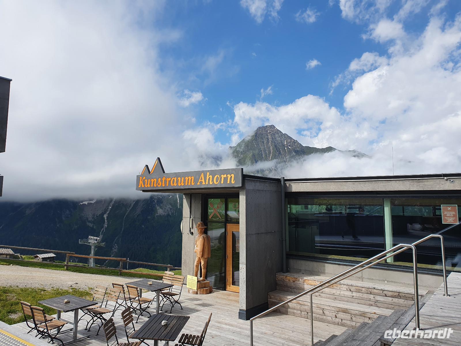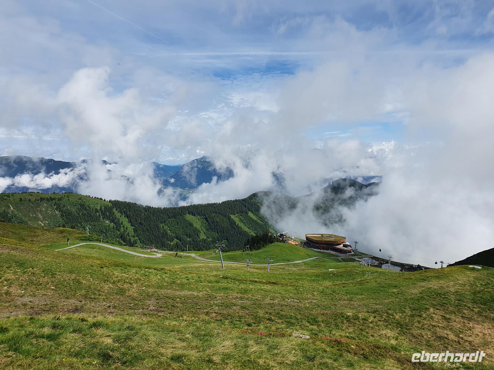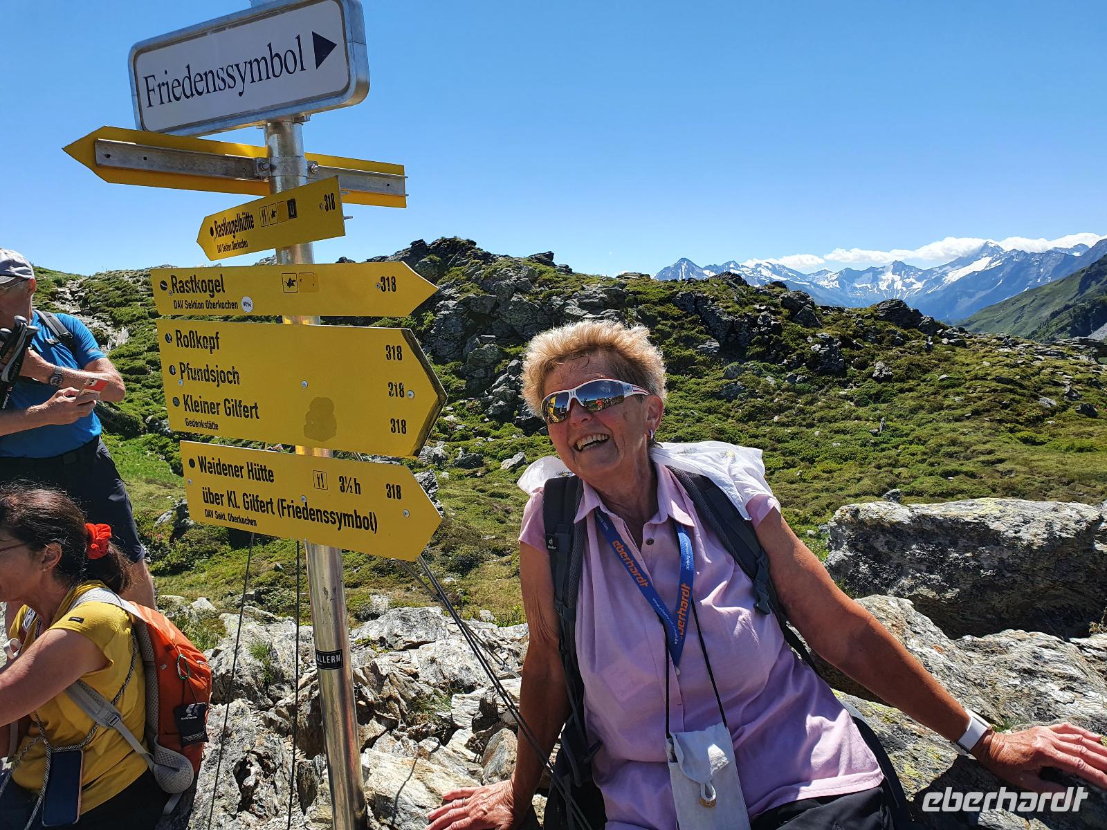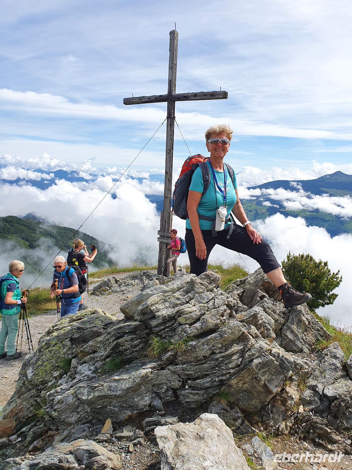 8 Gäste entschieden sich, mit uns per Seilbahn auf das Ahornplateau zu fahren. Oben gab es dann verschiedene Möglichkeiten an kleineren und größeren Wanderungen. 4 Singles schlossen sich Steffie und mir an und wir wanderten zur Edelhütte. Das war eine wunderschöne Tour mit Aussichten hinunter ins Zillertal und hinauf zur Ahornspitze. Nach einem recht steilen Anstieg erreichten wir die Hütte und hatten zu Mittag wieder eine reichliche Auswahl. Der Hüttenwirt machte ein Schwätzchen mit uns und trug uns Grüße für unsere Hotelchefin auf. Leider wurden die Wolken immer dichter und so war der Abstieg teilweise in Wolken, teilweise mit freier Sicht. Wieder unten am Ahornplateau machten wir eine Runde auf einem schönen Aussichtsweg und kehrten dann noch einmal im Panorama Restaurant auf Kaffee und Kuchen ein. Eine Dame hatte unsere Gruppe schon früher verlassen, weil sie einen aktuellen Test für die Einreise nach Italien brauchte. Wieder unten in Mayrhofen schien die Sonne und so bummelte jeder gemütlich zurück zum Hotel. Zum Abendessen gingen wir ins Hotel Berghof gleich neben unserem Hotel. Beim Abendessen gab es einen regen Austausch über das Erlebte am Ruhetag.