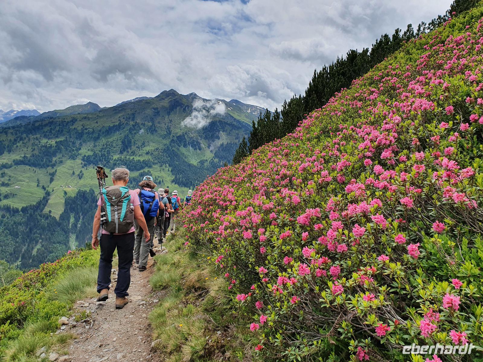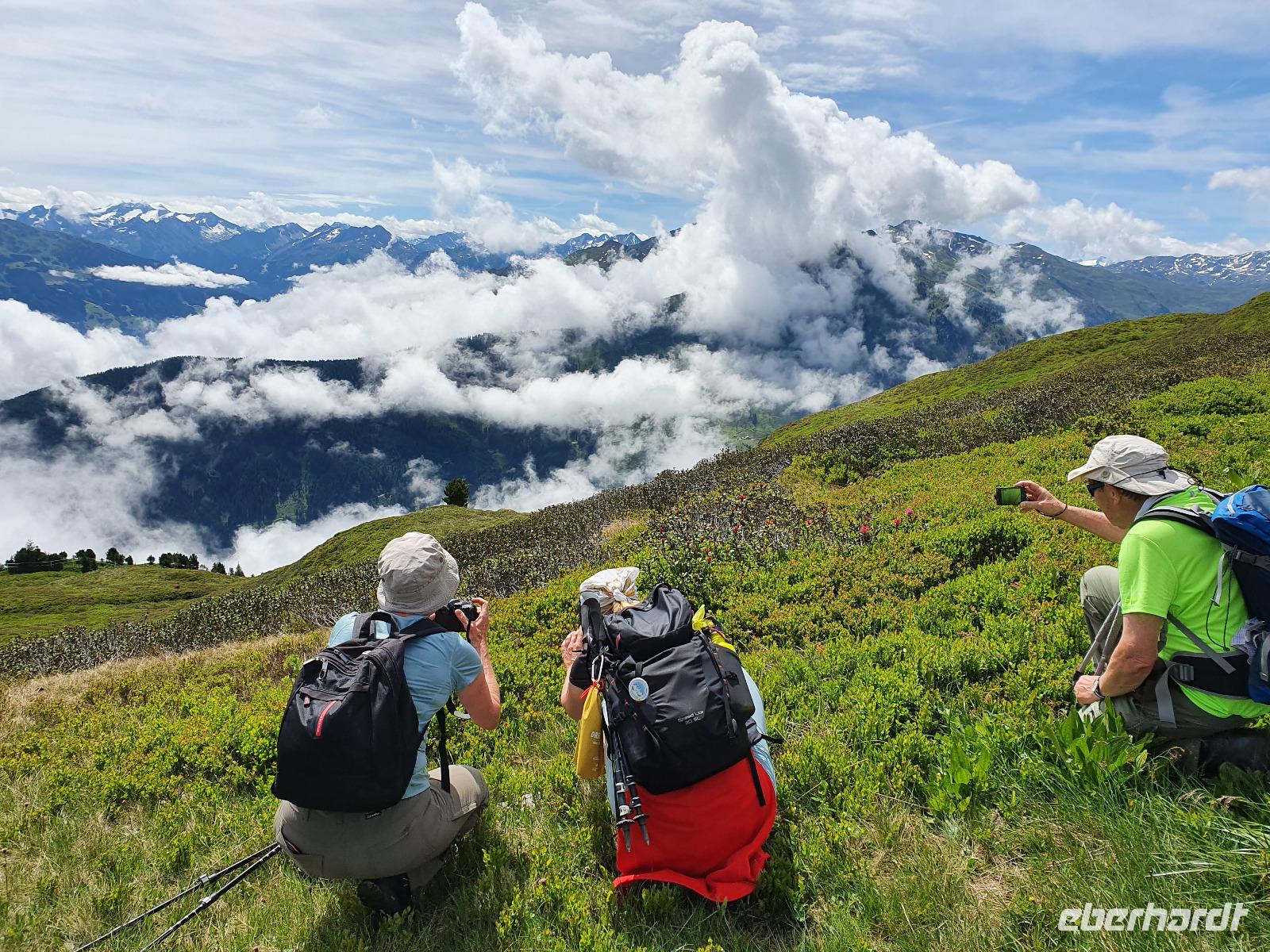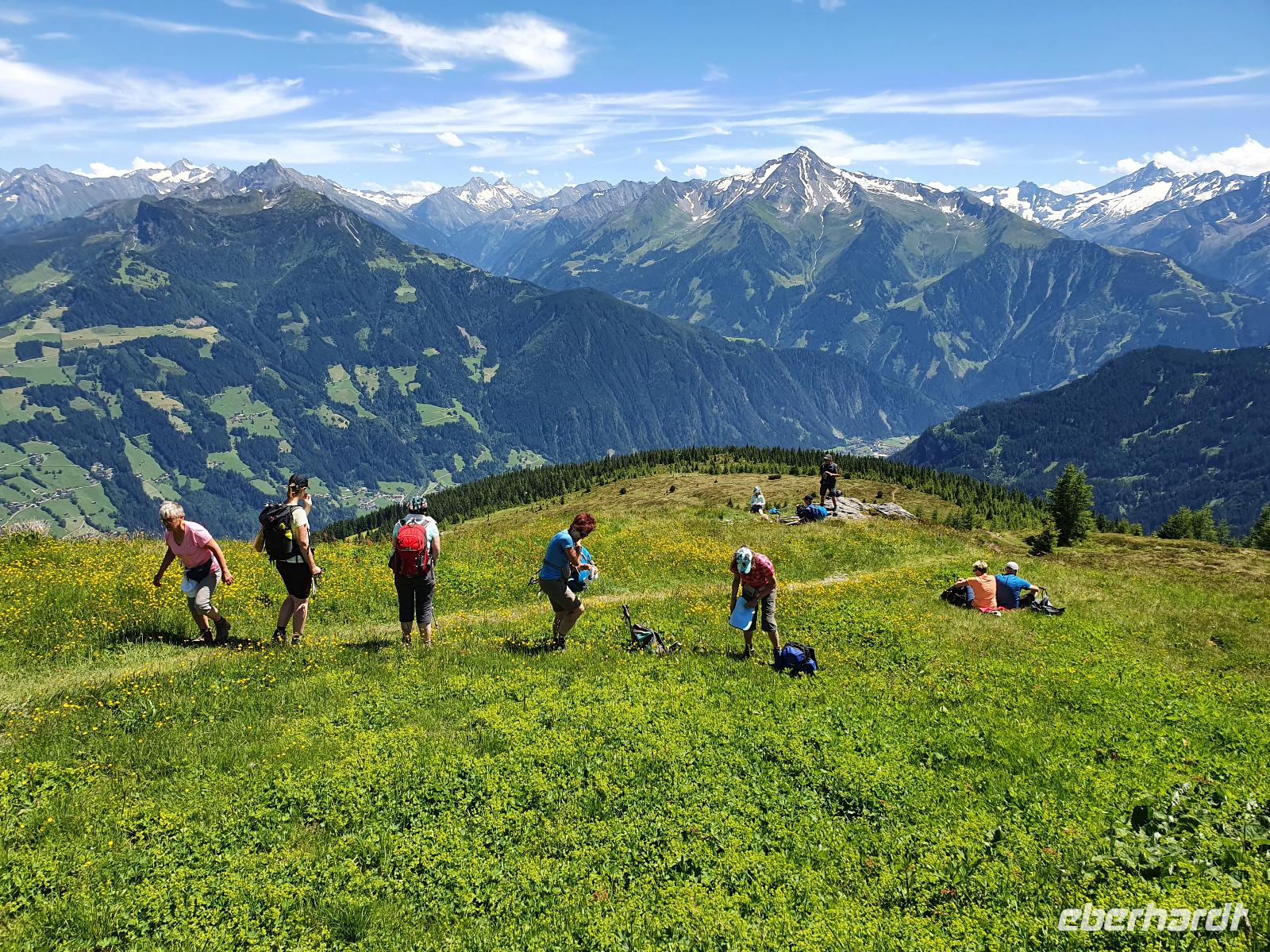 Nach dem Frühstück wurden die Koffer zur Rezeption gebracht und wir fuhren mit dem Linienbus von Maurach hinunter ins Inntal nach Jenbach zum Bahnhof. Von dort ging es weiter mit der Zillertalbahn nach Fügen. Es folgte ein schöner Spaziergang durch Fügen hinauf zur Station der Spieljochbahn. Gemeinsam fuhren wir hinauf durch die Wolken und freuten uns oben über den Sonnenschein. Hier oben trennten sich unsere Wege. 4 Gäste nahmen die Bahn wieder hinunter und dann den Linienbus nach Hochfügen. Die Wanderer begannen ihre Tour zunächst hinauf auf den Gipfel des Spieljochs und dann auf einem Grat Richtung Gartlalm. Unterwegs waren die steilen Hänge mit Almrosen gesäumt und atemberaubende Aussichten verlockten immer wieder zum Fotografieren. Unser Tagesziel Hochfügen war schon gut zu erkennen in der Ferne. Nach einem Abstieg erreichten wir die Gartlalm, wo Bruno der Bär einst Honig stahl. Ihm wurde dort ein Denkmal gesetzt und der Wirt berichtete über das Ereignis. Der Bär hatte seine Alm berühmt gemacht. Nach der Mittagspause in der Alm nahmen wir den zweiten Teil der Wanderung in Angriff immer am Hang entlang mit tollen Ausblicken. Wir erreichten das Alpengasthaus Loas und machten auf einer Wiese nochmals Pause. Von dort konnte man bis nach Innsbruck schauen mit dem Karwendelgebirge im Norden. Ein breiter Weg führte dann bis zum Tagesziel Hochfügen und dort checkten wir im Hotel Lamark ein. Der Wellnessbereich des Hotels wurde ausgiebig genutzt und das Abendessen an unserem Bergfest war unvergesslich gut und das beste unserer Reise.