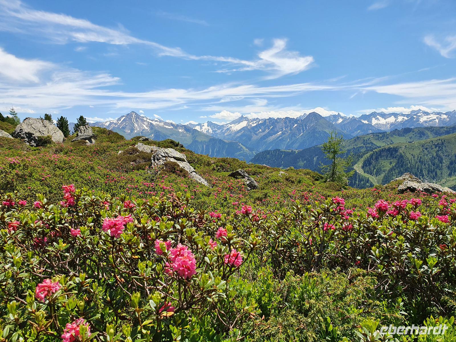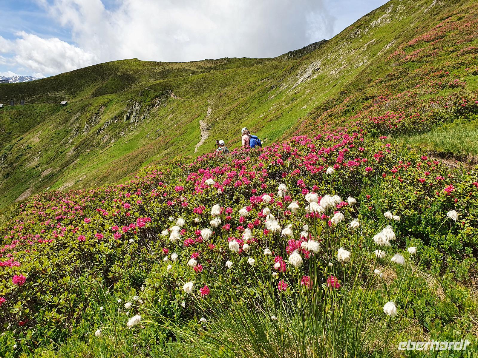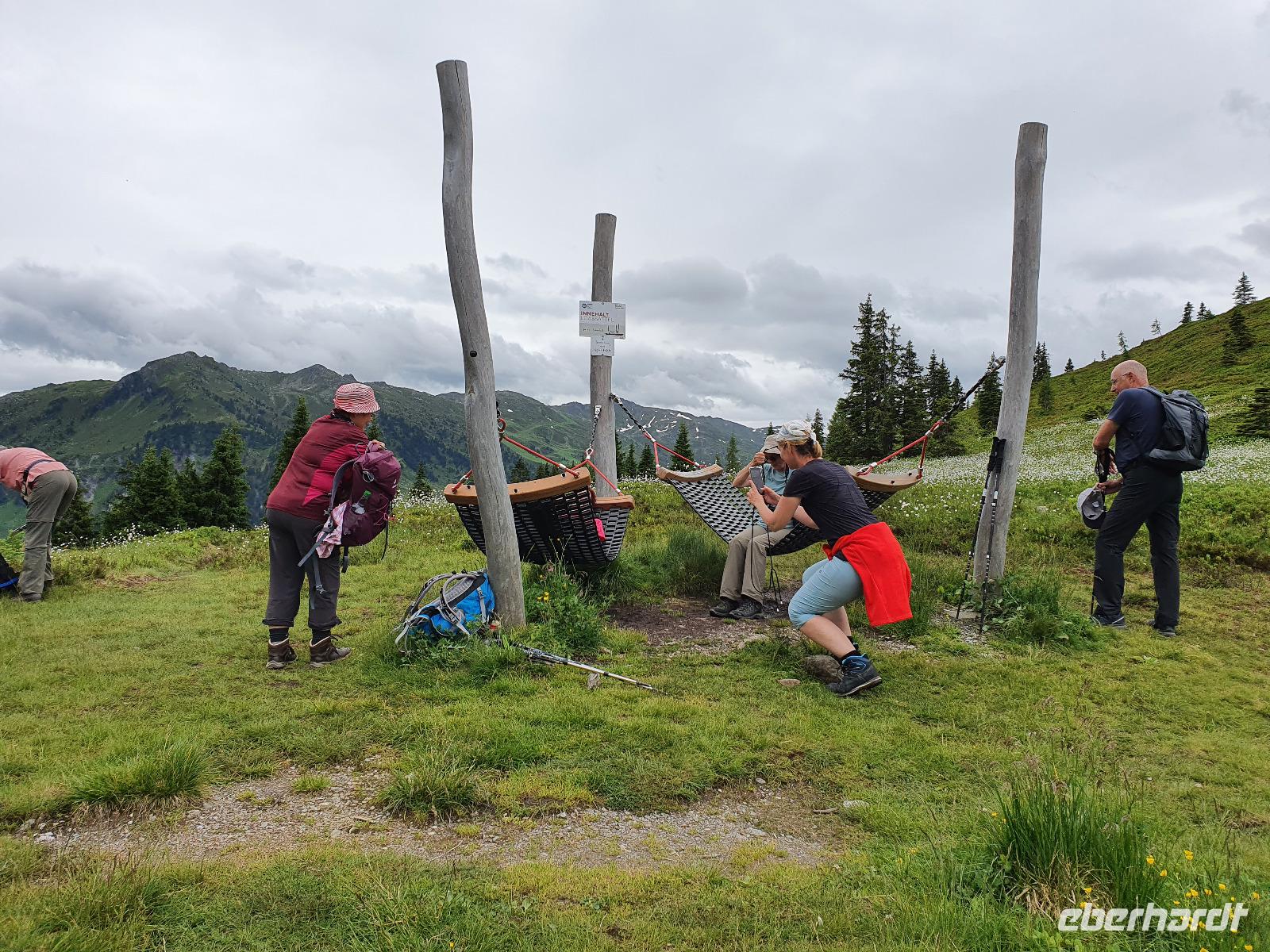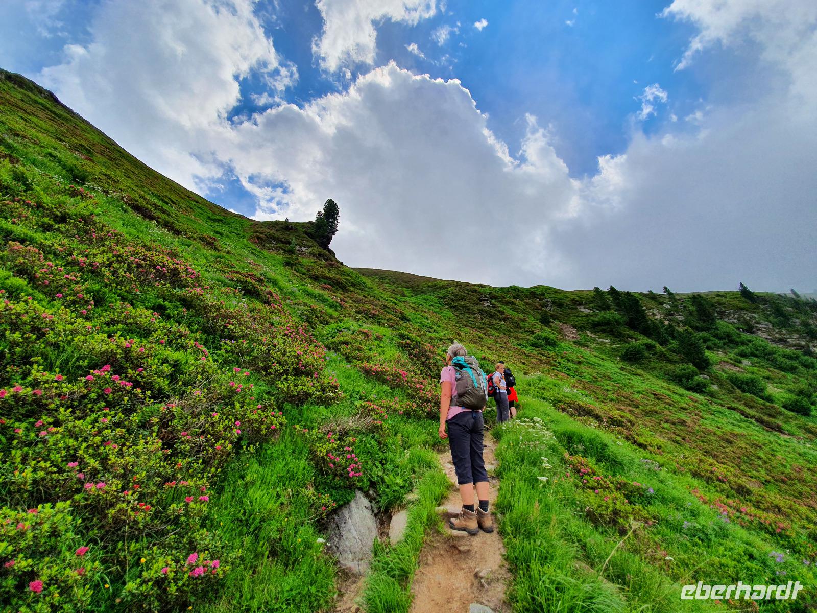 Nach dem Frühstück wurden die Koffer zur Rezeption gebracht und wir fuhren mit dem Linienbus von Maurach hinunter ins Inntal nach Jenbach zum Bahnhof. Von dort ging es weiter mit der Zillertalbahn nach Fügen. Es folgte ein schöner Spaziergang durch Fügen hinauf zur Station der Spieljochbahn. Gemeinsam fuhren wir hinauf durch die Wolken und freuten uns oben über den Sonnenschein. Hier oben trennten sich unsere Wege. 4 Gäste nahmen die Bahn wieder hinunter und dann den Linienbus nach Hochfügen. Die Wanderer begannen ihre Tour zunächst hinauf auf den Gipfel des Spieljochs und dann auf einem Grat Richtung Gartlalm. Unterwegs waren die steilen Hänge mit Almrosen gesäumt und atemberaubende Aussichten verlockten immer wieder zum Fotografieren. Unser Tagesziel Hochfügen war schon gut zu erkennen in der Ferne. Nach einem Abstieg erreichten wir die Gartlalm, wo Bruno der Bär einst Honig stahl. Ihm wurde dort ein Denkmal gesetzt und der Wirt berichtete über das Ereignis. Der Bär hatte seine Alm berühmt gemacht. Nach der Mittagspause in der Alm nahmen wir den zweiten Teil der Wanderung in Angriff immer am Hang entlang mit tollen Ausblicken. Wir erreichten das Alpengasthaus Loas und machten auf einer Wiese nochmals Pause. Von dort konnte man bis nach Innsbruck schauen mit dem Karwendelgebirge im Norden. Ein breiter Weg führte dann bis zum Tagesziel Hochfügen und dort checkten wir im Hotel Lamark ein. Der Wellnessbereich des Hotels wurde ausgiebig genutzt und das Abendessen an unserem Bergfest war unvergesslich gut und das beste unserer Reise.