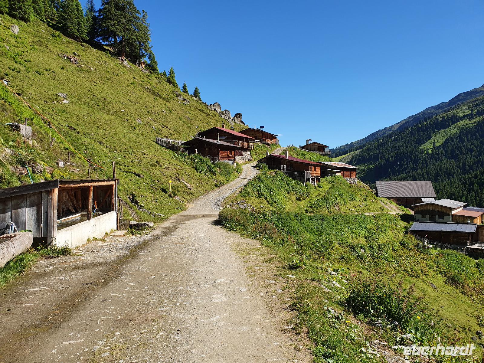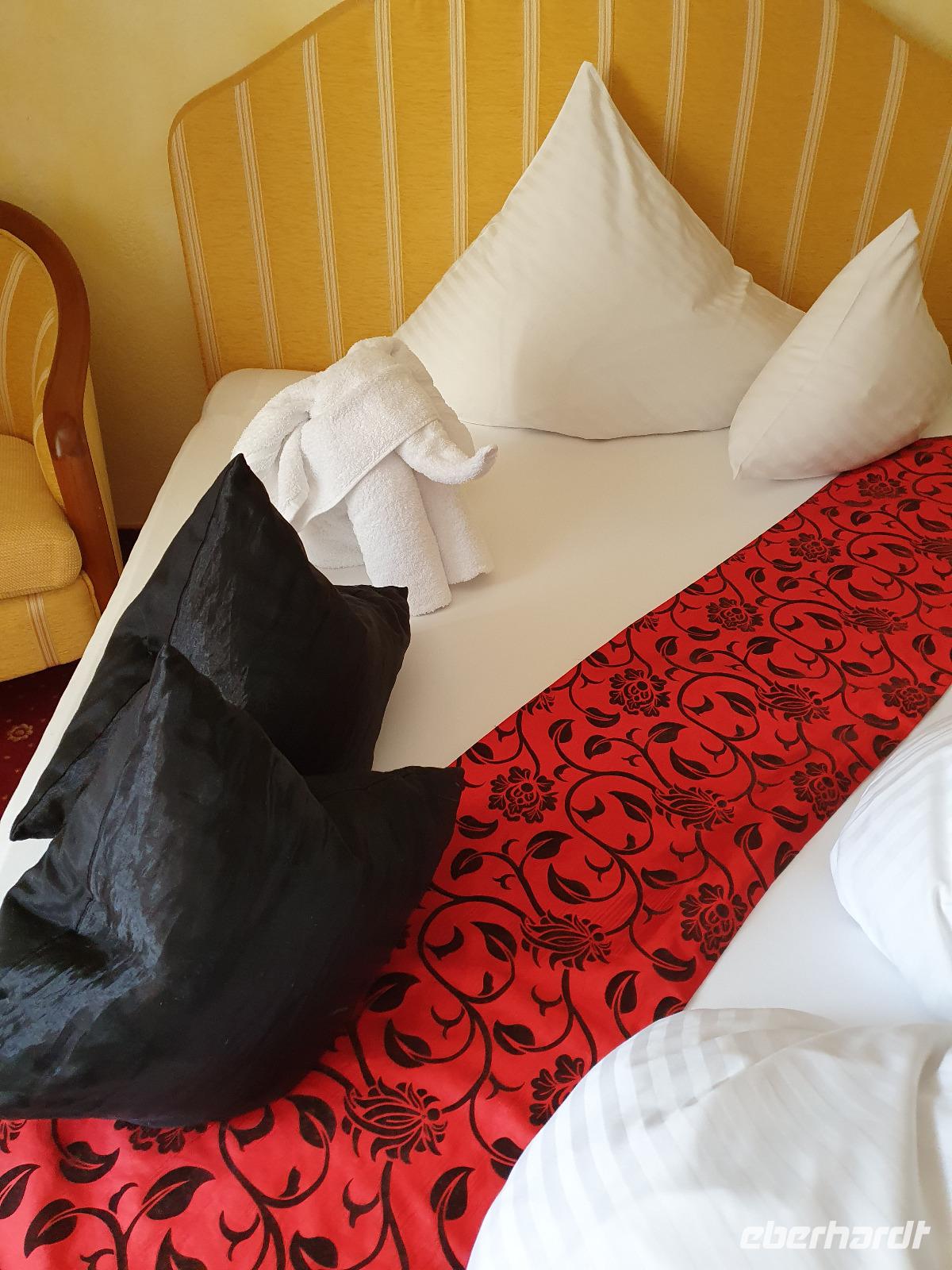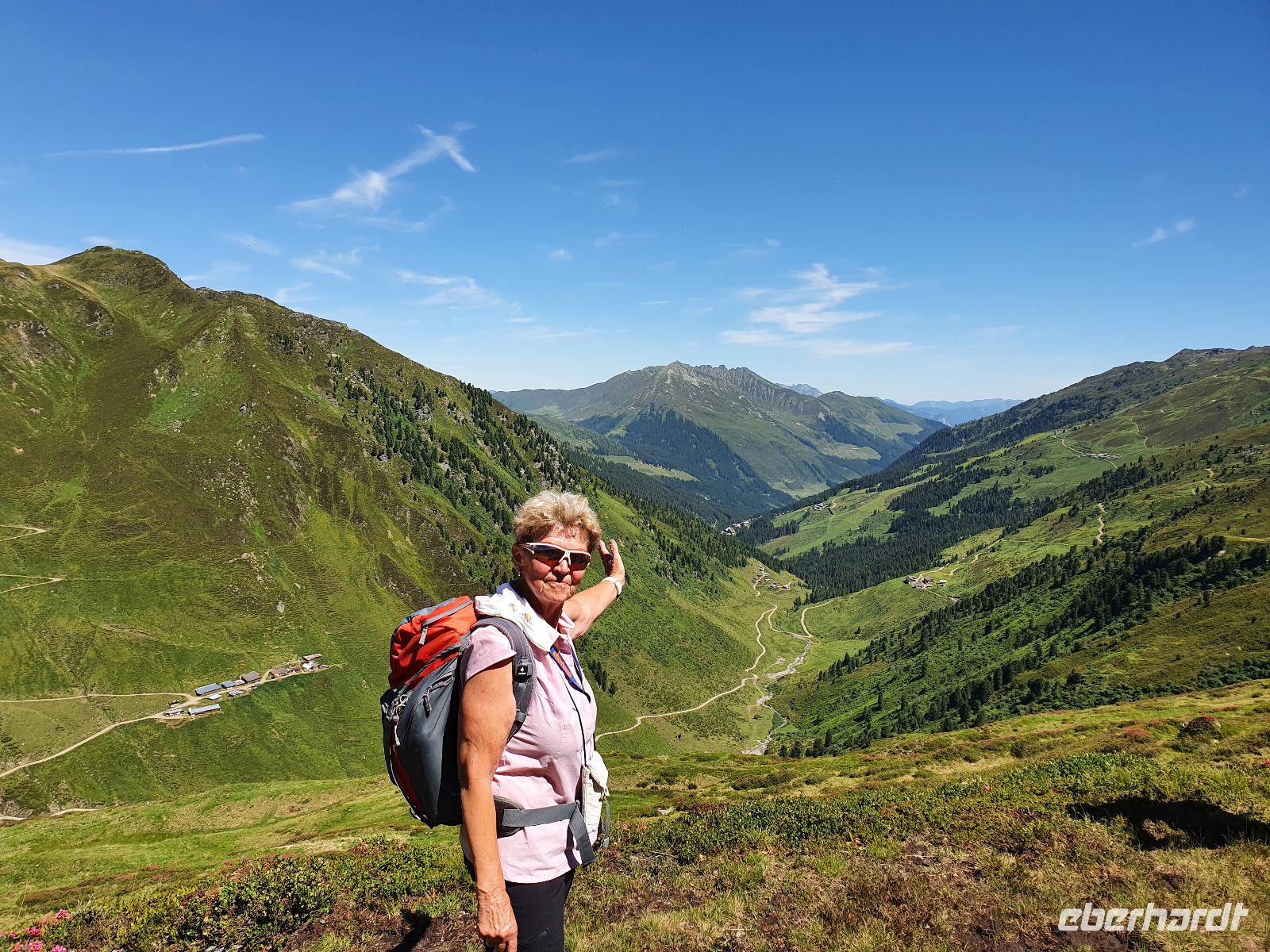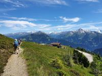 Nach einem ausgezeichneten Frühstück nahmen 4 Gäste wieder den Linienbus hinunter nach Fügen und weiter die Zillertalbahn bis Mayrhofen. Die Wanderer starteten den langen Anstieg zunächst auf einem breiten Weg in Serpentinen durch dörfliche Ansiedlungen und dann weiter auf einem steilen Pfad bis zu einem Sattel. Dabei konnte man zurück schauend unsere Wanderung des Vortages verfolgen und die Hotelsiedlung Hochfügen gut sehen. Am Sattel dann reichte der Blick auf den Alpenhauptkamm mit den höchsten Gipfel auf der Grenze zu Italien. Es war einfach nur traumhaft bei dem tollen Wetter die Fernsicht zu geniessen. Nach einem kurzen Abstieg kamen wir zur Rastkogelalm und kehrten wieder ein. Das Angebot auf den Almen ist sehr verschieden, aber immer sehr abwechslungsreich und für jeden was dabei. So muss man auf die Wanderungen auch keinen Proviant mitnehmen, nur Wasser und vielleicht einen Riegel als Notverpflegung. Nach der Einkehr mussten wir entscheiden, entweder wieder aufzusteigen und alle kleinen Erhebungen abzuwandern oder den direkten Weg zum Melchboden zu gehen. Wir entschieden uns für den direkten Weg und hatten dabei wieder viele tolle Fotomotive. Immer vor uns lag schon die Ahornspitze, der Hausberg Mayrhofens. Vom Melchboden hoch oben über Mayrhofen holten uns die Taxis ab und brachten uns über zahllose Serpentinen hinunter nach Hippach. Wir hatten beschlossen, ab Hippach immer am Ziller entlang die 5 km bis Mayrhofen zu Fuss zu gehen. Allerdings hatten wir nicht bedacht, dass unten im Tal 34 Grad herrschten und so wurde diese letzte Strecke zur Hitzeschlacht. Endlich in Mayrhofen angekommen checkten wir im Hotel Maria Theresia ein und in den Zimmern erwarteten uns aus Handtüchern gestaltete Elefanten, eine super Idee für unsere Alpenüberquerung. Zum Abendessen gingen wir gemeinsam ins Hotel Rose und aßen ganz vorzüglich.