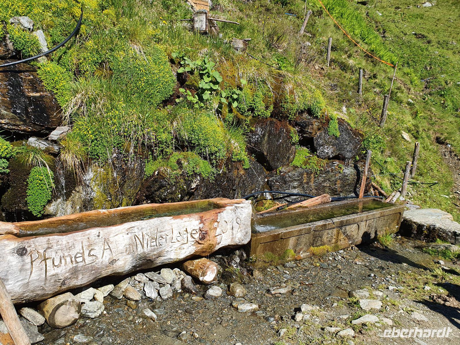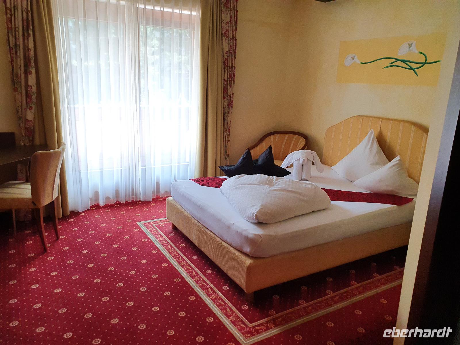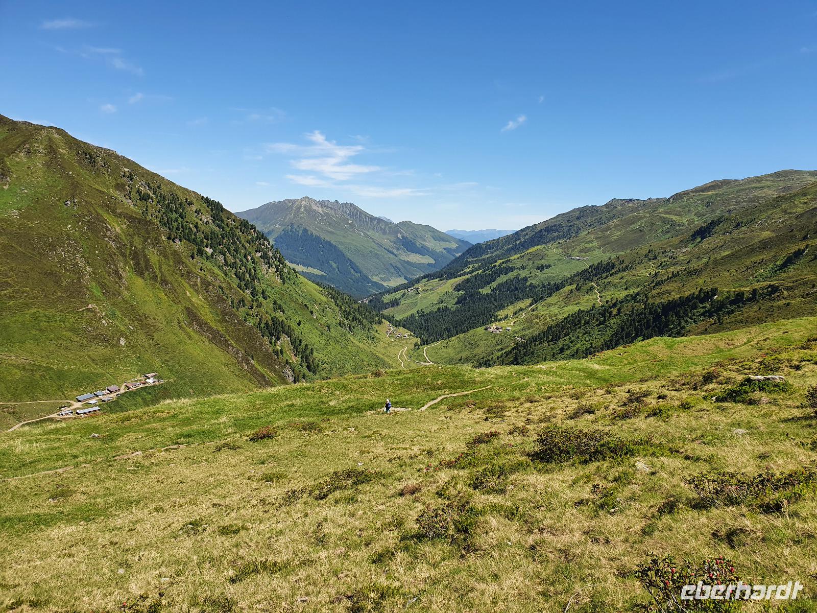 Nach einem ausgezeichneten Frühstück nahmen 4 Gäste wieder den Linienbus hinunter nach Fügen und weiter die Zillertalbahn bis Mayrhofen. Die Wanderer starteten den langen Anstieg zunächst auf einem breiten Weg in Serpentinen durch dörfliche Ansiedlungen und dann weiter auf einem steilen Pfad bis zu einem Sattel. Dabei konnte man zurück schauend unsere Wanderung des Vortages verfolgen und die Hotelsiedlung Hochfügen gut sehen. Am Sattel dann reichte der Blick auf den Alpenhauptkamm mit den höchsten Gipfel auf der Grenze zu Italien. Es war einfach nur traumhaft bei dem tollen Wetter die Fernsicht zu geniessen. Nach einem kurzen Abstieg kamen wir zur Rastkogelalm und kehrten wieder ein. Das Angebot auf den Almen ist sehr verschieden, aber immer sehr abwechslungsreich und für jeden was dabei. So muss man auf die Wanderungen auch keinen Proviant mitnehmen, nur Wasser und vielleicht einen Riegel als Notverpflegung. Nach der Einkehr mussten wir entscheiden, entweder wieder aufzusteigen und alle kleinen Erhebungen abzuwandern oder den direkten Weg zum Melchboden zu gehen. Wir entschieden uns für den direkten Weg und hatten dabei wieder viele tolle Fotomotive. Immer vor uns lag schon die Ahornspitze, der Hausberg Mayrhofens. Vom Melchboden hoch oben über Mayrhofen holten uns die Taxis ab und brachten uns über zahllose Serpentinen hinunter nach Hippach. Wir hatten beschlossen, ab Hippach immer am Ziller entlang die 5 km bis Mayrhofen zu Fuss zu gehen. Allerdings hatten wir nicht bedacht, dass unten im Tal 34 Grad herrschten und so wurde diese letzte Strecke zur Hitzeschlacht. Endlich in Mayrhofen angekommen checkten wir im Hotel Maria Theresia ein und in den Zimmern erwarteten uns aus Handtüchern gestaltete Elefanten, eine super Idee für unsere Alpenüberquerung. Zum Abendessen gingen wir gemeinsam ins Hotel Rose und aßen ganz vorzüglich.