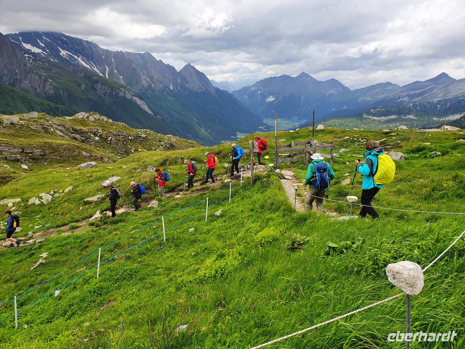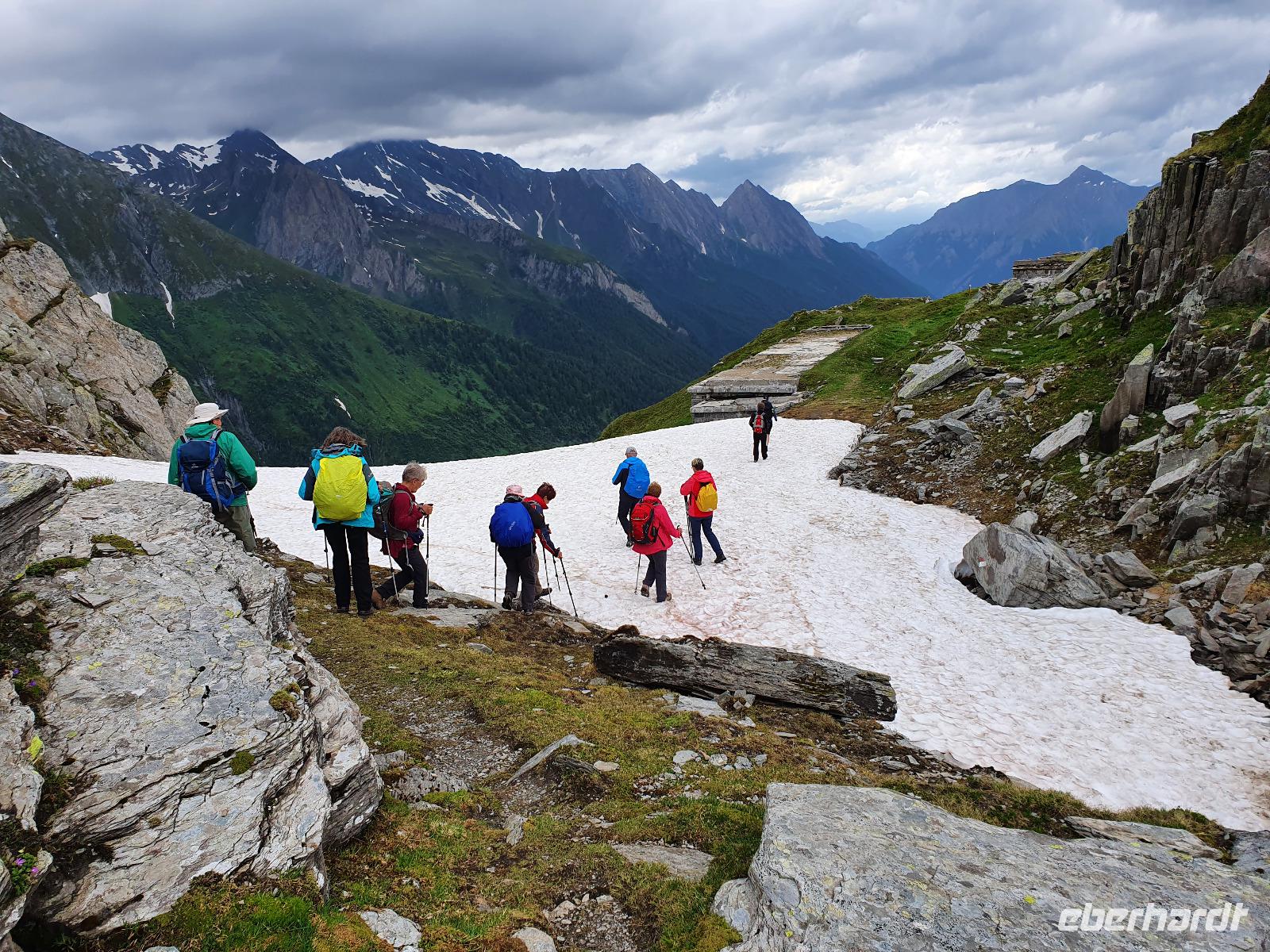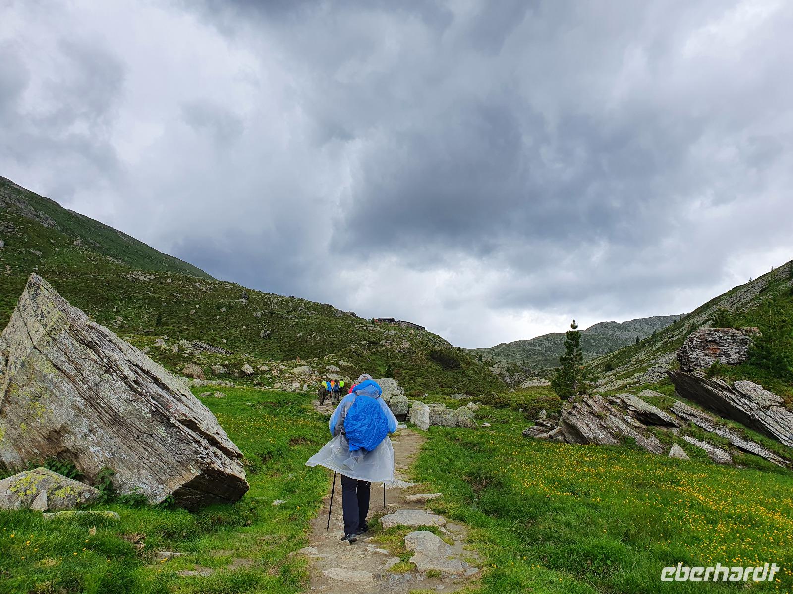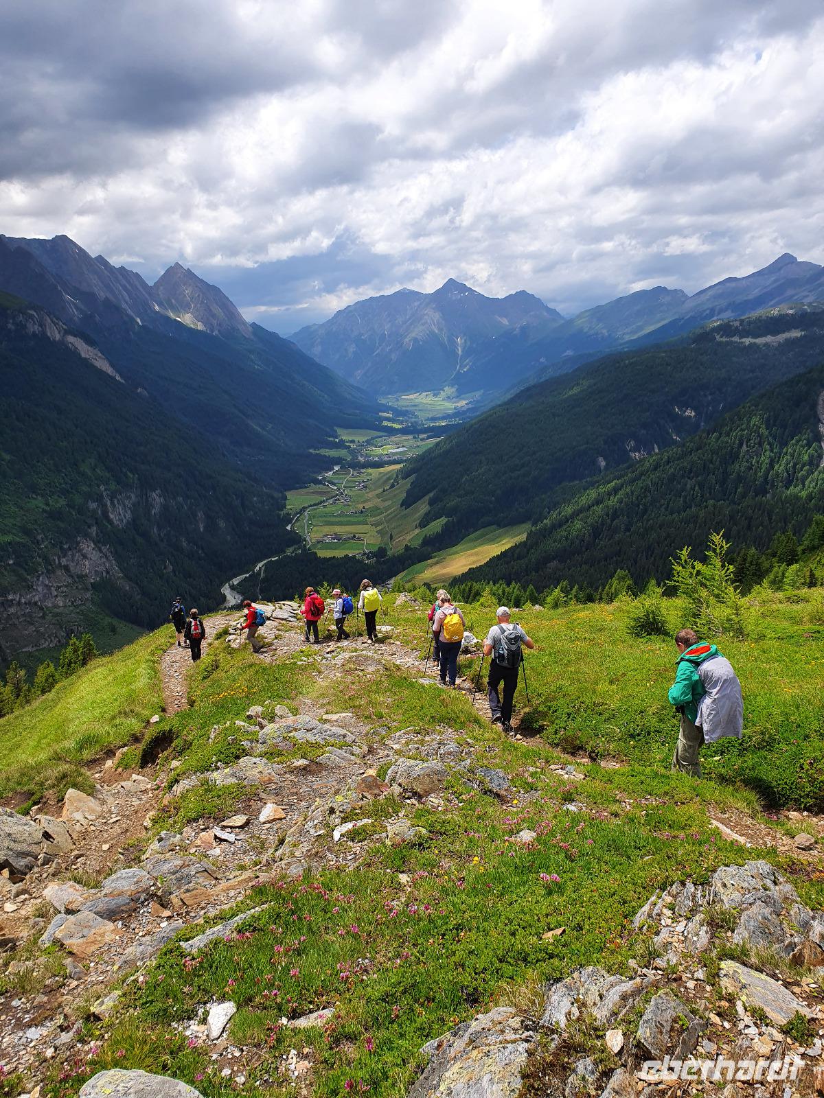 Noch einmal genossen wir das Frühstück im Hotel Maria Theresia und verabschiedeten uns dann ganz herzlich. Heute stand die Tour nach Südtirol über das Pfitscher Joch auf dem Programm und unsere 4 Nichtwanderer konnten mit dem Gepäcktransfer über das Inntal und den Brenner dorthin gelangen. Die Wanderer fuhren bis zum Wanderstartpunkt am Schlegeisspeicher auf der Mautstrasse mit 2 Taxen. Der Wetterbericht hatte Gewitter und Regen gemeldet und so starteten wir mit einem mulmigen Gefühl unseren Aufstieg. Zunächst wanderten wir an einem reissenden Bach entlang, wieder an Kühen vorbei und dann wurde der Weg steiler hinauf zur Lavitzalm. Unterwegs begann der Regen mit Sturm und wir hatten Mühe, unsere Regenkleidung anzuziehen. Wir kehrten nicht ein in der Lavitzalm sondern liefen zügig weiter zu unserem Ziel an der österreichisch-italienischen Grenze. Unterwegs liess der Regen nach und der strake Wind trocknete unsere Kleidung wieder schnell. Endlich am Grenzstein angekommen, sahen wir die Hütte auf dem Pfitscher Joch auf 2274 m Höhe, dem höchsten Punkt unserer Alpenüberquerung. Wir waren in Italien angekommen und kehrten in der Hütte ein auf ein zünftiges Mittagessen. Inzwischen hatten sich die Wolken verzogen und wir hatten gute Sicht bis hinunter ins Pfitzschtal. Der Abstieg über 850 Höhenmeter hinunter ins Tal forderte unsere volle Konzentration, weil er auf den ersten 400 Höhenmetern extrem steil verlief. Unterwegs querten wir Schneefelder, hörten die Warnpfiffe der Murmeltiere und kamen vorbei an üppig blühenden Bergwiesen. Weiter unten verlief der Weg im Wald und über Wiesen und in Stein erreichten wir die erste Gemeinde Südtirols. Es war dann noch ein Stück des Wegs bis zu den Angerer Höfen und ab dort fuhren wir mit dem Linienbus in unser Hotel Kranebitt in Kematen. Viele Alpenüberquerer übernachteten dort und unsere Gruppe bekam einen großen gemeinsamen Tisch zum Abendessen.