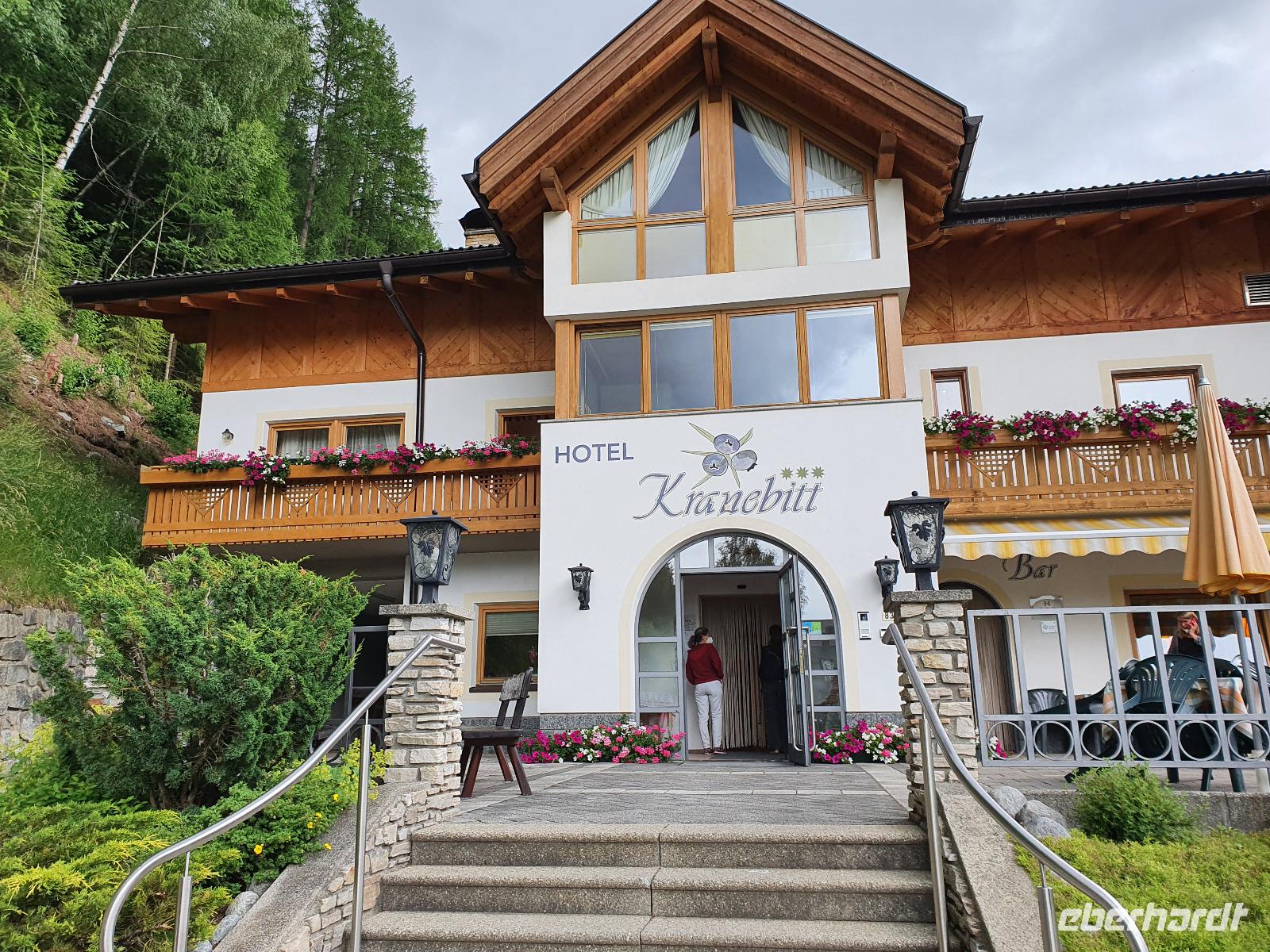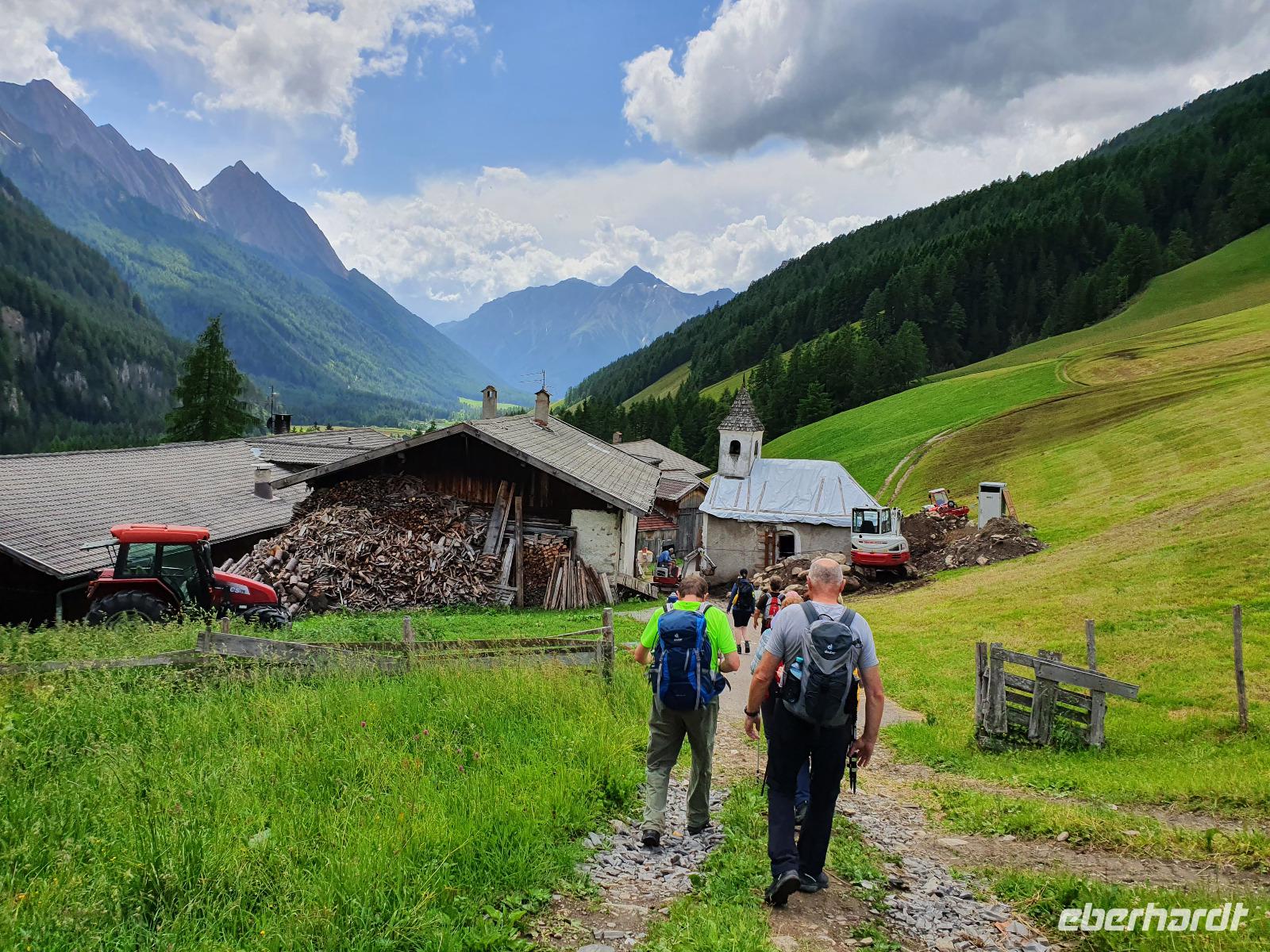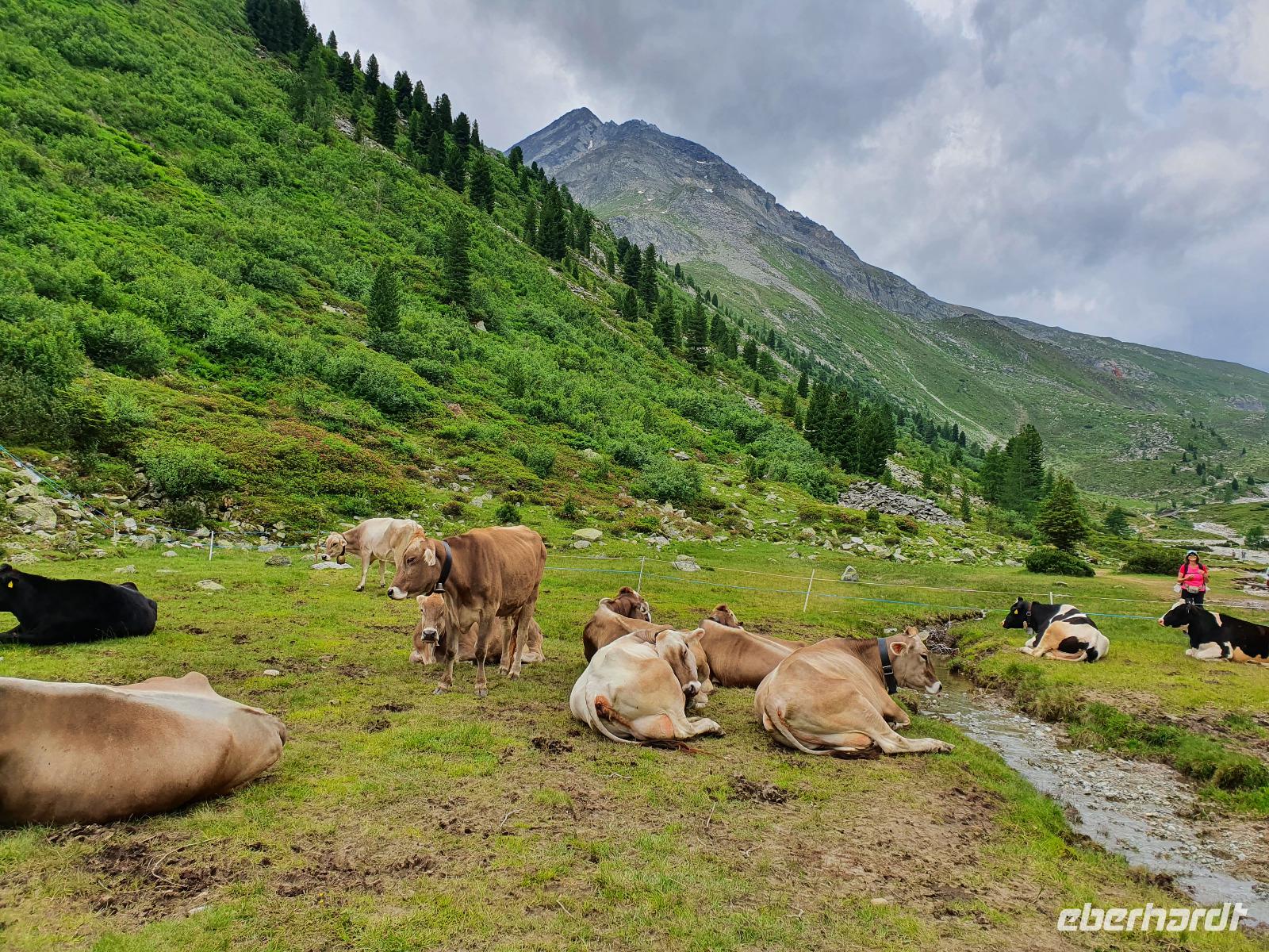 Noch einmal genossen wir das Frühstück im Hotel Maria Theresia und verabschiedeten uns dann ganz herzlich. Heute stand die Tour nach Südtirol über das Pfitscher Joch auf dem Programm und unsere 4 Nichtwanderer konnten mit dem Gepäcktransfer über das Inntal und den Brenner dorthin gelangen. Die Wanderer fuhren bis zum Wanderstartpunkt am Schlegeisspeicher auf der Mautstrasse mit 2 Taxen. Der Wetterbericht hatte Gewitter und Regen gemeldet und so starteten wir mit einem mulmigen Gefühl unseren Aufstieg. Zunächst wanderten wir an einem reissenden Bach entlang, wieder an Kühen vorbei und dann wurde der Weg steiler hinauf zur Lavitzalm. Unterwegs begann der Regen mit Sturm und wir hatten Mühe, unsere Regenkleidung anzuziehen. Wir kehrten nicht ein in der Lavitzalm sondern liefen zügig weiter zu unserem Ziel an der österreichisch-italienischen Grenze. Unterwegs liess der Regen nach und der strake Wind trocknete unsere Kleidung wieder schnell. Endlich am Grenzstein angekommen, sahen wir die Hütte auf dem Pfitscher Joch auf 2274 m Höhe, dem höchsten Punkt unserer Alpenüberquerung. Wir waren in Italien angekommen und kehrten in der Hütte ein auf ein zünftiges Mittagessen. Inzwischen hatten sich die Wolken verzogen und wir hatten gute Sicht bis hinunter ins Pfitzschtal. Der Abstieg über 850 Höhenmeter hinunter ins Tal forderte unsere volle Konzentration, weil er auf den ersten 400 Höhenmetern extrem steil verlief. Unterwegs querten wir Schneefelder, hörten die Warnpfiffe der Murmeltiere und kamen vorbei an üppig blühenden Bergwiesen. Weiter unten verlief der Weg im Wald und über Wiesen und in Stein erreichten wir die erste Gemeinde Südtirols. Es war dann noch ein Stück des Wegs bis zu den Angerer Höfen und ab dort fuhren wir mit dem Linienbus in unser Hotel Kranebitt in Kematen. Viele Alpenüberquerer übernachteten dort und unsere Gruppe bekam einen großen gemeinsamen Tisch zum Abendessen.