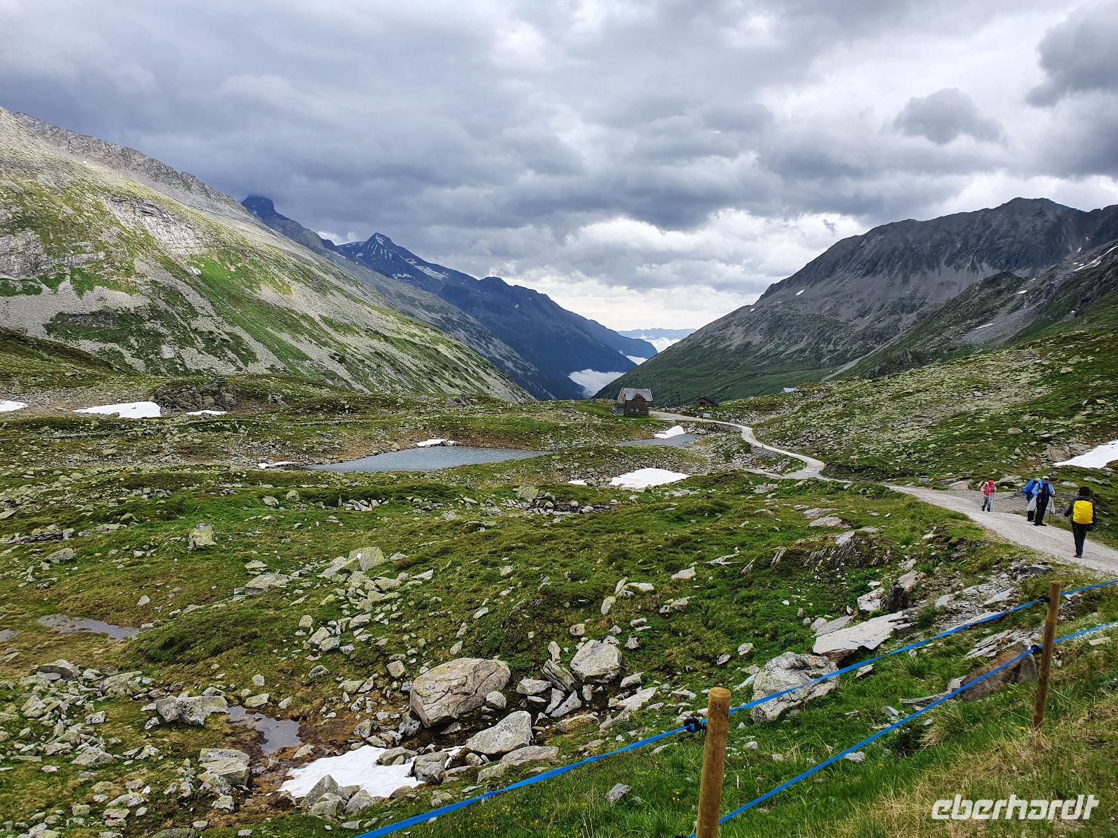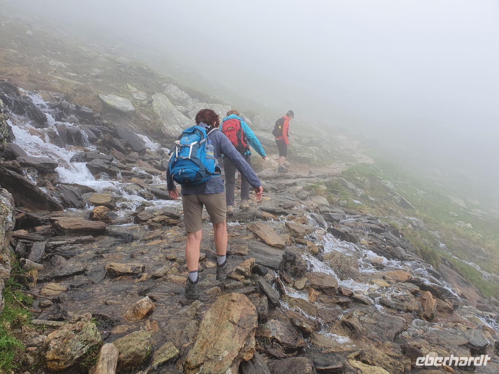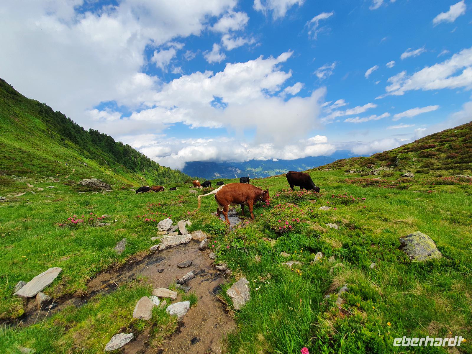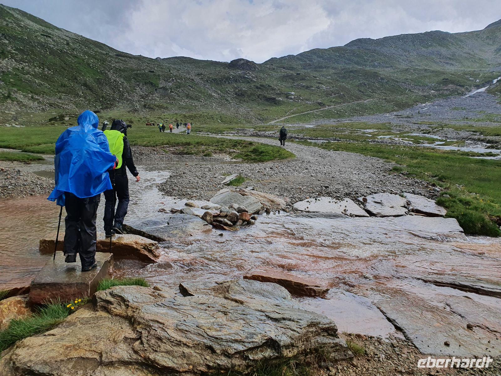 Noch einmal genossen wir das Frühstück im Hotel Maria Theresia und verabschiedeten uns dann ganz herzlich. Heute stand die Tour nach Südtirol über das Pfitscher Joch auf dem Programm und unsere 4 Nichtwanderer konnten mit dem Gepäcktransfer über das Inntal und den Brenner dorthin gelangen. Die Wanderer fuhren bis zum Wanderstartpunkt am Schlegeisspeicher auf der Mautstrasse mit 2 Taxen. Der Wetterbericht hatte Gewitter und Regen gemeldet und so starteten wir mit einem mulmigen Gefühl unseren Aufstieg. Zunächst wanderten wir an einem reissenden Bach entlang, wieder an Kühen vorbei und dann wurde der Weg steiler hinauf zur Lavitzalm. Unterwegs begann der Regen mit Sturm und wir hatten Mühe, unsere Regenkleidung anzuziehen. Wir kehrten nicht ein in der Lavitzalm sondern liefen zügig weiter zu unserem Ziel an der österreichisch-italienischen Grenze. Unterwegs liess der Regen nach und der strake Wind trocknete unsere Kleidung wieder schnell. Endlich am Grenzstein angekommen, sahen wir die Hütte auf dem Pfitscher Joch auf 2274 m Höhe, dem höchsten Punkt unserer Alpenüberquerung. Wir waren in Italien angekommen und kehrten in der Hütte ein auf ein zünftiges Mittagessen. Inzwischen hatten sich die Wolken verzogen und wir hatten gute Sicht bis hinunter ins Pfitzschtal. Der Abstieg über 850 Höhenmeter hinunter ins Tal forderte unsere volle Konzentration, weil er auf den ersten 400 Höhenmetern extrem steil verlief. Unterwegs querten wir Schneefelder, hörten die Warnpfiffe der Murmeltiere und kamen vorbei an üppig blühenden Bergwiesen. Weiter unten verlief der Weg im Wald und über Wiesen und in Stein erreichten wir die erste Gemeinde Südtirols. Es war dann noch ein Stück des Wegs bis zu den Angerer Höfen und ab dort fuhren wir mit dem Linienbus in unser Hotel Kranebitt in Kematen. Viele Alpenüberquerer übernachteten dort und unsere Gruppe bekam einen großen gemeinsamen Tisch zum Abendessen.
