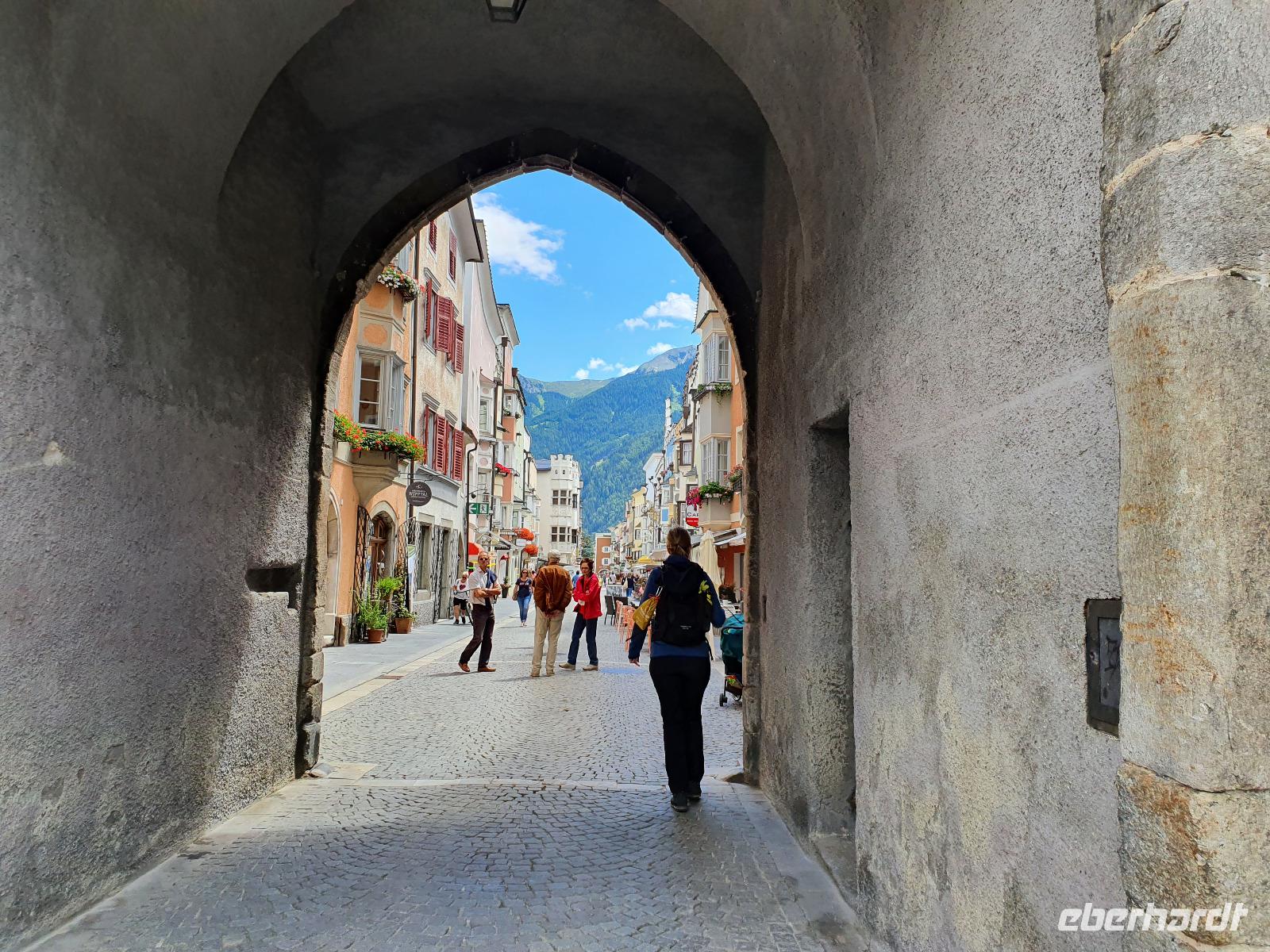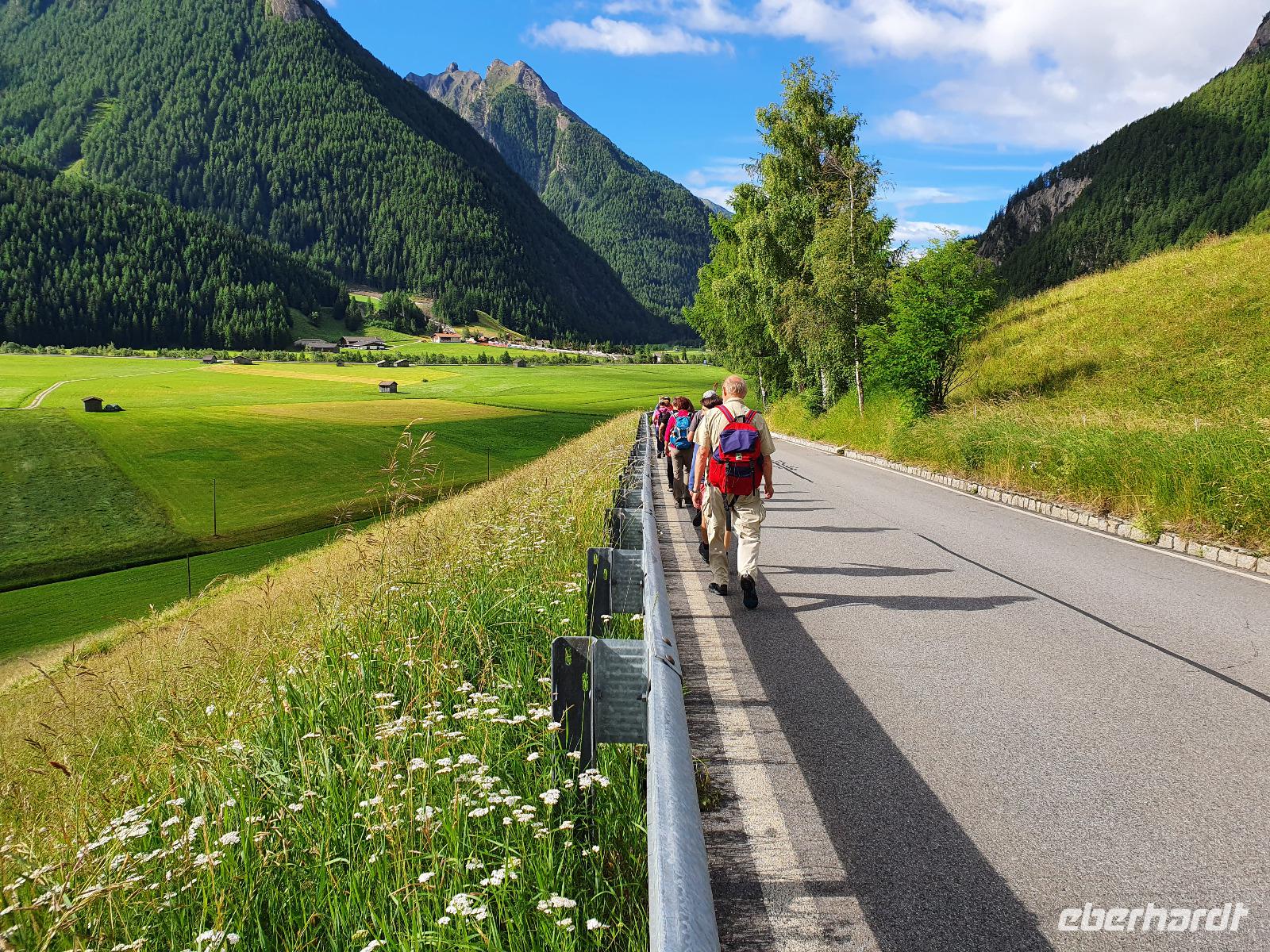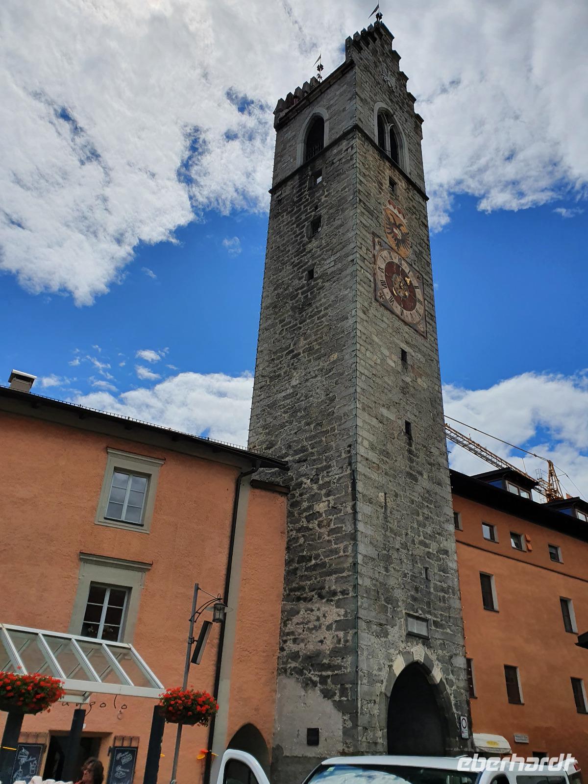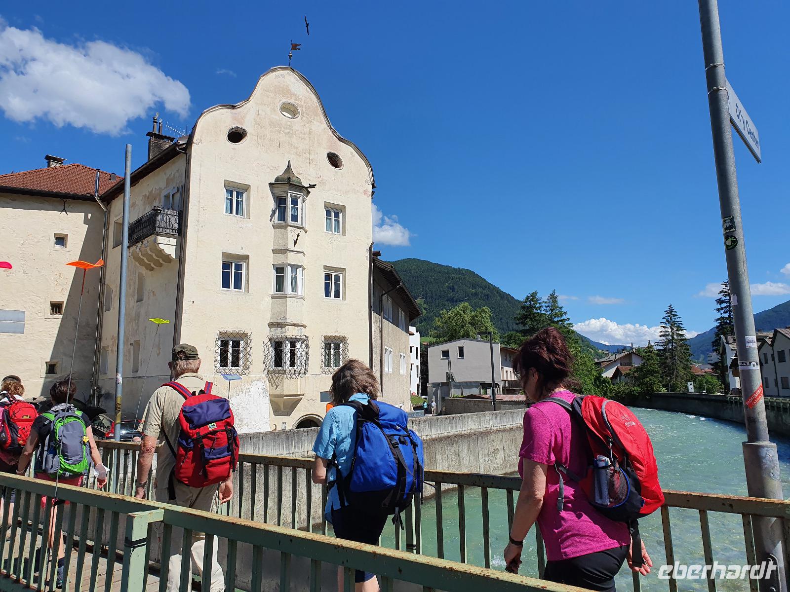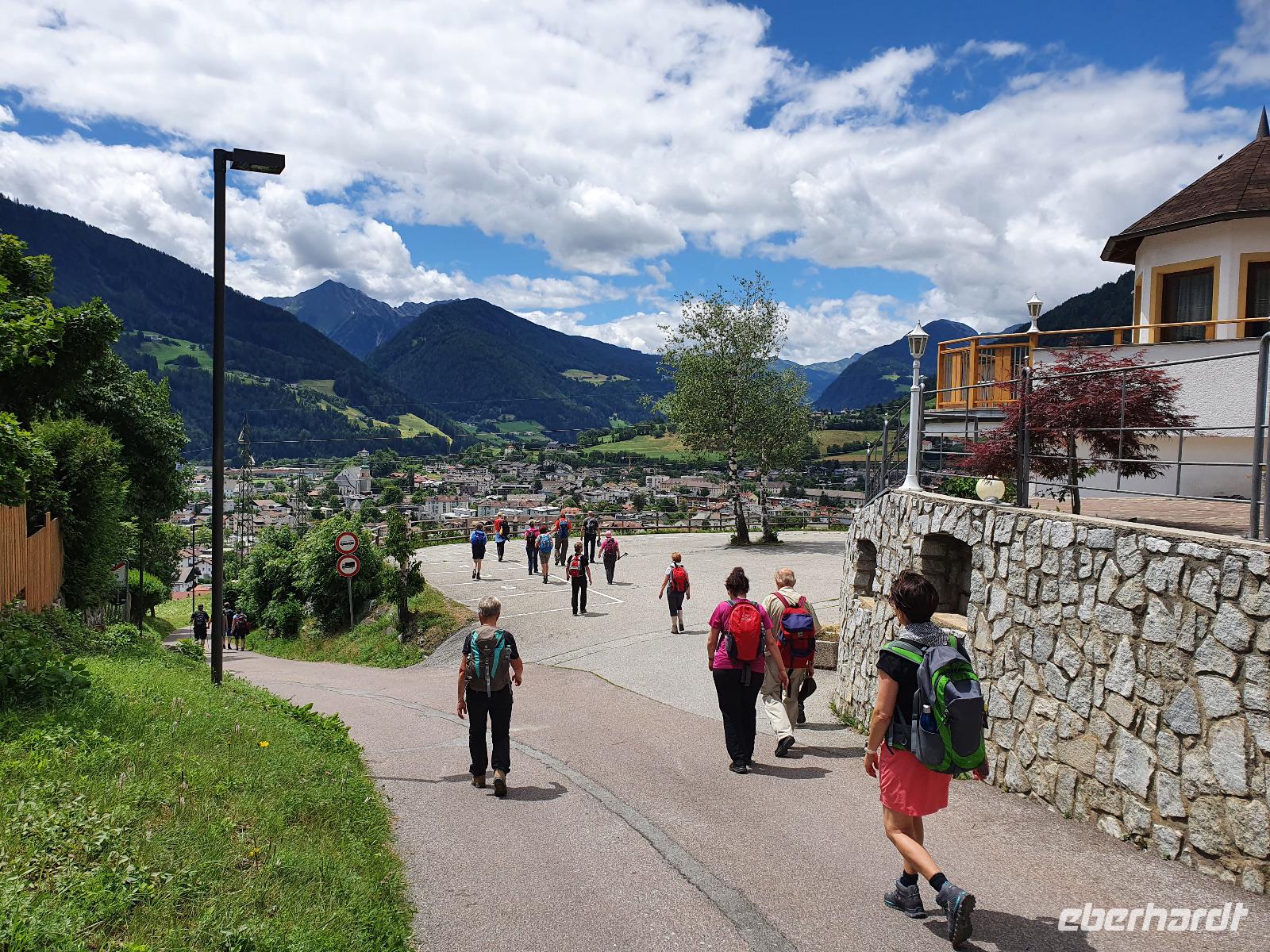 Heute zum Abschluss unserer Alpenüberquerung wanderte unsere Gruppe wieder gemeinsam. Es waren 150 Höhenmeter aufwärts und 650 Höhenmeter abwärts zu bewältigen. Aber zunächst gab es ein sehr gutes Frühstück, die Koffer wurden ein letztes Mal zur Abholung zusammen gestellt und wir starteten bei nur 10 Grad unsere Wanderung. Der Weg verlief teils durch die Dörfer, dann aber auch an der Hauptstrasse entlang und immer leicht bergab. Der Blick zurück zeigte uns noch einmal den Alpenhauptkamm, den wir tags zuvor überquert hatten. Wir passierten eine tiefe Schlucht, sahen riesige Türkenbundlilien und dann erschien in der Ferne Flains, ein Ort direkt vor Sterzing. Vorbei an Kirchen, ehemaligen Burgen erreichten wir Flains und sahen wie von einem Balkon auf Sterzing. Nun ging es nur noch steil bergab, unter den Bahnschienen hindurch und über den Eisack und schon standen wir vor dem Zwölferturm in Sterzing. Es war geschafft, wir hatten die Alpen von Deutschland über Österreich nach Italien überquert. An der Touristinformation holten wir den letzten Stempel für unser Stempelheft und das wurde anschliessend gefeiert. Es gab einen Hugo für jeden und wir stiessen auf den erfolgreichen Abschluss unserer Tour an und ich war glücklich, daß alle Gäste wohlbehalten in Sterzing angekommen waren. Nach etwas Freizeit liefen wir hinauf zu unserem Hotel Sonnenheim und jeder freute sich auf das Abendessen. Danach sassen wir noch zusammen und liessen die Alpenüberquerung Revue passieren. Was hatten wir doch für ein Glück mit dem Wetter !