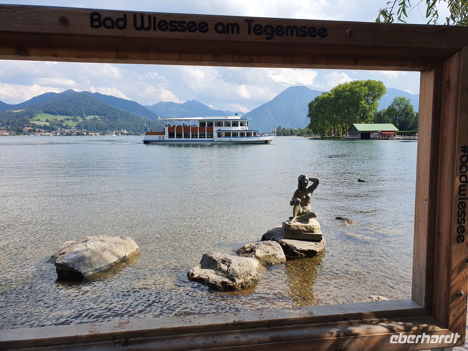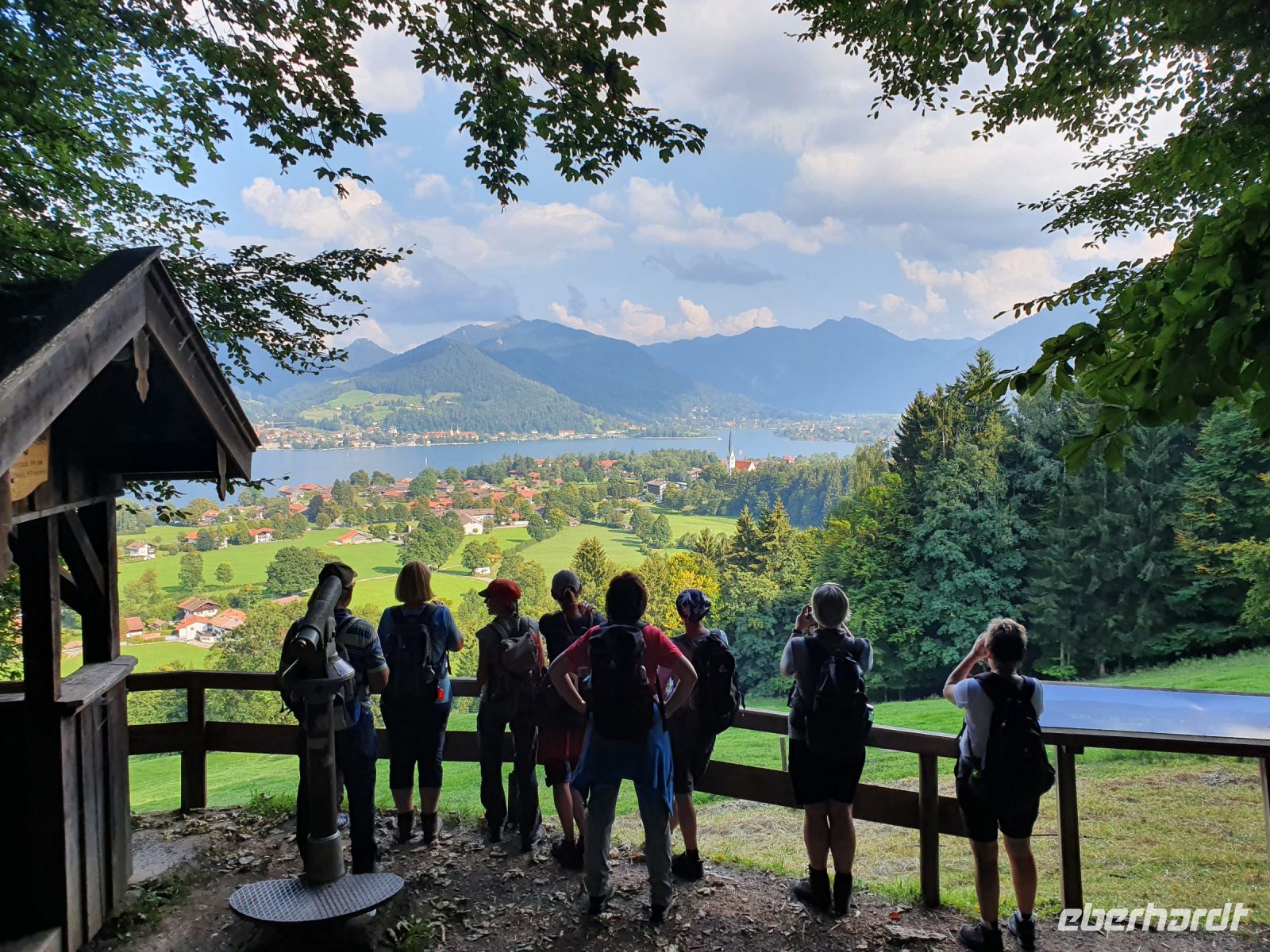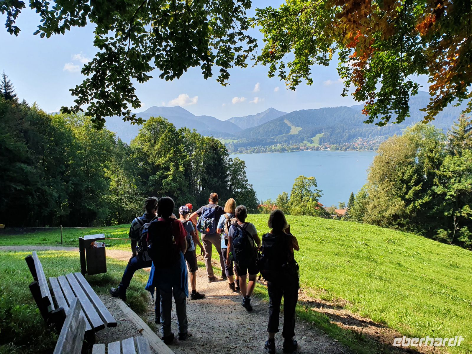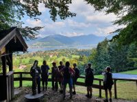 Nach einem sehr guten Frühstück trafen wir uns alle an der Bushaltestelle gegenüber von unserem Hotel und fuhren nach Gmund zum Bahnhof. Dort war der offizielle Beginn unserer Alpenüberquerung und so wurden viele Fotos geschossen. Dann ging es los, durch die Gassen von Gmund, über die Mangfall, den einzigen Abfluss des Tegernsees, und weiter immer am Seeufer entlang. Wir querten die Hauptstrasse und liefen über Wiesen steil nach oben zum Tegernseer Höhenweg. Dort waren viele Wanderer unterwegs und wir genossen die herrlichen Ausblicke über den See hinüber nach Bad Wiessee. Steil ging es dann hinunter nach Tegernsee, vorbei am Rathaus zum historischen Bräustüberl. Für Alpenüberquerer ist die Mittagspause dort ein Muss und obendrein gab es den ersten Stempel fürs Stempelheft. Nach der Mittagspause wanderten wir weiter immer am Ufer des Tegernsees entlang bis nach Rottach Egern zum Hotel Überfahrt und dort nahmen wir das Schiff über den Tegernsee zurück nach Bad Wiessee. Nach einer Pause in der italienischen Eisdiele wanderten wir hinauf zum Freihaus Brenner und oben weiter bis zum Aussichtspunkt Prinzenruh. Bad Wiessee und unser Hotel lagen uns zu Füssen und der Blick über den Tegernsee entschädigte für die steilen Wege. Zum Abendessen gingen wir in die "Königslinde", ein traditionelles Lokal mit Biergarten am See. Wir wählten unsere Gerichte aus der Speisekarte und bis zum Hauptgang hielt das Wetter auch aus. Dann kam der angesagte Gewitterregen und so flüchteten wir nach drin für Nachtisch und Espresso.