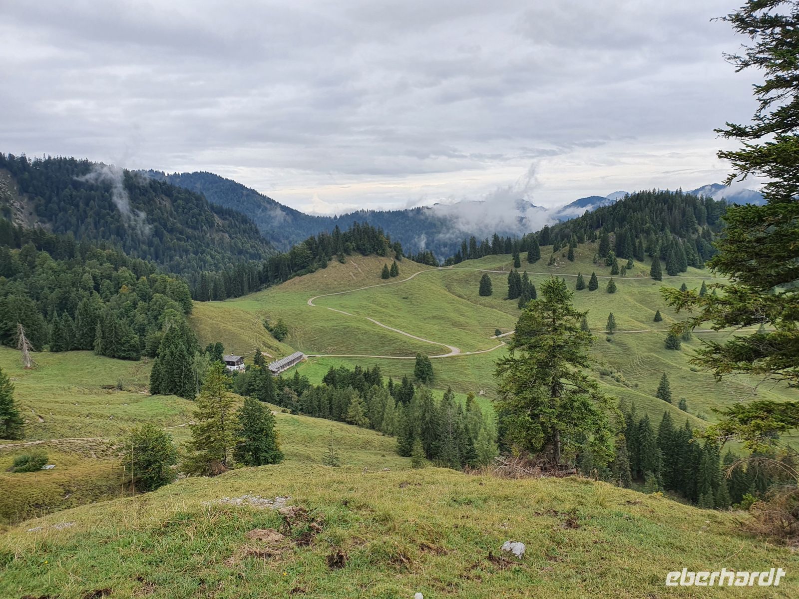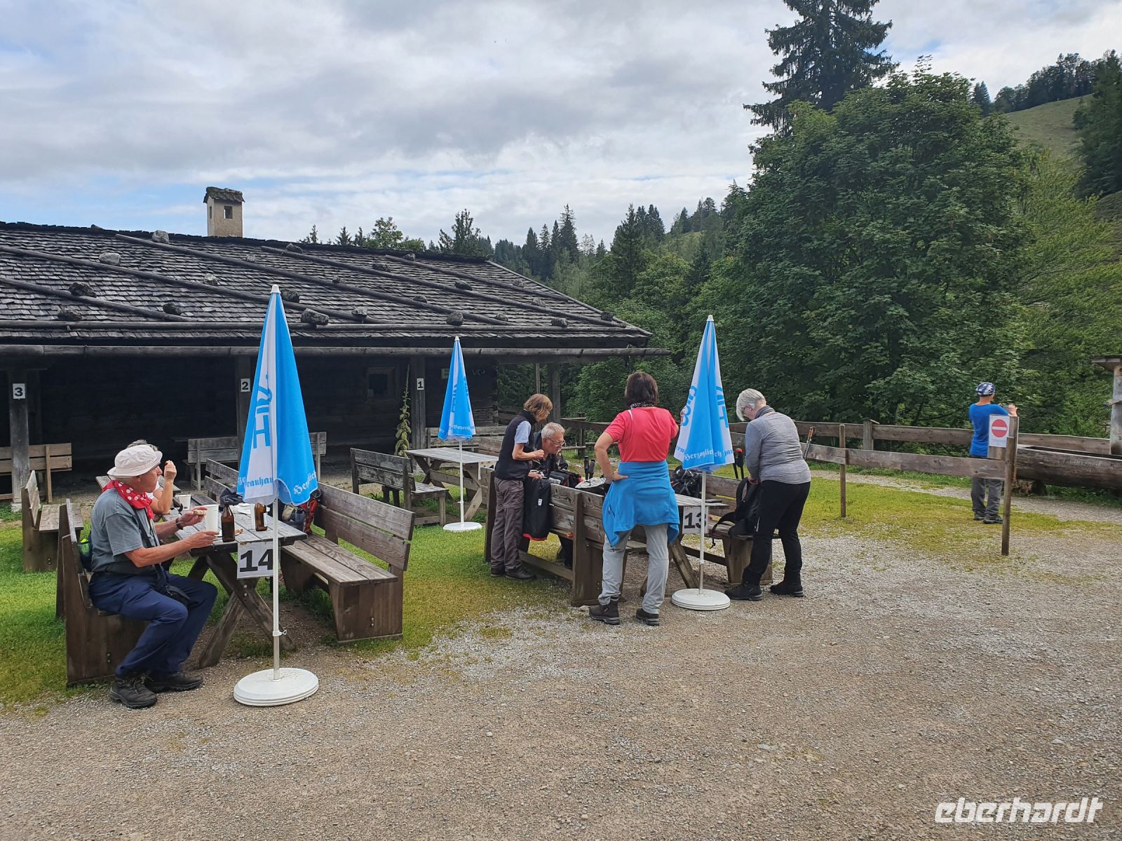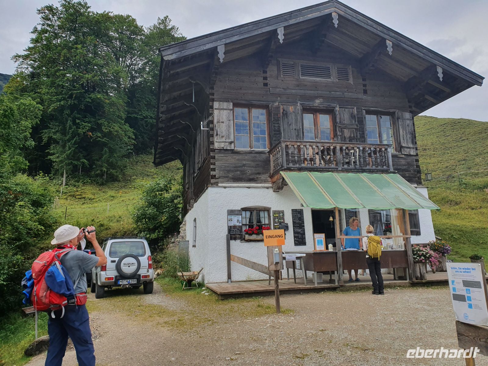 Heute nun stand die erste große Tour unserer Alpenüberquerung an. Die Koffer stellten wir ein und mit 2 Taxis fuhren wir nach Wildbad Kreuth zum Parkplatz Klamm. Dort begannen wir unsere Wanderung über die Weltmeister Rodelbahn hinauf zur Königsalm auf 1115 m Höhe. An der Alm gibt es Stallungen aus dem 18.Jahrhundert und das Kavaliershaus - heutiges Almgebäude - wurde unter Kaiser Maximilian I. errichtet im 19.Jahrhundert. Wir gönnten uns eine Pause, aßen und tranken etwas und nutzten die schicken WCs. Danach ging es steil bergan bis zum Graseck und dort erreichten wir den viel begangenen Weg zur Blaubergalm. Bis zum Sattel waren immer wieder steile, steinige Passagen zu überwinden und oben dann endlich kam der Schildenstein in Sicht. Er gehört nicht zum Programm der Alpenüberquerung, wir aber machten diesen "Abstecher" auf 1611 m Höhe. Der traumhafte Ausblick entschädigte für den steilen Weg. Wieder unten am Hauptweg gingen wir leicht auf und ab am Hang entlang und erreichten bald die Grenze zu Österreich. Danach folgte ein kurzer, steiler Anstieg zur Blaubergalm und auf der Terrasse liessen wir uns die Leckereien von der Hüttenwirtin schmecken. Zur Unterhaltung konnten wir ein Murmeltier ganz aus der Nähe am Hang beobachten. Gut gestärkt nahmen wir dann den langen Abstieg in Angriff, lernten einiges über die Zirbe, sahen die Vorbereitungen zu einer Feuerwehrübung und erreichten nach 2 Stunden das Tal bei Achenwald. Dort holten uns 2 Taxis ab und brachten uns zum Hotel Fischerwirt in Achenkirch. Unser Abendessen nahmen wir im Hotelrestaurant ein und waren glücklich, dass wir die erste große Etappe so erfolgreich geschafft hatten.