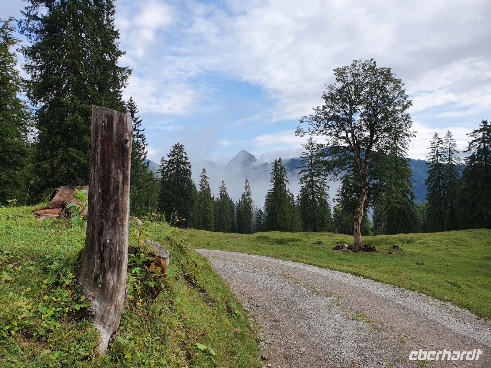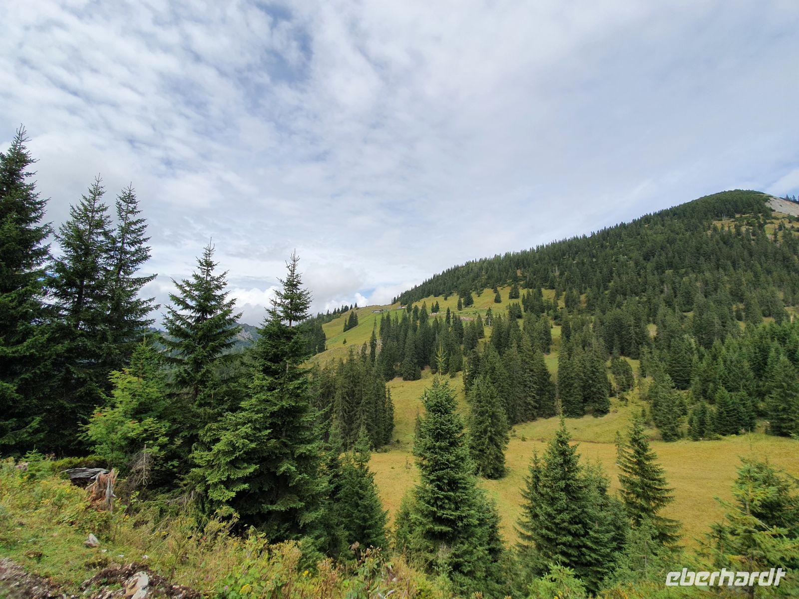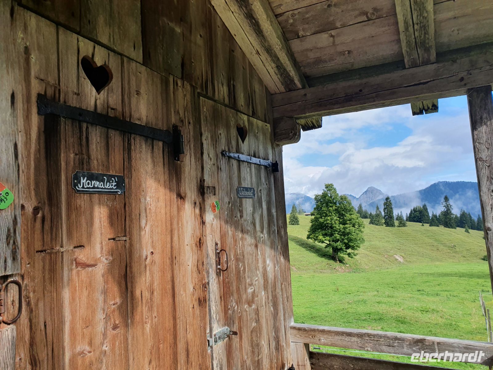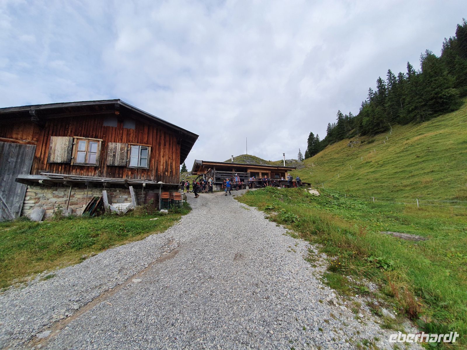 Heute nun stand die erste große Tour unserer Alpenüberquerung an. Die Koffer stellten wir ein und mit 2 Taxis fuhren wir nach Wildbad Kreuth zum Parkplatz Klamm. Dort begannen wir unsere Wanderung über die Weltmeister Rodelbahn hinauf zur Königsalm auf 1115 m Höhe. An der Alm gibt es Stallungen aus dem 18.Jahrhundert und das Kavaliershaus - heutiges Almgebäude - wurde unter Kaiser Maximilian I. errichtet im 19.Jahrhundert. Wir gönnten uns eine Pause, aßen und tranken etwas und nutzten die schicken WCs. Danach ging es steil bergan bis zum Graseck und dort erreichten wir den viel begangenen Weg zur Blaubergalm. Bis zum Sattel waren immer wieder steile, steinige Passagen zu überwinden und oben dann endlich kam der Schildenstein in Sicht. Er gehört nicht zum Programm der Alpenüberquerung, wir aber machten diesen "Abstecher" auf 1611 m Höhe. Der traumhafte Ausblick entschädigte für den steilen Weg. Wieder unten am Hauptweg gingen wir leicht auf und ab am Hang entlang und erreichten bald die Grenze zu Österreich. Danach folgte ein kurzer, steiler Anstieg zur Blaubergalm und auf der Terrasse liessen wir uns die Leckereien von der Hüttenwirtin schmecken. Zur Unterhaltung konnten wir ein Murmeltier ganz aus der Nähe am Hang beobachten. Gut gestärkt nahmen wir dann den langen Abstieg in Angriff, lernten einiges über die Zirbe, sahen die Vorbereitungen zu einer Feuerwehrübung und erreichten nach 2 Stunden das Tal bei Achenwald. Dort holten uns 2 Taxis ab und brachten uns zum Hotel Fischerwirt in Achenkirch. Unser Abendessen nahmen wir im Hotelrestaurant ein und waren glücklich, dass wir die erste große Etappe so erfolgreich geschafft hatten.